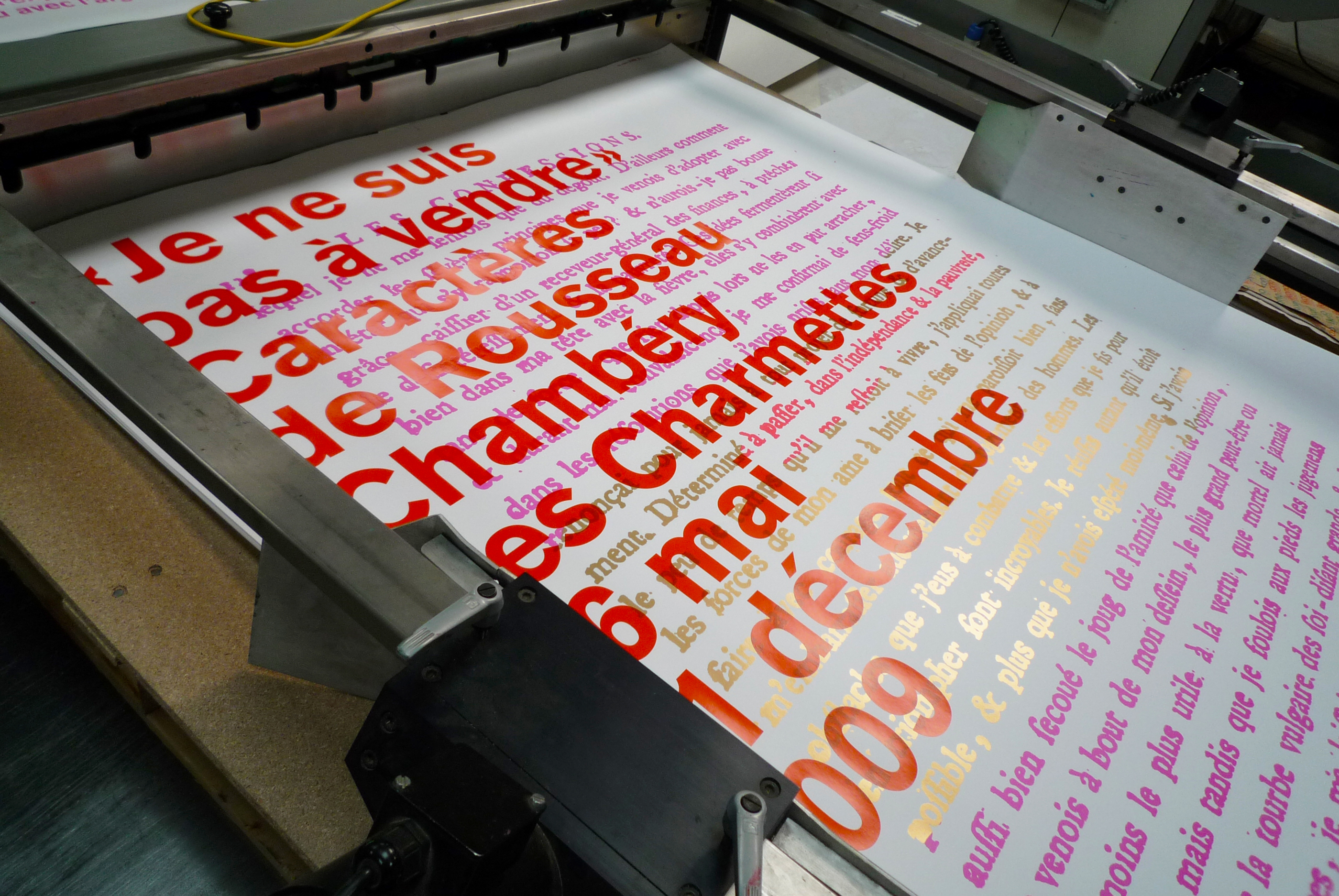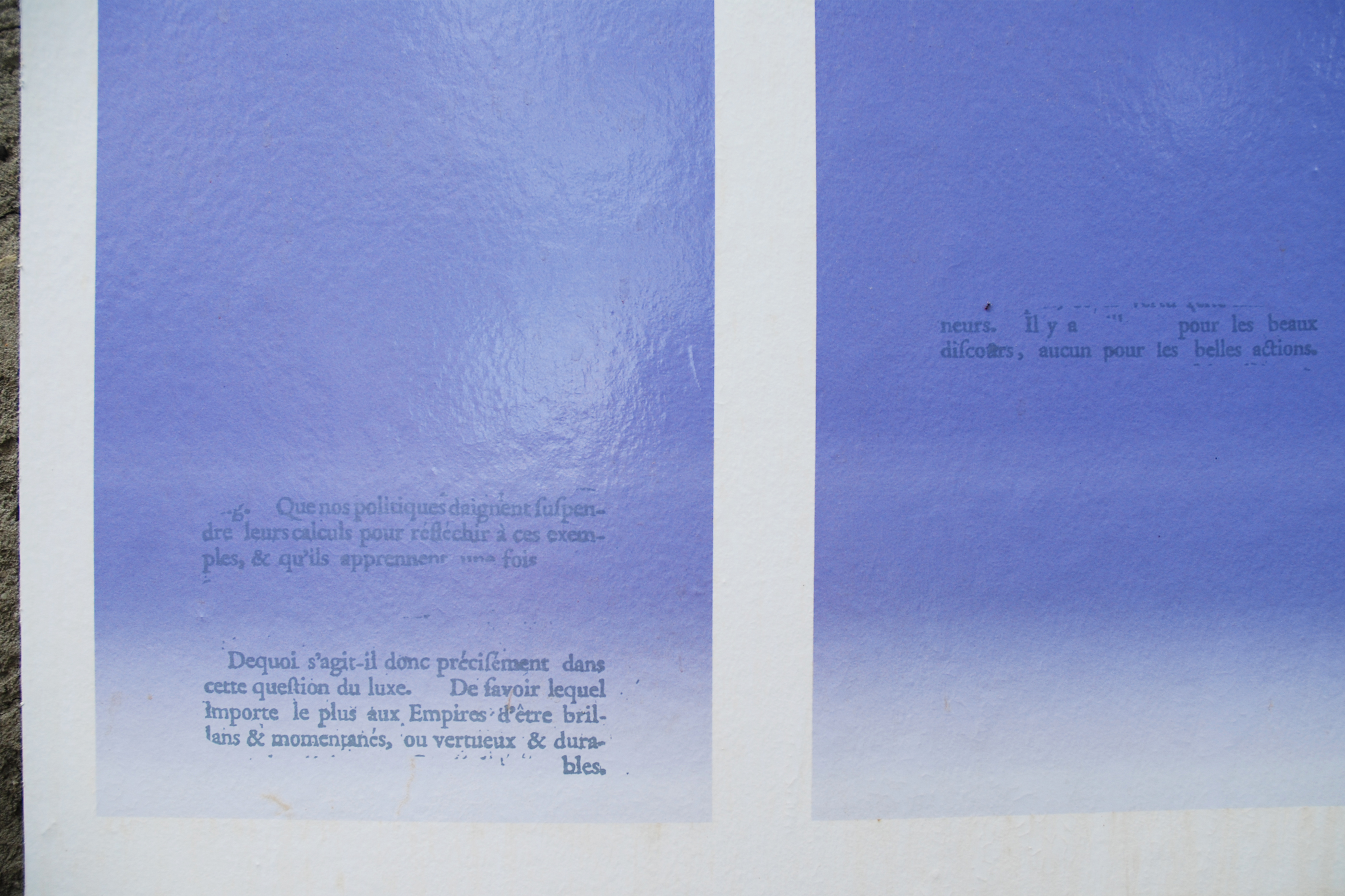The exhibition presenting Rousseau’s relationship to money was articulated around 4 large format posters with had both side showing, allowing the visitors to rotate around them. I selected a warmer color palette to symbolize his relationship with money, and a colder one for his philosophical thoughts. These posters reference the page of a book, the essence of a text, breaking the conventional museum’s codes. Rousseau’s quotations are extracted from eighteenth century facsimiles: these authentic worn off typefaces allow us to contextualize his thoughts (in his work, and his time). Color helped hierarchize the different speech levels, which allow us to grasp the content via different angles. Some of these posters were overprinted with practical info in order to spread excerpts of the exhibition in the city. Others were used as typographical templates in order to write money related anagrams: the word BRILLE [shine] was displayed in the garden, and the word LIBRE [free] was placed leaning on the house. These unique letters, made from the facsimile’s layout, were overprinted with a mixture of metallic inks. In substance, the layers of ink are never complete (like maculas), and offer a poetic vision on this scientific content.