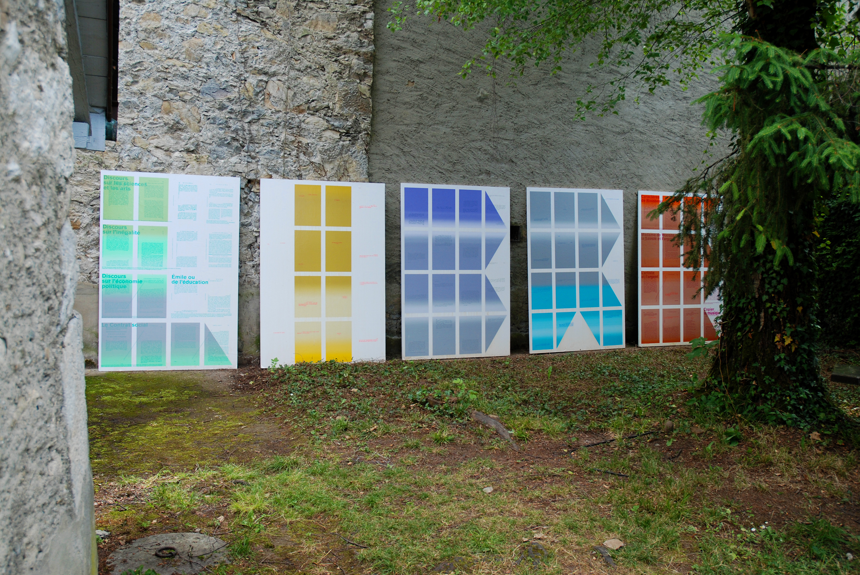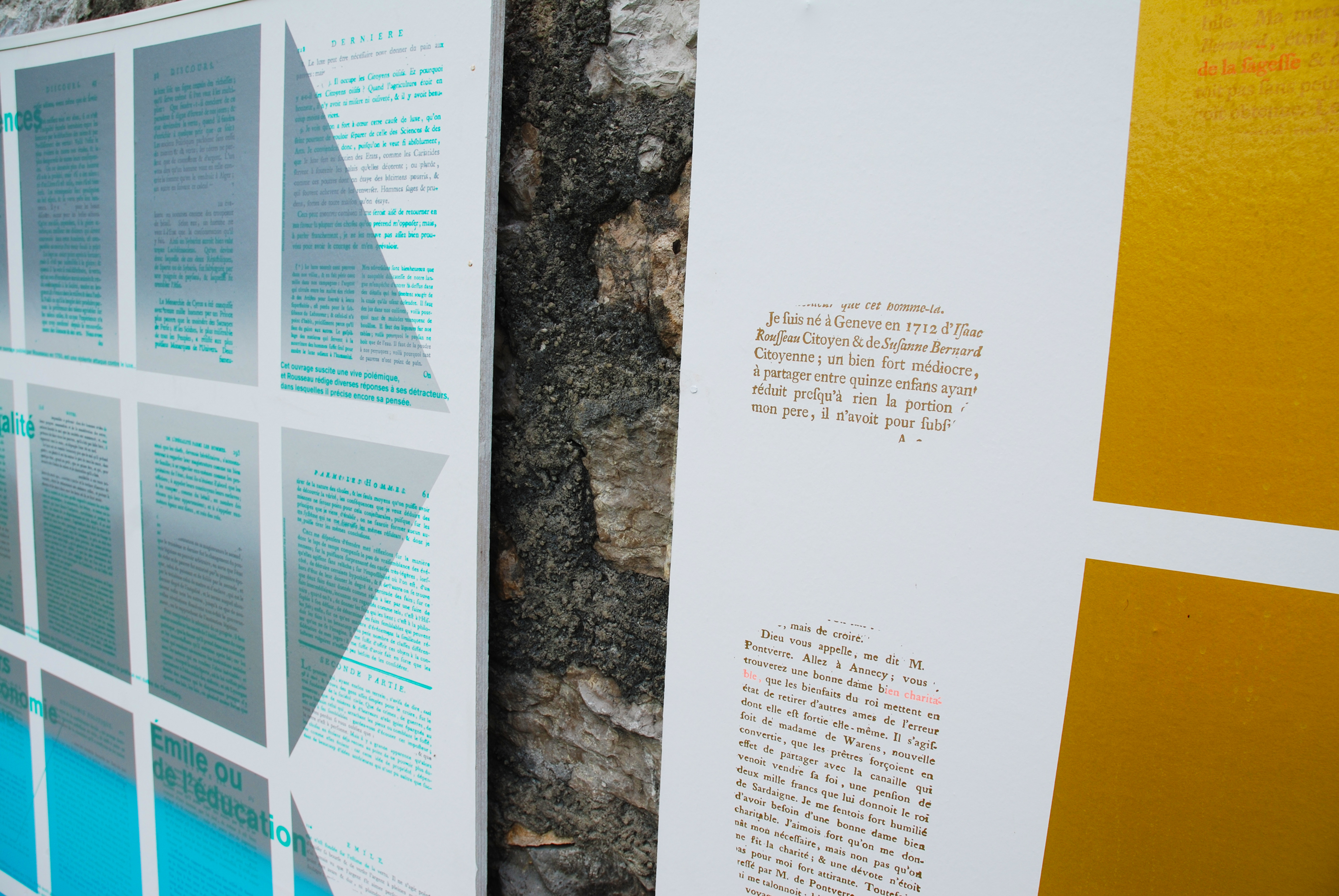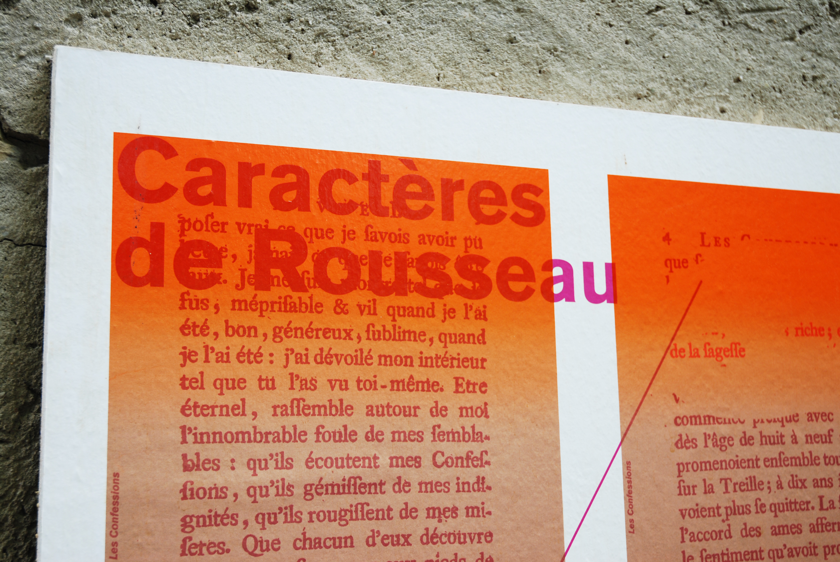 L’exposition Je ne suis pas à vendre, consacrée au rapport de Rousseau avec l’argent est constituée de 4 affiches format Decaux, présentées recto/verso, autour desquelles les visiteurs peuvent tourner. Une gamme colorée chaude a été choisie pour ses rapports personnels avec l’argent, et gamme froide pour sa pensée philosophique. Ces affiches renvoient à la page de livre, à l’essence du texte, en rupture avec les codes de la muséographie conventionnelle. Les citations de Rousseau sont extraites de fac-similés du dix-huitième siècle: ces «caractères originaux» permettent de contextualiser sa pensée (dans ses œuvres, et dans son époque), dans l’usure réelle des caractères. Les niveaux de discours sont matérialisés par la couleur, qui permettent ainsi d’appréhender le contenu par différents biais. Certains modèles d’affiches d’exposition ont été surimprimés pour constituer les affiches de communication, diffusant ainsi des extraits de l’exposition dans la ville. D’autres ont été réutilisées en tant que matrices typographiques pour écrire des anagrammes liées à l’argent: le mot BRILLE placé dans le jardin, et le mot LIBRE en appui sur la maison. Ces lettres uniques, faites à partir du plan des fac-similés, ont été surimprimées avec des mélanges d’encres colorées métalliques. En fond, les couches encrées ne sont jamais au complet (à la manière de macules), et offrent un regard poétique sur le contenu scientifique.