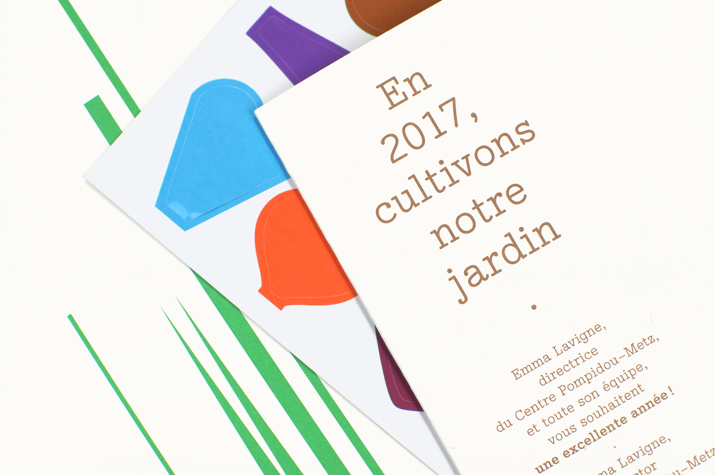 Cette carte de vœux, envoyée sous la forme d’un carton dans lequel se glisse une planche de pétales autocollants brillants et colorés, invitait les destinataires à composer un paysage.