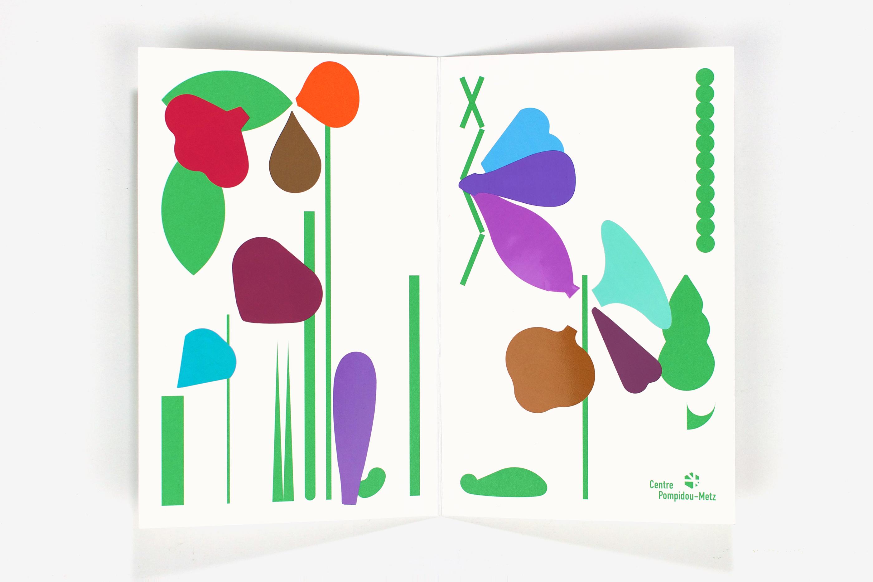 This New Year’s greetings card, consisting of a folder containing a sheet of stickers of brightly coloured petals, was designed to allow the recipients to create their own landscapes.