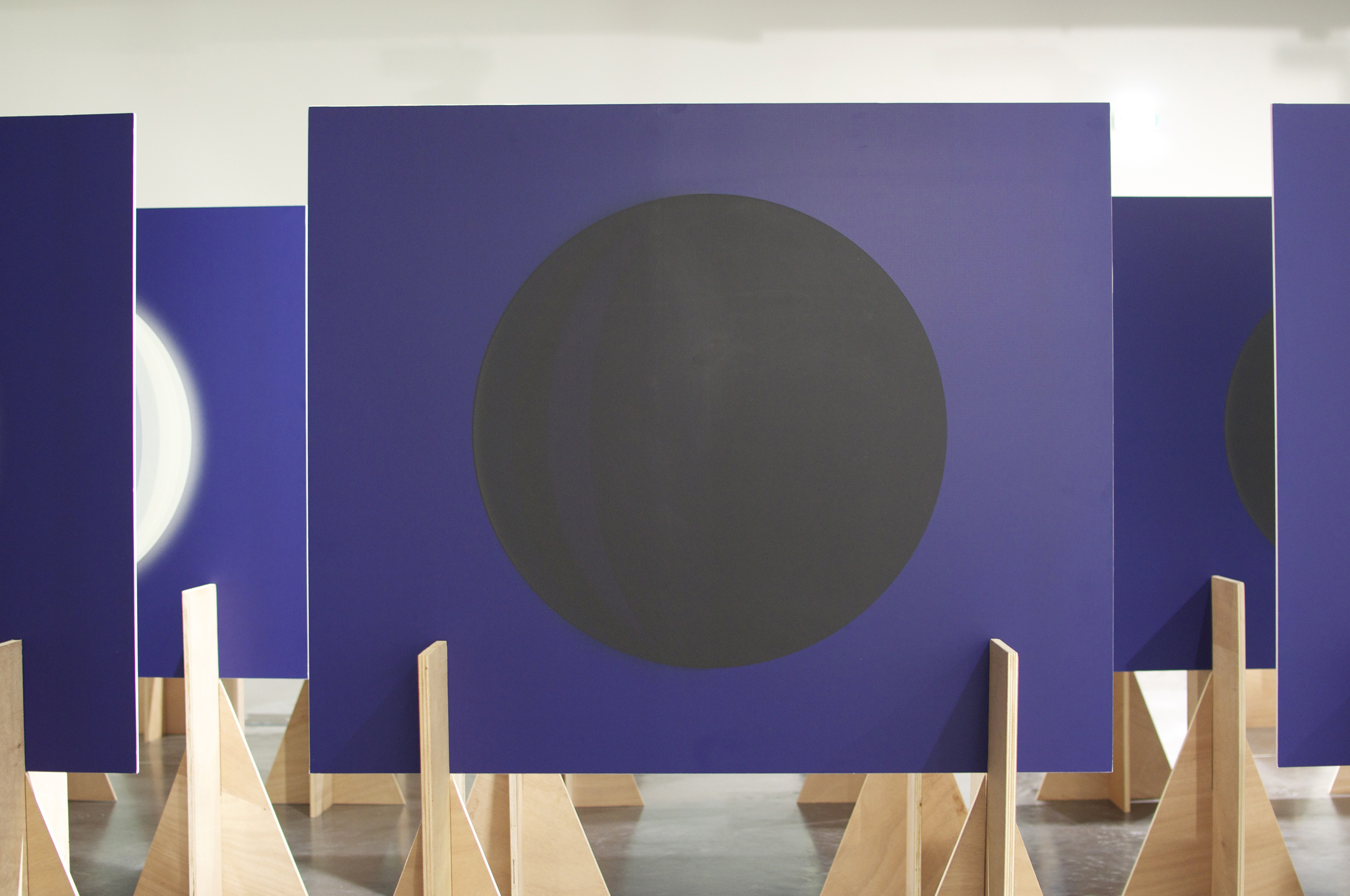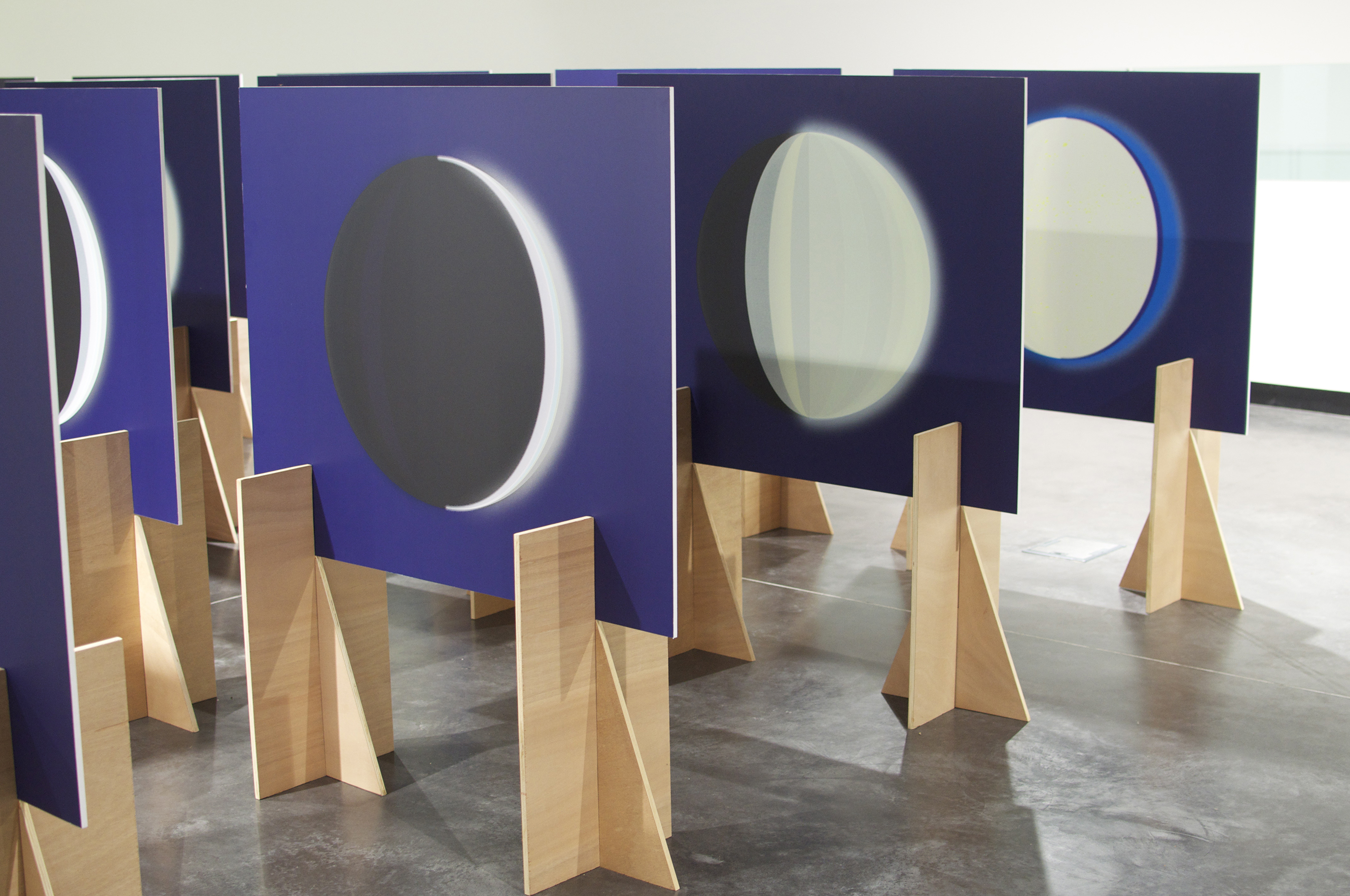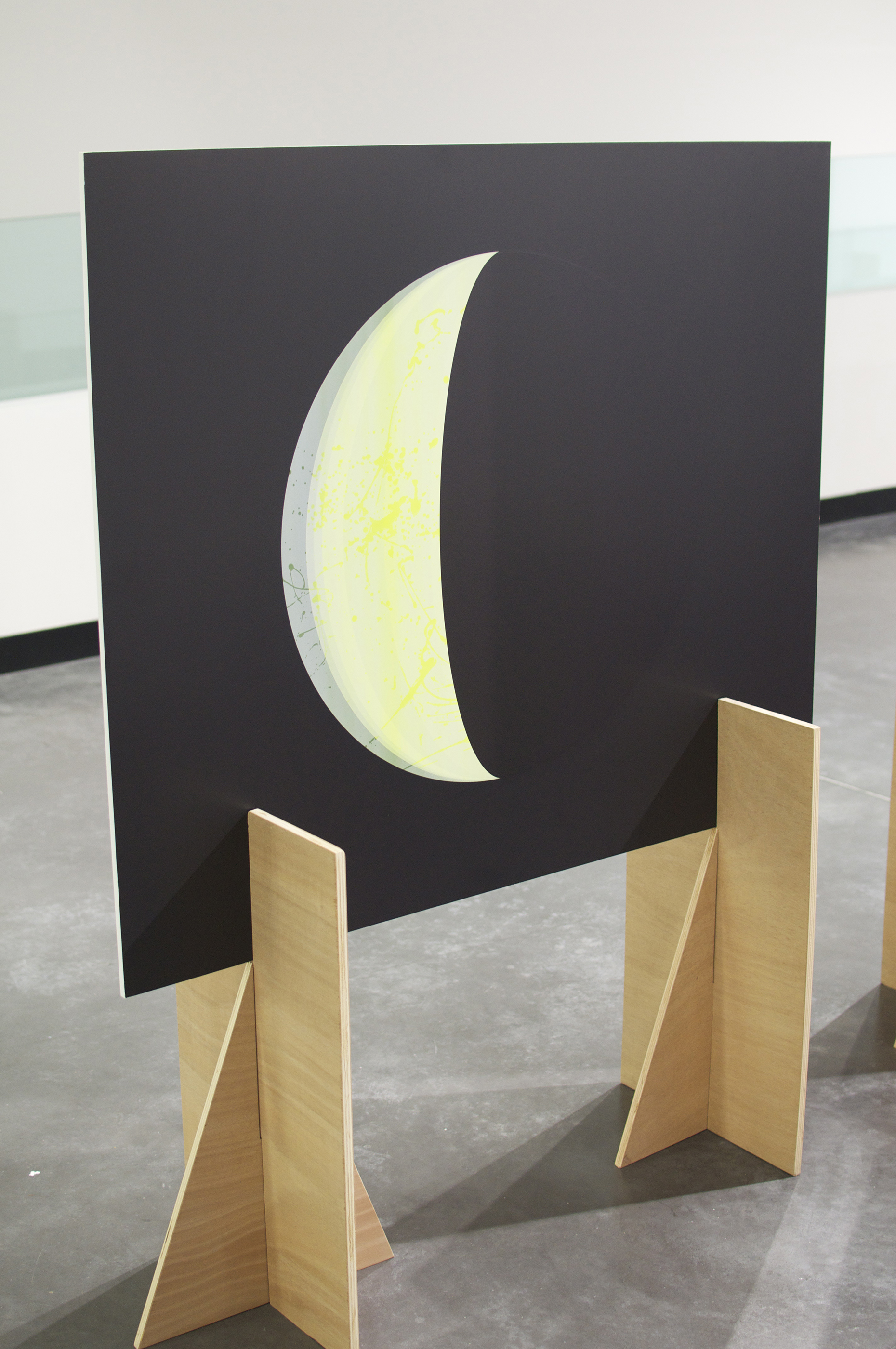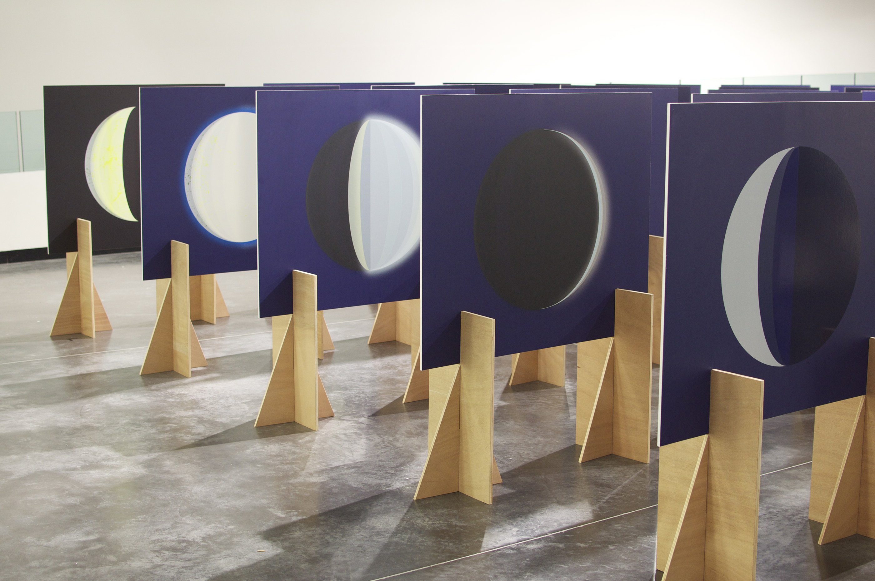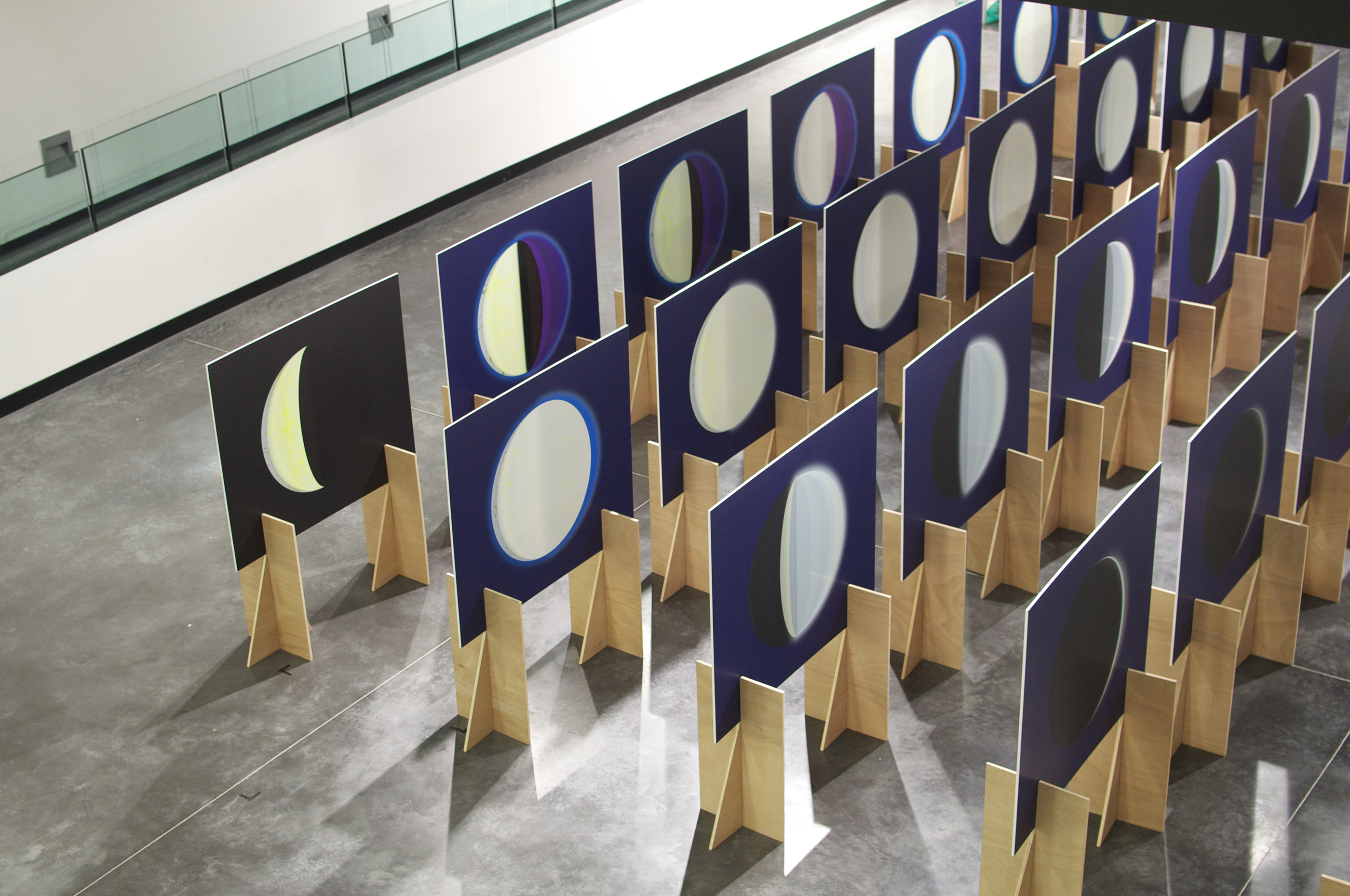 L’exposition présente un cycle lunaire en sérigraphie, dans lequel chaque lune est surimprimée à la précédente. Ainsi, au début du cycle, la lune est formée d’une seule couche de couleur. À la fin du cycle, la lune est surimprimée aux 30 couches précédentes. Les aléas colorés, les jeux d’opacité, la sensualité des encres et les coulures aléatoires ont dicté l’évolution du cycle. L’expérimentation de la plasticité sérigraphique est au cœur du projet. La thématique se situe à mi-chemin entre science et pure poésie: sa matérialisation oscille entre contrainte technique et expérimentation. La scénographie prend en compte cette dimension didactique et rêveuse, avec la création d’un mobilier original du scénographe Grégoire Romanet. Les lunes, enchâssées dans un support en bois et disposées selon la logique calendaire, ont été mises à l’horizontale au fil des jours. À la fin de l’exposition, l’ensemble compose une immense planche didactique. La question de la déambulation est au cœur de ce dispositif scénographique.