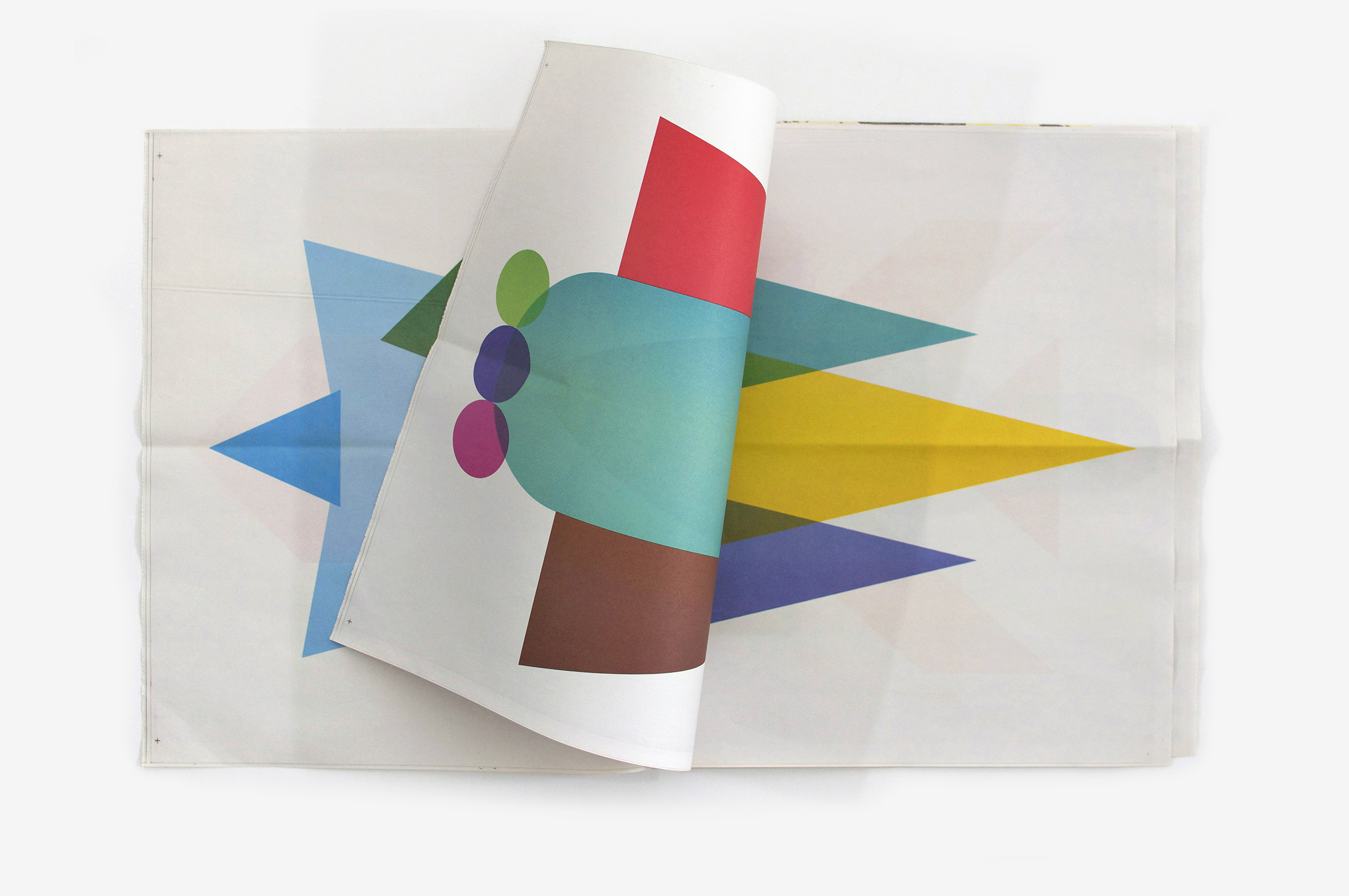 Decollo is a newspaper: It has the appropriate size, smell and materials. Each double page features a rocket, which stretches horizontally, left to right, split in half by the v-center fold. The newspaper’s pages can then be rearranged and folded indefinitely to create unusual combinations, like a visual cadavre exquis. The rockets are carriers of dreams and visions of the future, like a potential tool. They exist on the edge of abstraction, simply reclining shapes and colors.