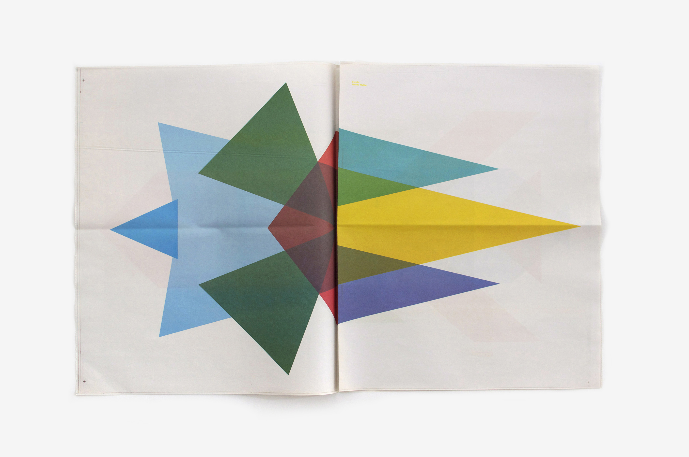 Decollo est un journal: il en a le format, l’odeur et la matière. Chaque double page comprend une fusée, à l’horizontale, dont la forme est rompue par le pli central. Les pages du journal peuvent ainsi être réagencées et repliées indéfiniment pour créer des combinaisons insolites, à la manière d’un cadavre exquis visuel. Les fusées sont porteuses de rêves et de projection, comme un outil potentiel. Elles restent ici à la lisière de l’abstraction, simple imbrication de formes et de couleurs.