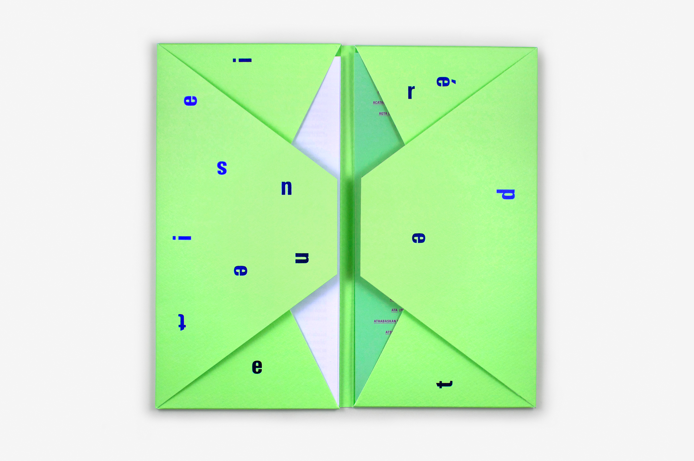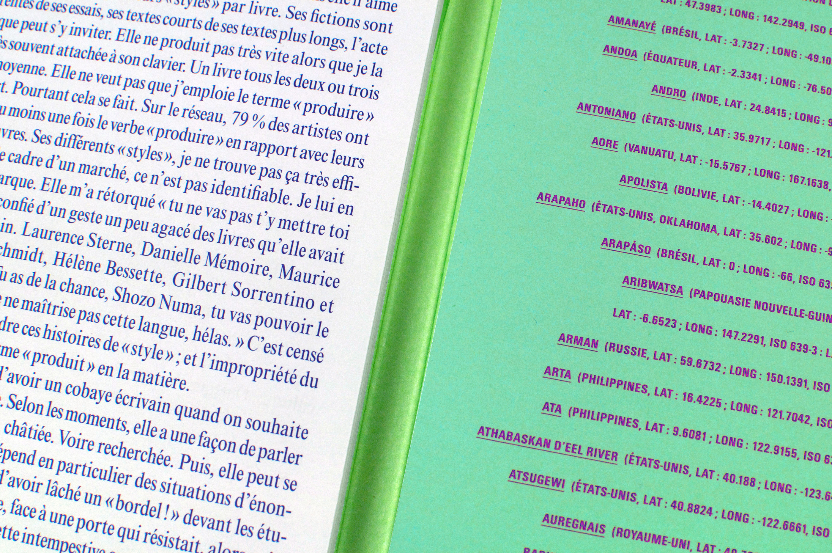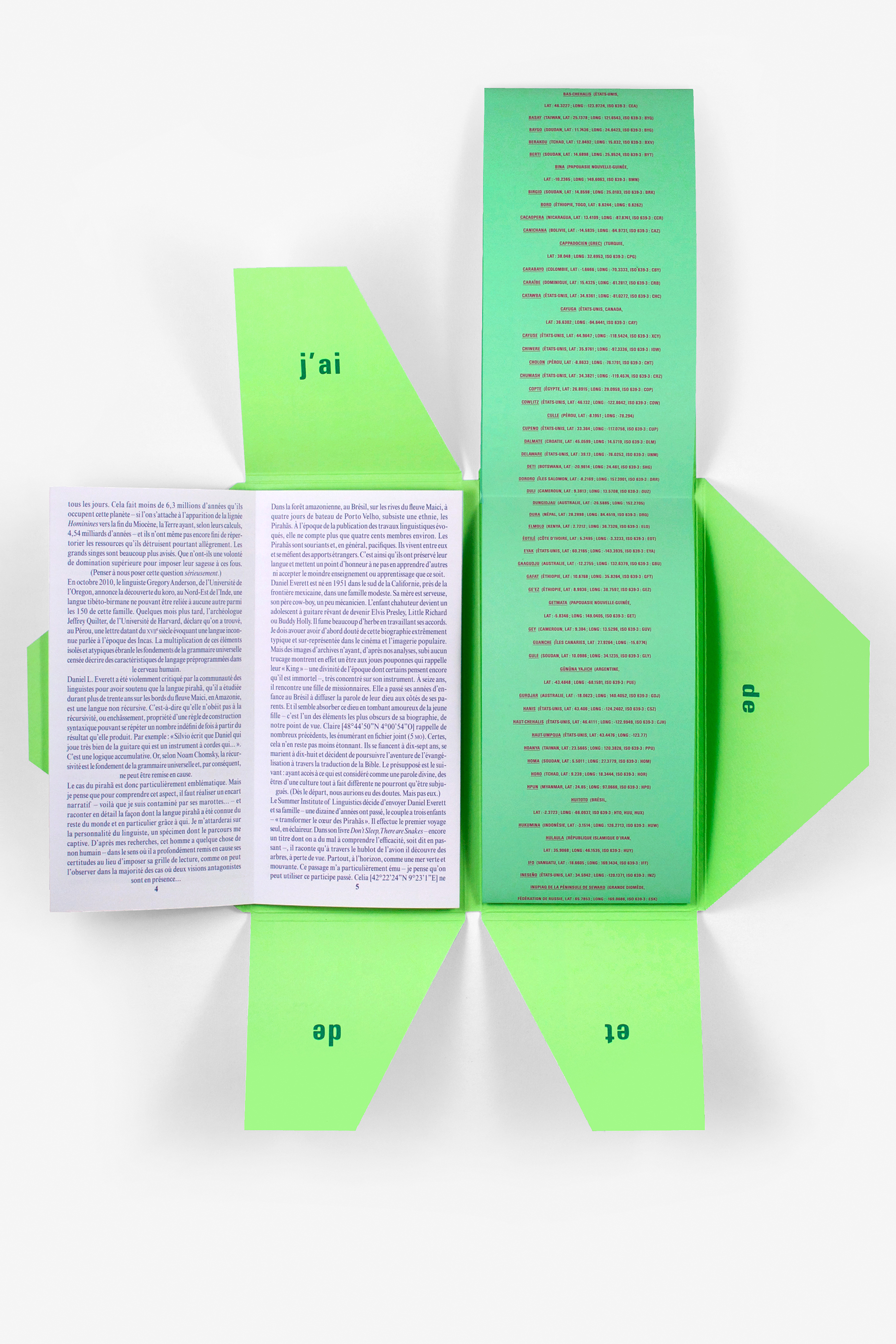 In this text written by Laure Limongi, humans coexist with intelligent androids. One of these, Silvio, through contact with a woman who seems to be a double of the writer, decides to memorise the existing data on extinct languages, to save those languages on the road to extinction and also to create a language… As if to echo this story, this book is not bound. It takes substance, nevertheless, from the magic of its folds, folded and unfolded, and can be opened up in space. It invites us to a different kind of reading, resistance reading. In loudly proclaiming its iconoclastic materiality, it gives echo to languages that are disappearing. The six flaps of the covering jacket prompt a game of composition/decomposition with the mysterious title of the book. The body of the book (the inner pages) is a concertina-like horizontal leaflet, the text laid out on a zigzag pagination. A list of recently extinct languages is given as an appendix. Arranged on a vertical concertina leaflet the list can be viewed as a continuous loop… The whole book can be flattened out and then reconstructed, like a potential space.