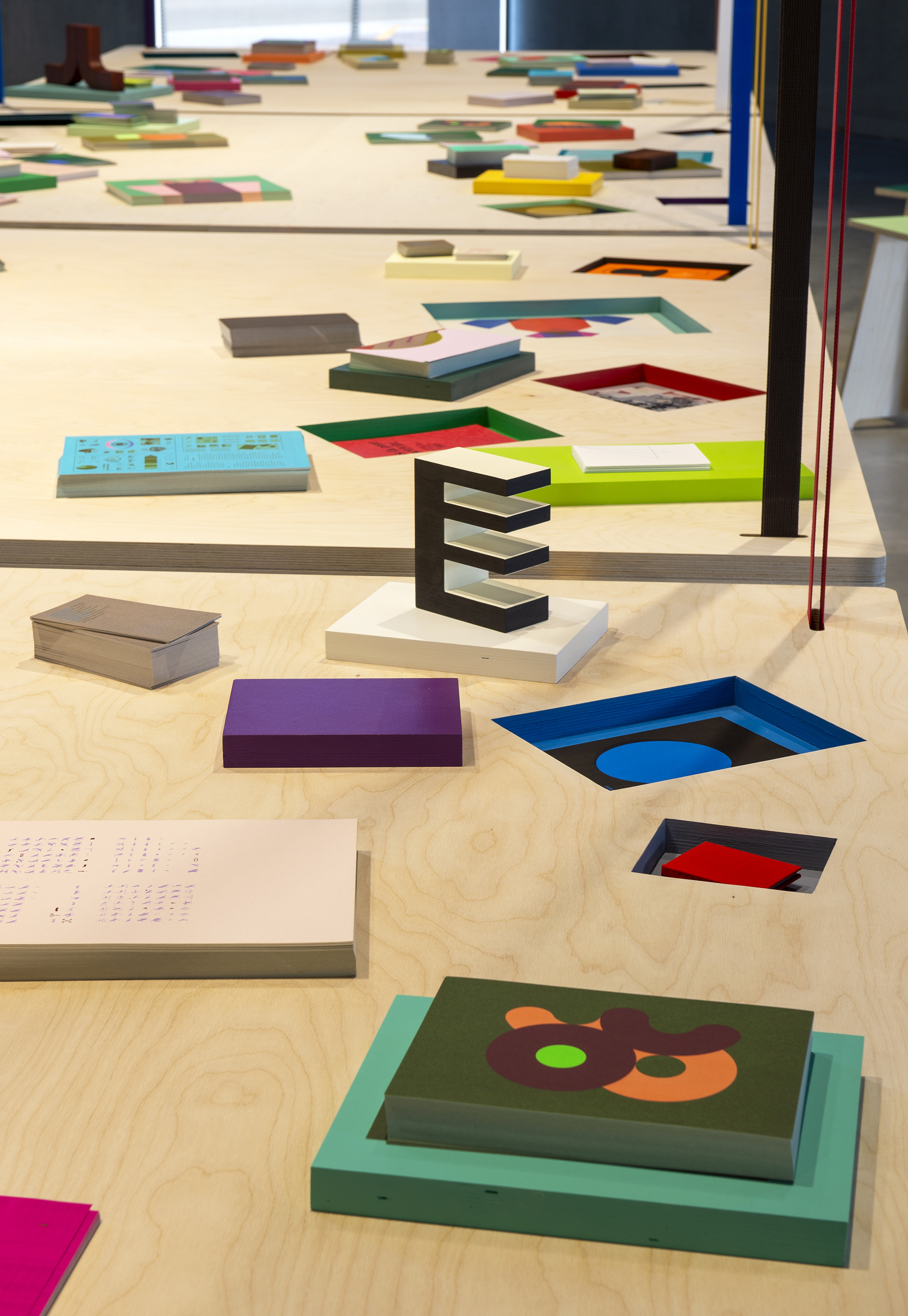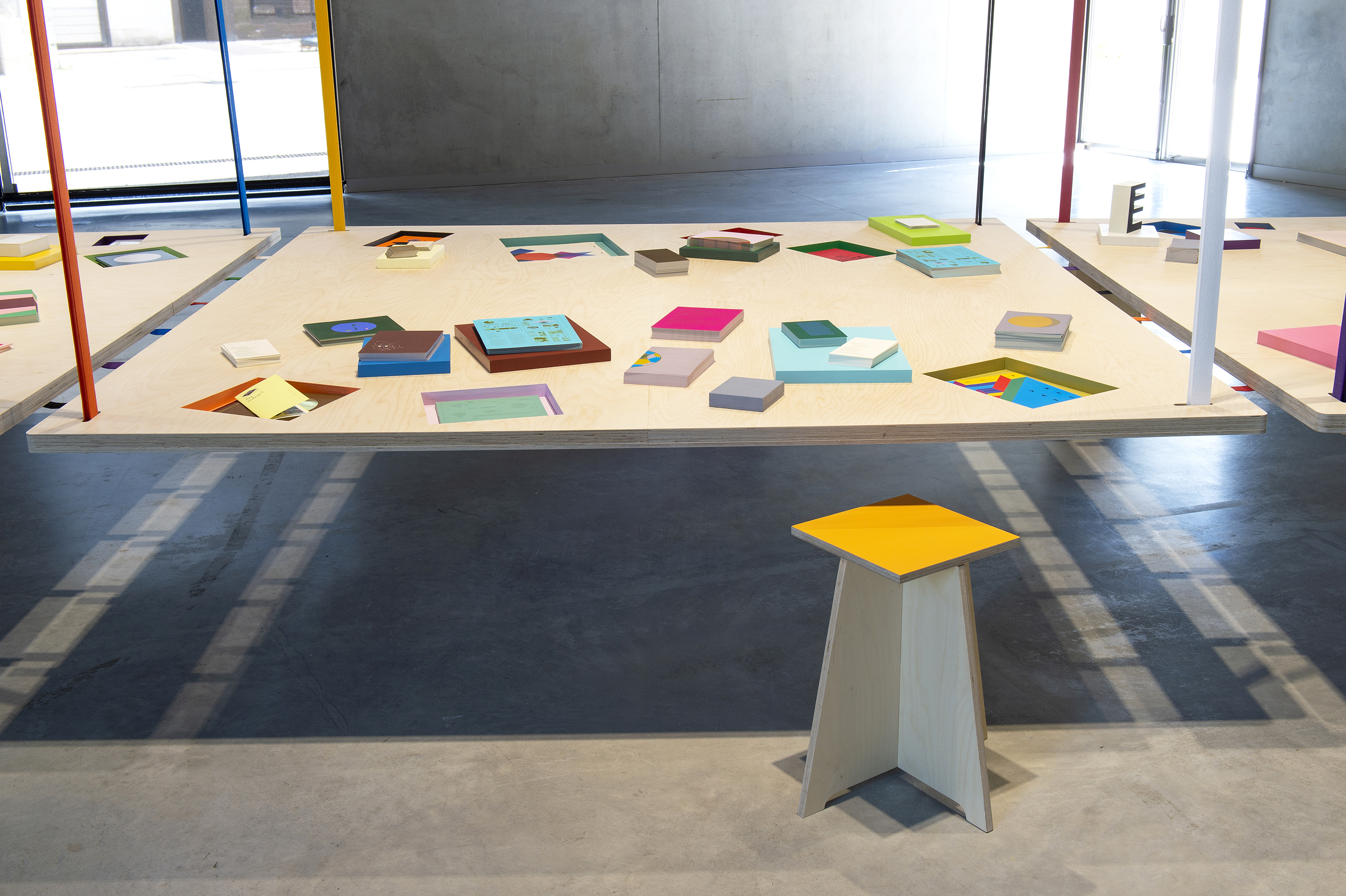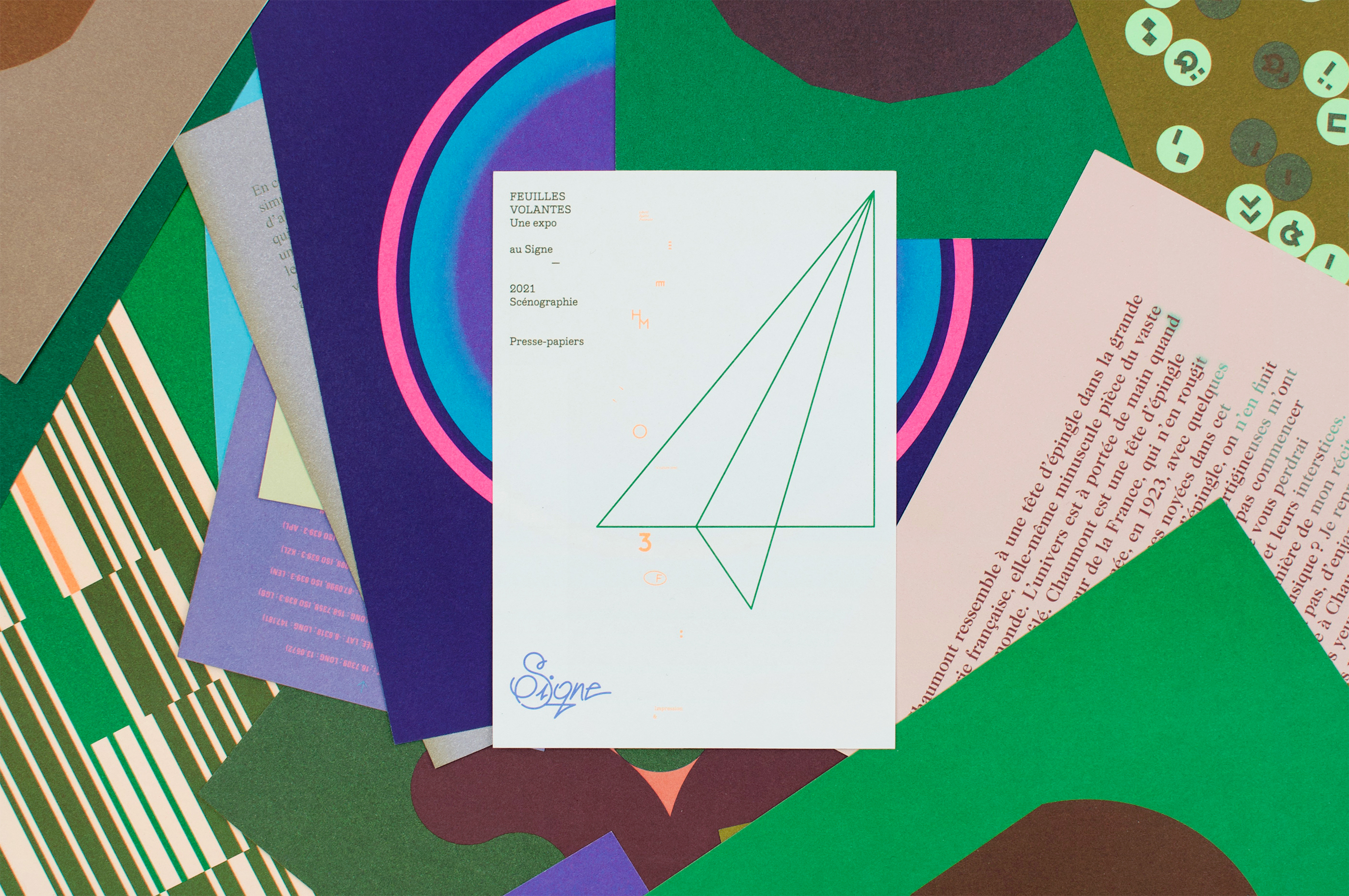 Les trente livres présentés dans mon exposition Feuilles volantes ont pour dénominateur commun mon implication dans leur conception éditoriale et graphique. Ils ont tous été investis de façon singulière, en dehors du cadre de la commande, en me positionnant tour à tour comme autrice, initiatrice, plasticienne ou accompagnatrice éditoriale. En plus d’incarner de façon métaphorique cette production éditoriale, les Feuilles volantes sont des pages littéralement échappées de chacun de ces trente ouvrages. Choisies soigneusement par mes soins, puis ré-imprimées à partir des fichiers archivés, mais dans des spectres chromatiques différents, elles en offrent une relecture dont la couleur est l’ingrédient essentiel. Mises à la disposition des visiteurs au fil de l’exposition, elles constituaient un paysage de papier mouvant, disposé en coup de vent pour former un nouveau projet éditorial, constellation à la reliure immatérielle. La scénographie ré-active une collaboration entamée avec Grégoire Romanet, il y a plus 15 ans, et dont Chaumont avait déjà été le théâtre avec l’exposition Encroyable. Il propose ici un ensemble de tables suspendues et boîtes à formes en mouvement perpétuel, faisant écho et servant de support à mes Feuilles volantes. Les presse-papiers dessinés et fabriqués par Pernelle Poyet apportent une touche ludique à cet ensemble polymorphe.