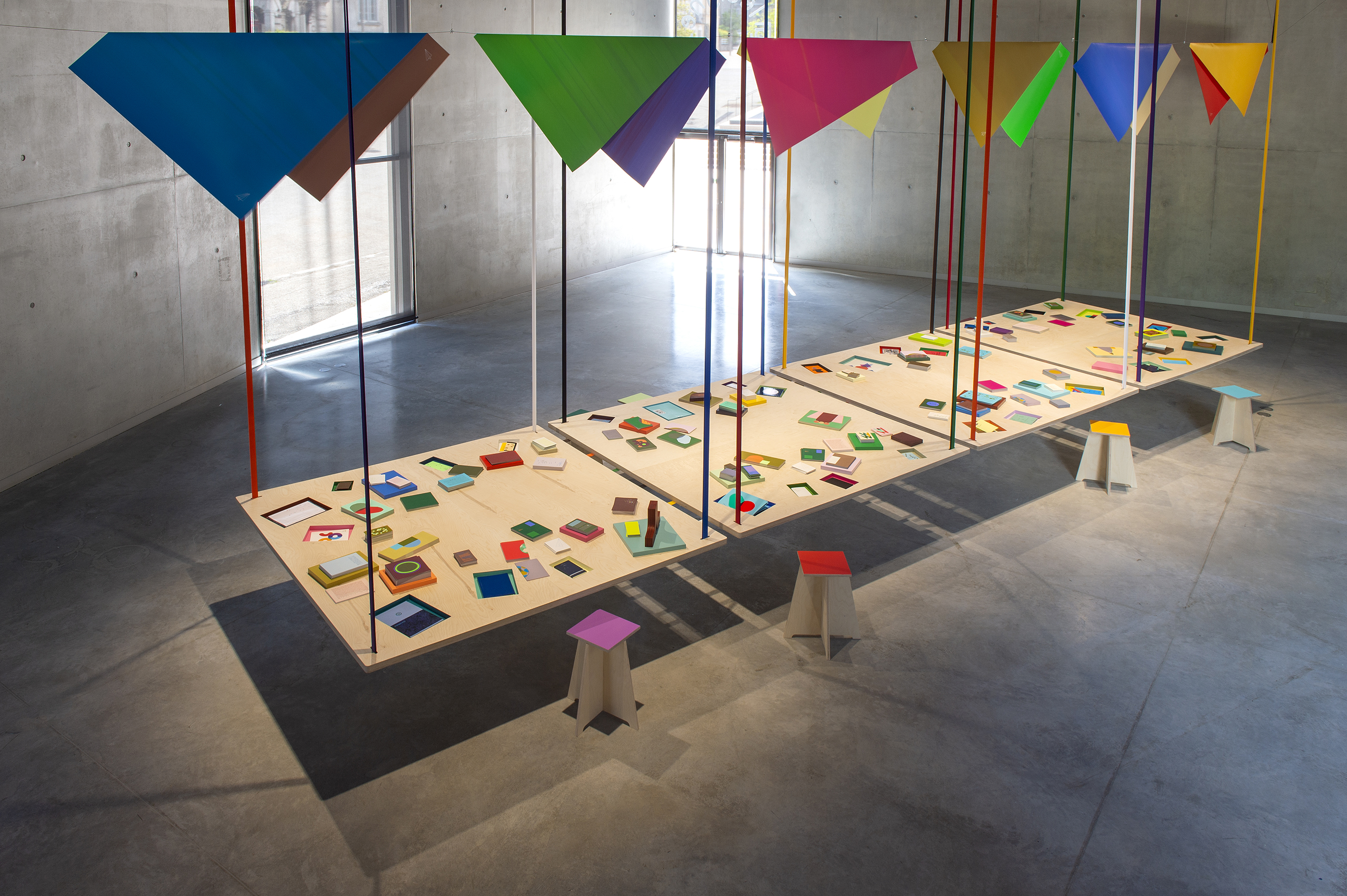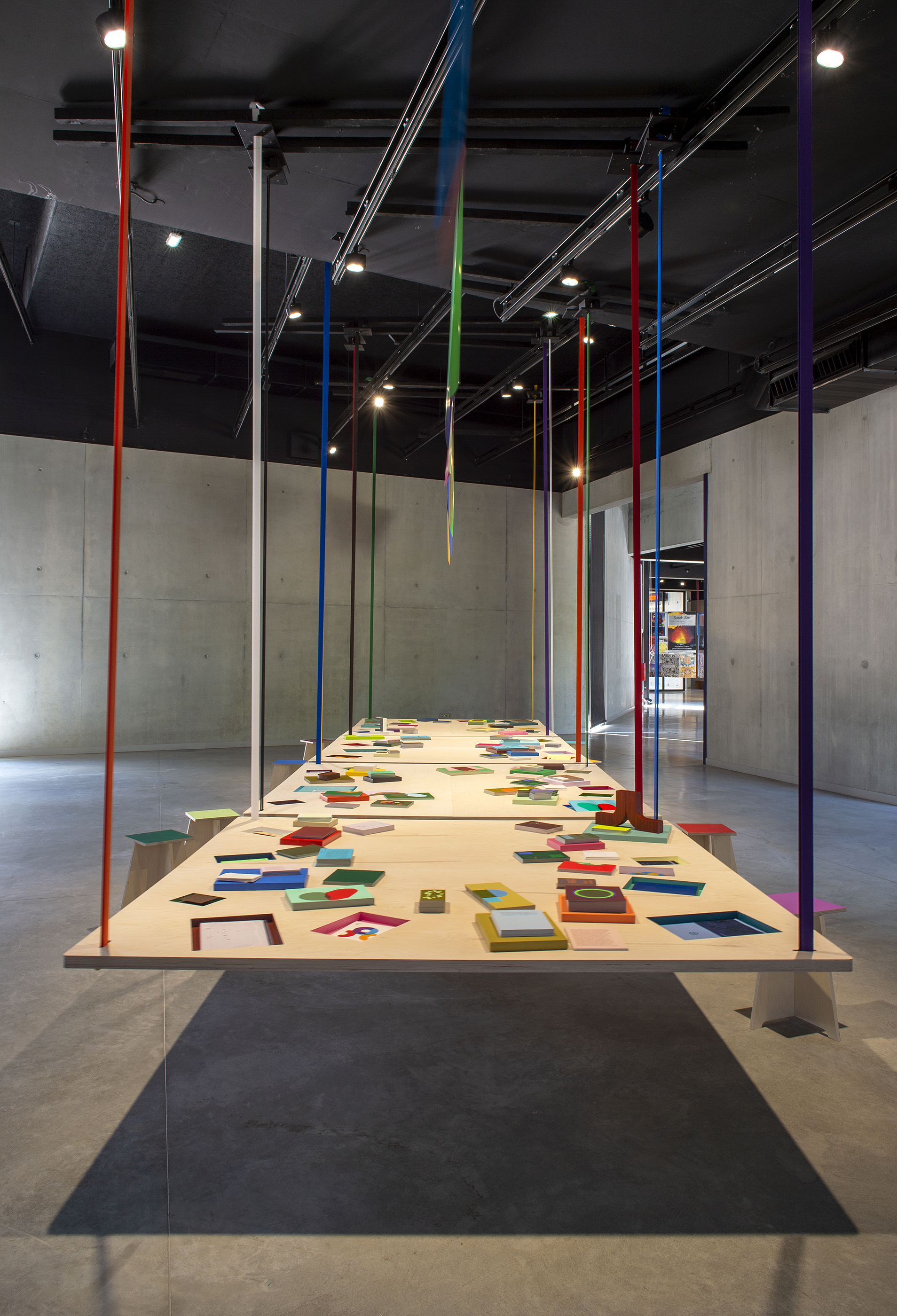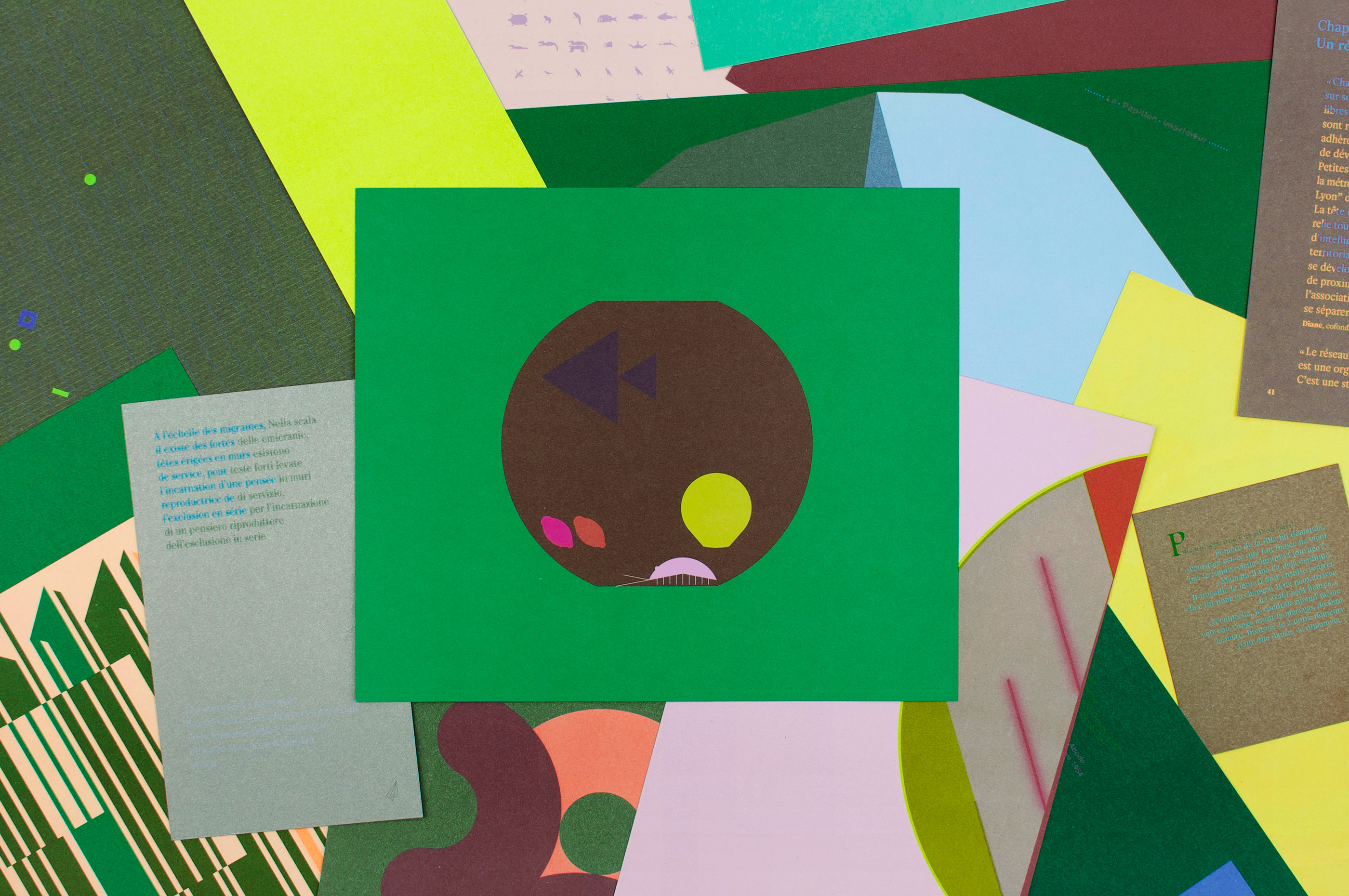 Les trente livres présentés dans mon exposition Feuilles volantes ont pour dénominateur commun mon implication dans leur conception éditoriale et graphique. Ils ont tous été investis de façon singulière, en dehors du cadre de la commande, en me positionnant tour à tour comme autrice, initiatrice, plasticienne ou accompagnatrice éditoriale. En plus d’incarner de façon métaphorique cette production éditoriale, les Feuilles volantes sont des pages littéralement échappées de chacun de ces trente ouvrages. Choisies soigneusement par mes soins, puis ré-imprimées à partir des fichiers archivés, mais dans des spectres chromatiques différents, elles en offrent une relecture dont la couleur est l’ingrédient essentiel. Mises à la disposition des visiteurs au fil de l’exposition, elles constituaient un paysage de papier mouvant, disposé en coup de vent pour former un nouveau projet éditorial, constellation à la reliure immatérielle. La scénographie ré-active une collaboration entamée avec Grégoire Romanet, il y a plus 15 ans, et dont Chaumont avait déjà été le théâtre avec l’exposition Encroyable. Il propose ici un ensemble de tables suspendues et boîtes à formes en mouvement perpétuel, faisant écho et servant de support à mes Feuilles volantes. Les presse-papiers dessinés et fabriqués par Pernelle Poyet apportent une touche ludique à cet ensemble polymorphe.