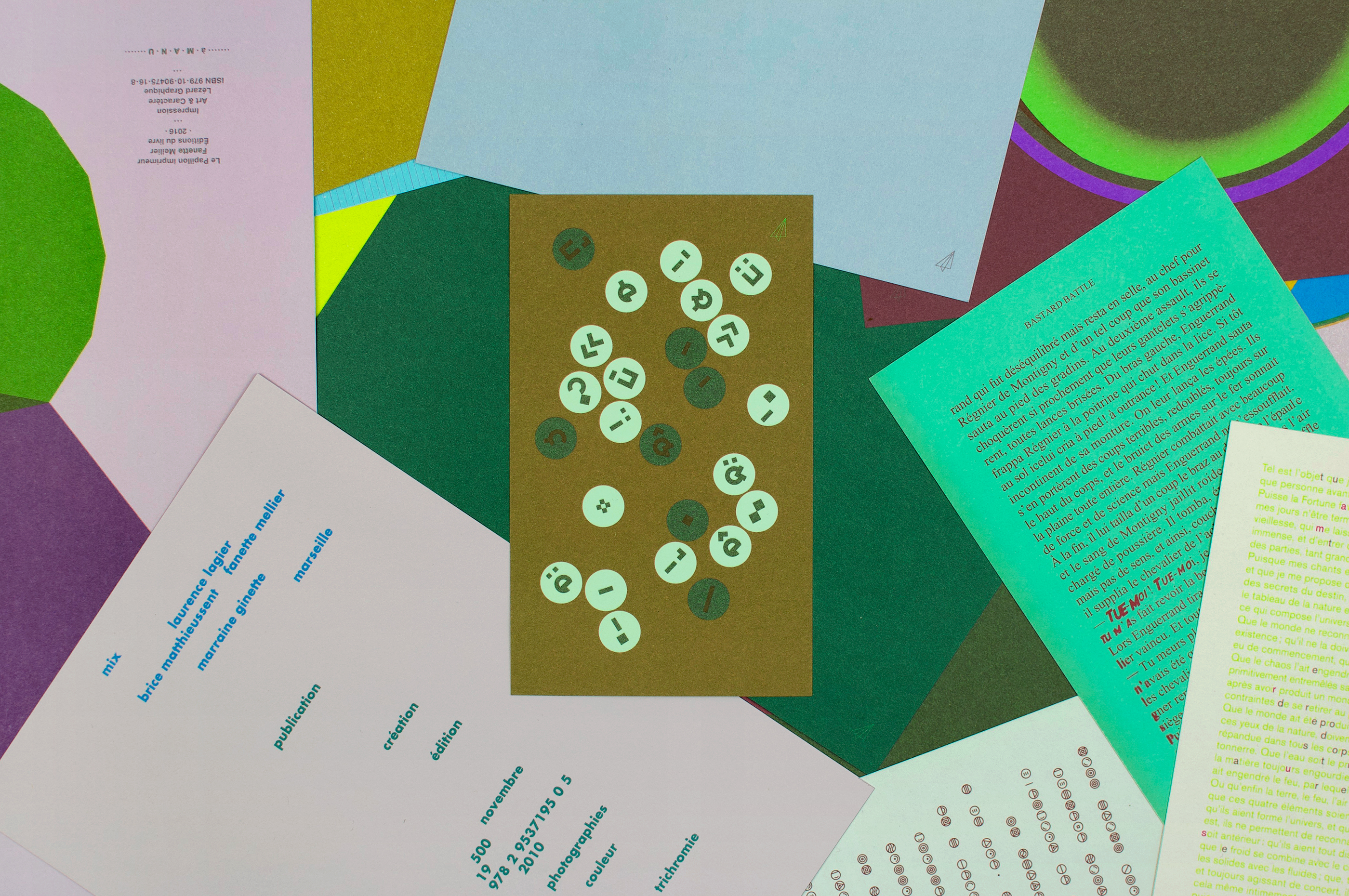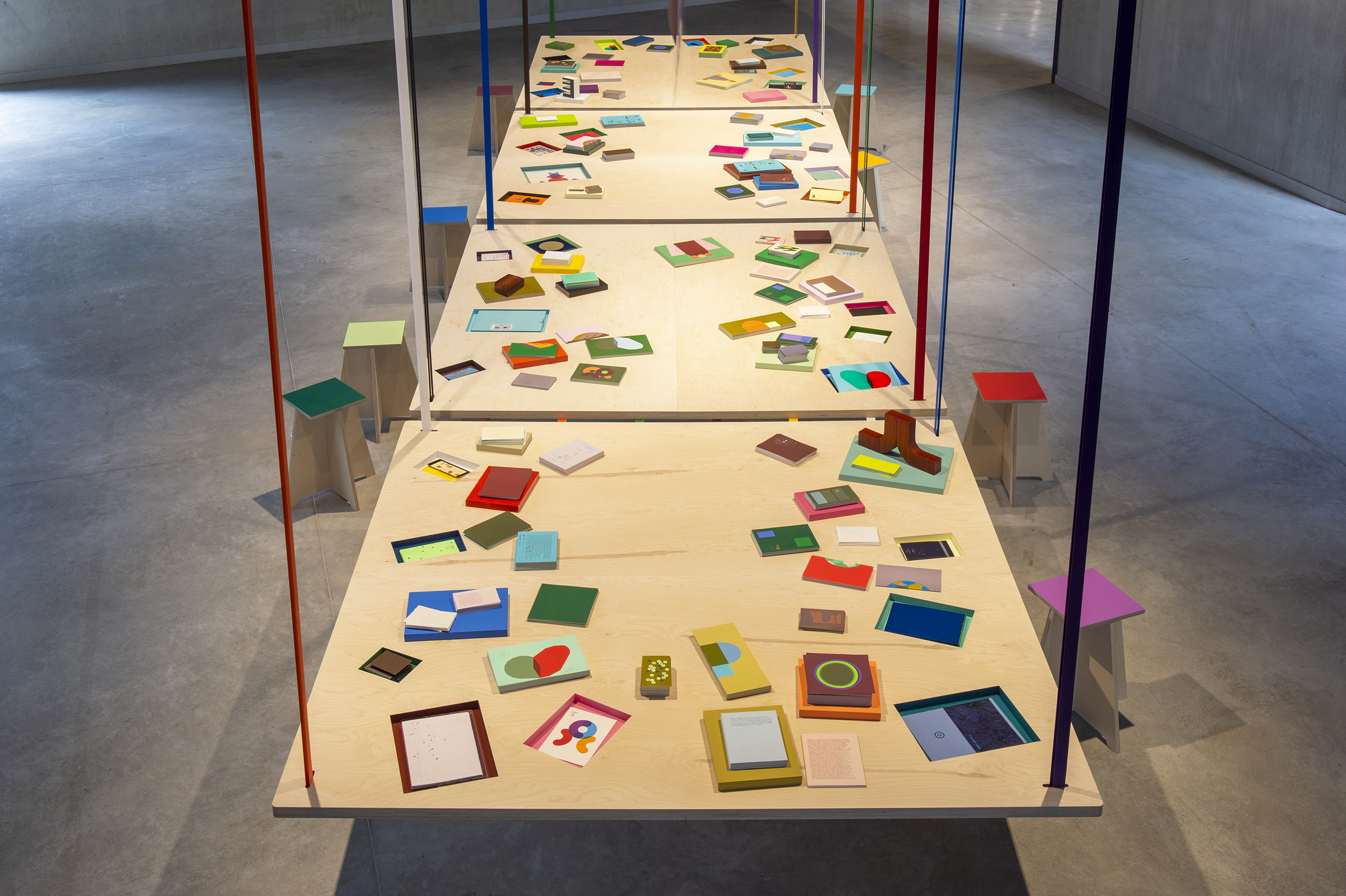 The common denominator of the thirty books presented in my exhibition Feuilles Volantes is my involvement in their conception and form. They were all produced outside the framework of a “commission” meaning that I had to be, at one and the same time, author, initiator, visual artist and editor. Standing as a metaphor for these projects, the Feuilles Volantes are pages that have literally escaped from each of the thirty works. Having made a careful choice, I then had the selected pages reprinted from the archived files, but in different chromatic spectrums, offering a rereading of them where colour is the essential ingredient. Accessible to visitors throughout the exhibition, they constituted a moving paper landscape, blown here and there and coming together to create a new unbound project out of the randomly scattered pages. The exhibition design gave me the opportunity of renewing – after more than 15 years – my collaboration with Grégoire Romanet. That too was in Chaumont with the exhibition Encroyable. Now he suggested using an arrangement of suspended tables and various shapes of constantly moving boxes, echoing and serving as a support for my Feuilles volantes. The paperweights designed and made by Pernelle Poyet brought a playful touch to this heterogeneous collection of works.