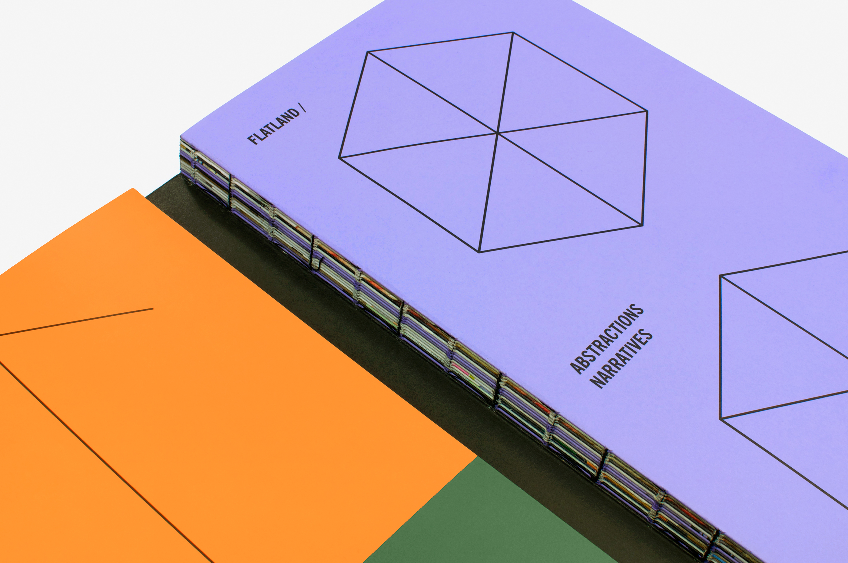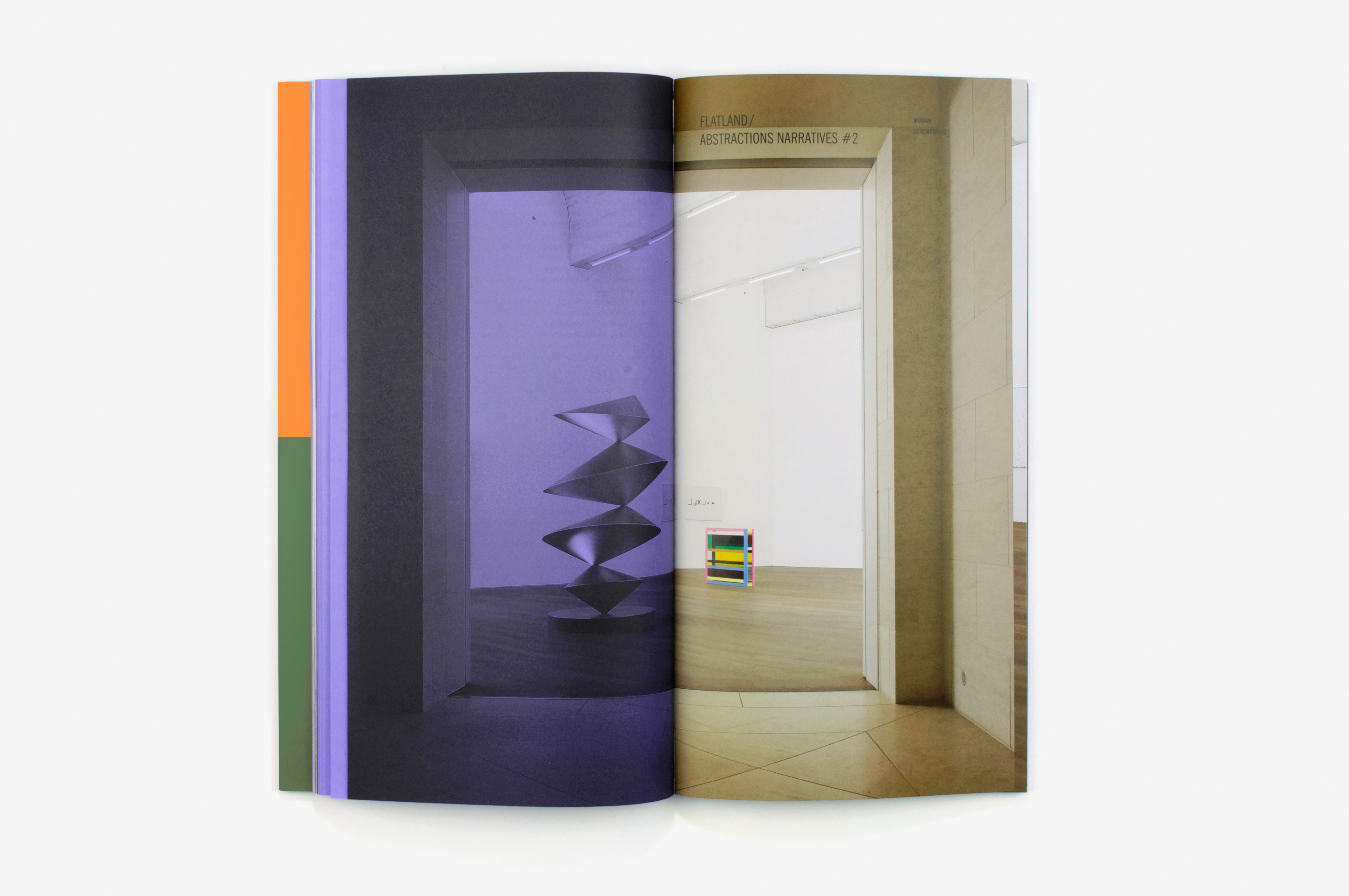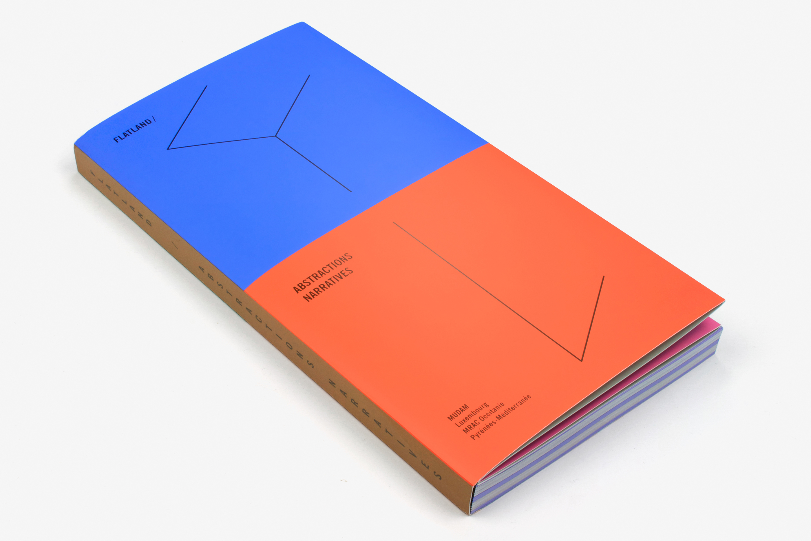 This catalogue was produced for the exhibition Flatland, Abstractions narratives curated by Marianne Derrien and Sarah Ihler-Meyer and consisting of two parts, the first at MRAC (Sérignan) and the second at MUDAM (Luxembourg). The works were inspired by the famous book Flatland by Edwin A. Abbott (the hero of which is a square) and put forward narratives based on abstract forms. The book seeks to offer a “spatial installation” of the content. The sections, in axonometric lettering, are physically indicated by the colours of the concertina folds. The format of the book is based on a square (our hero too!) as is the grid of the page layout. The Swiss binding, exposing the black threads and glue, makes it possible to open the book out flat. The two parts of the project are presented individually in the catalogue, the images taking us on a journey through the exhibition spaces. Different angles, reflections, multiple viewpoints and the handing of recto/verso accentuate the feeling of immersion.