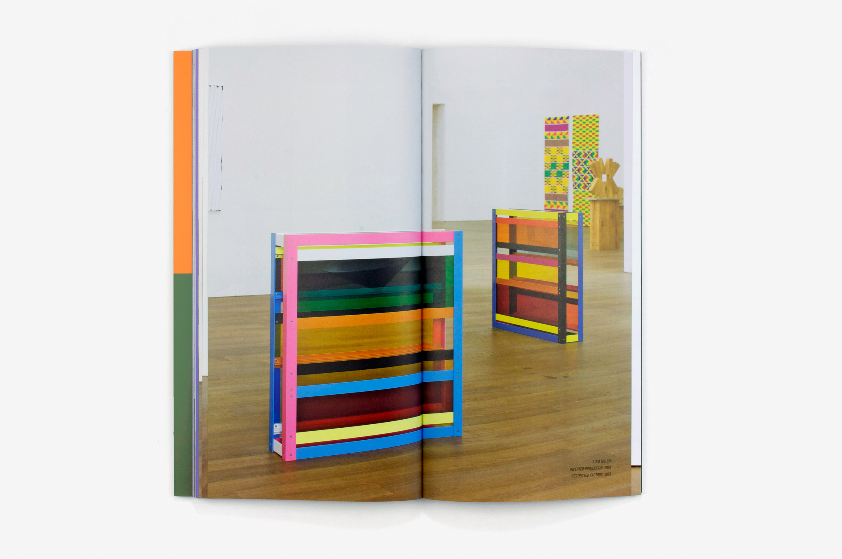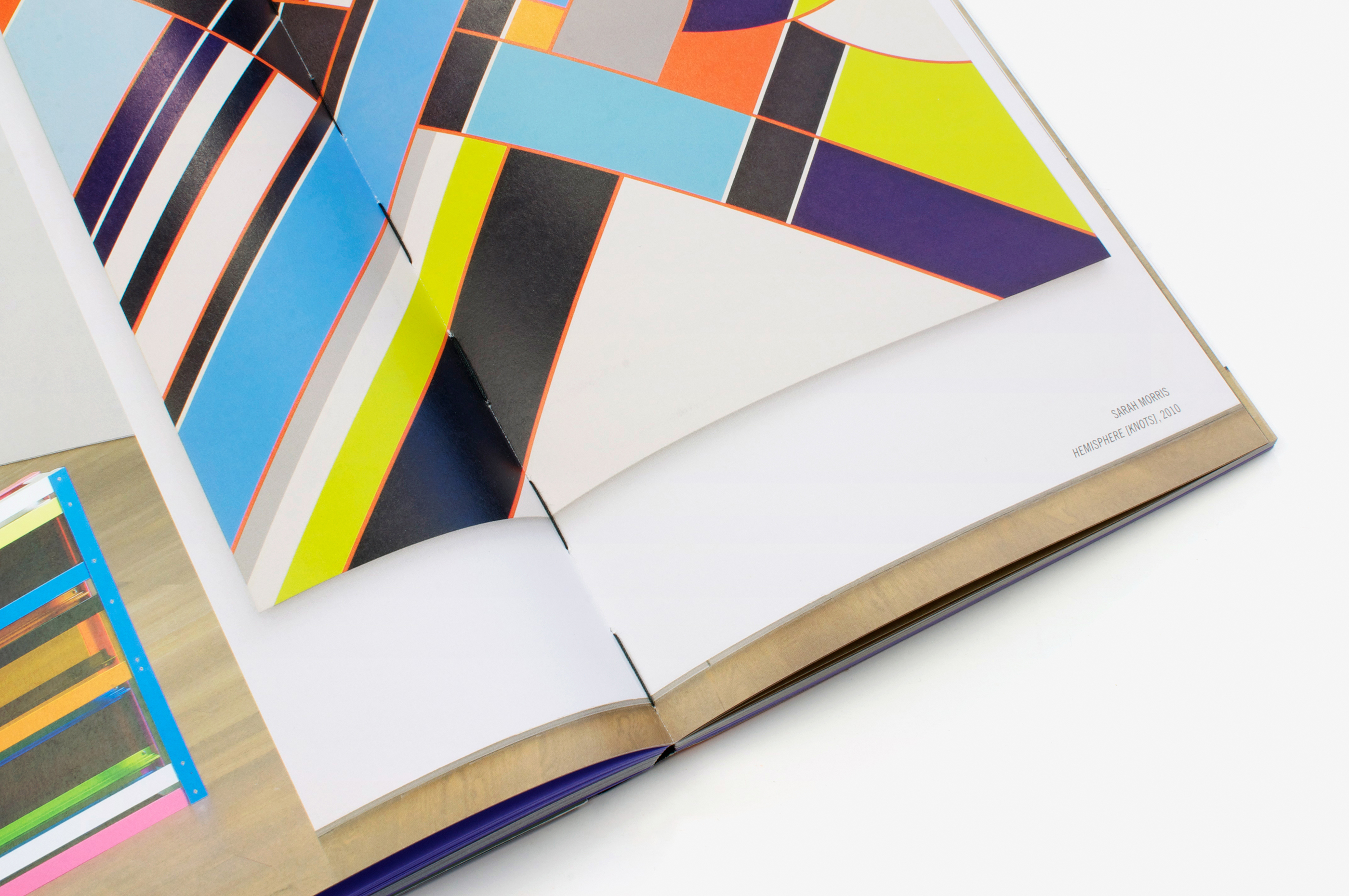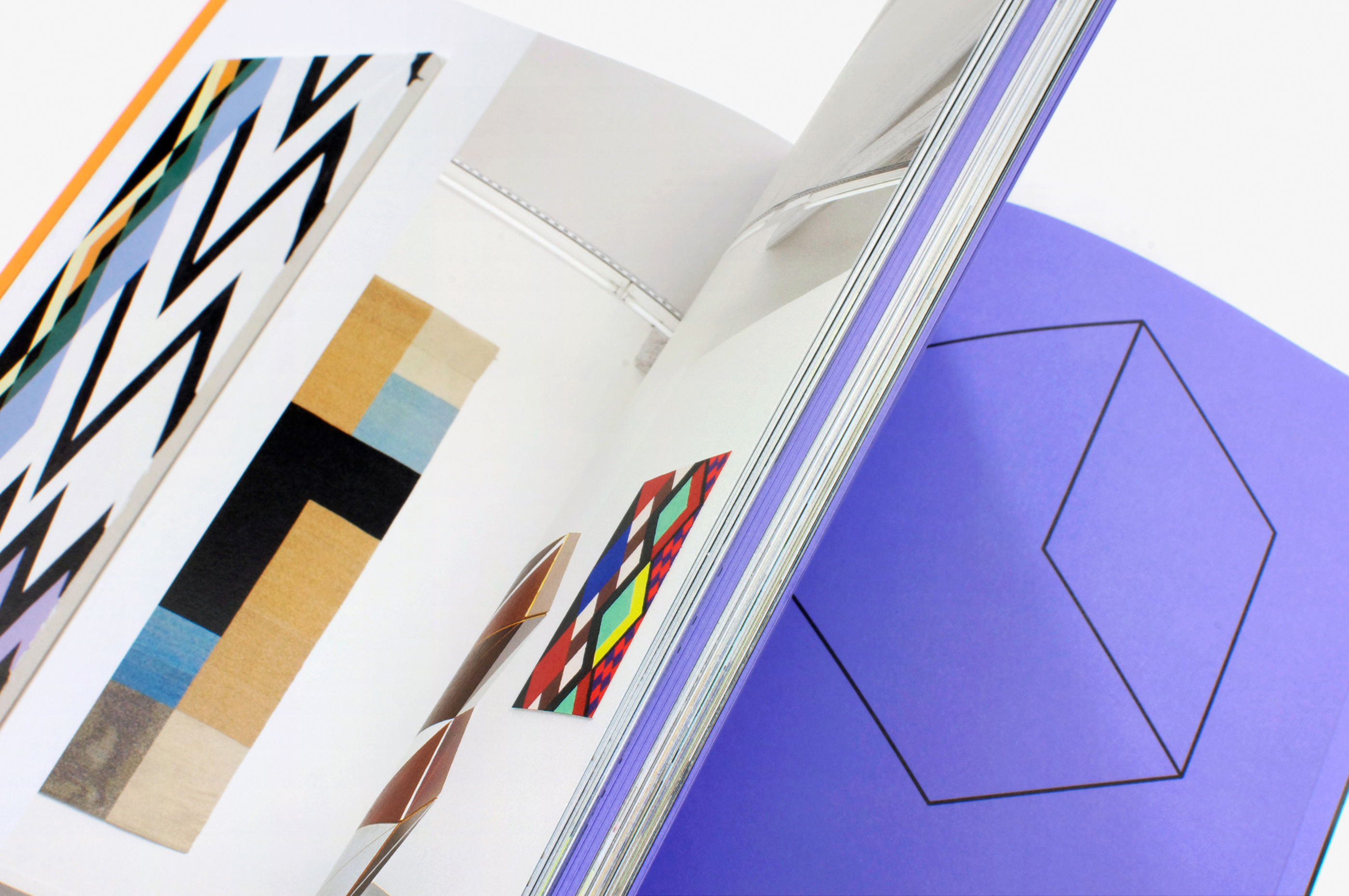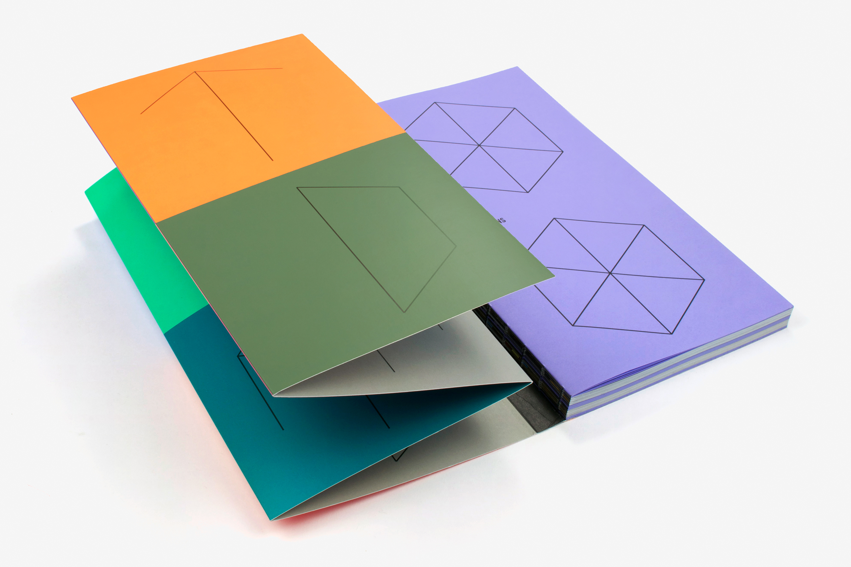 This catalogue was produced for the exhibition Flatland, Abstractions narratives curated by Marianne Derrien and Sarah Ihler-Meyer and consisting of two parts, the first at MRAC (Sérignan) and the second at MUDAM (Luxembourg). The works were inspired by the famous book Flatland by Edwin A. Abbott (the hero of which is a square) and put forward narratives based on abstract forms. The book seeks to offer a “spatial installation” of the content. The sections, in axonometric lettering, are physically indicated by the colours of the concertina folds. The format of the book is based on a square (our hero too!) as is the grid of the page layout. The Swiss binding, exposing the black threads and glue, makes it possible to open the book out flat. The two parts of the project are presented individually in the catalogue, the images taking us on a journey through the exhibition spaces. Different angles, reflections, multiple viewpoints and the handing of recto/verso accentuate the feeling of immersion.