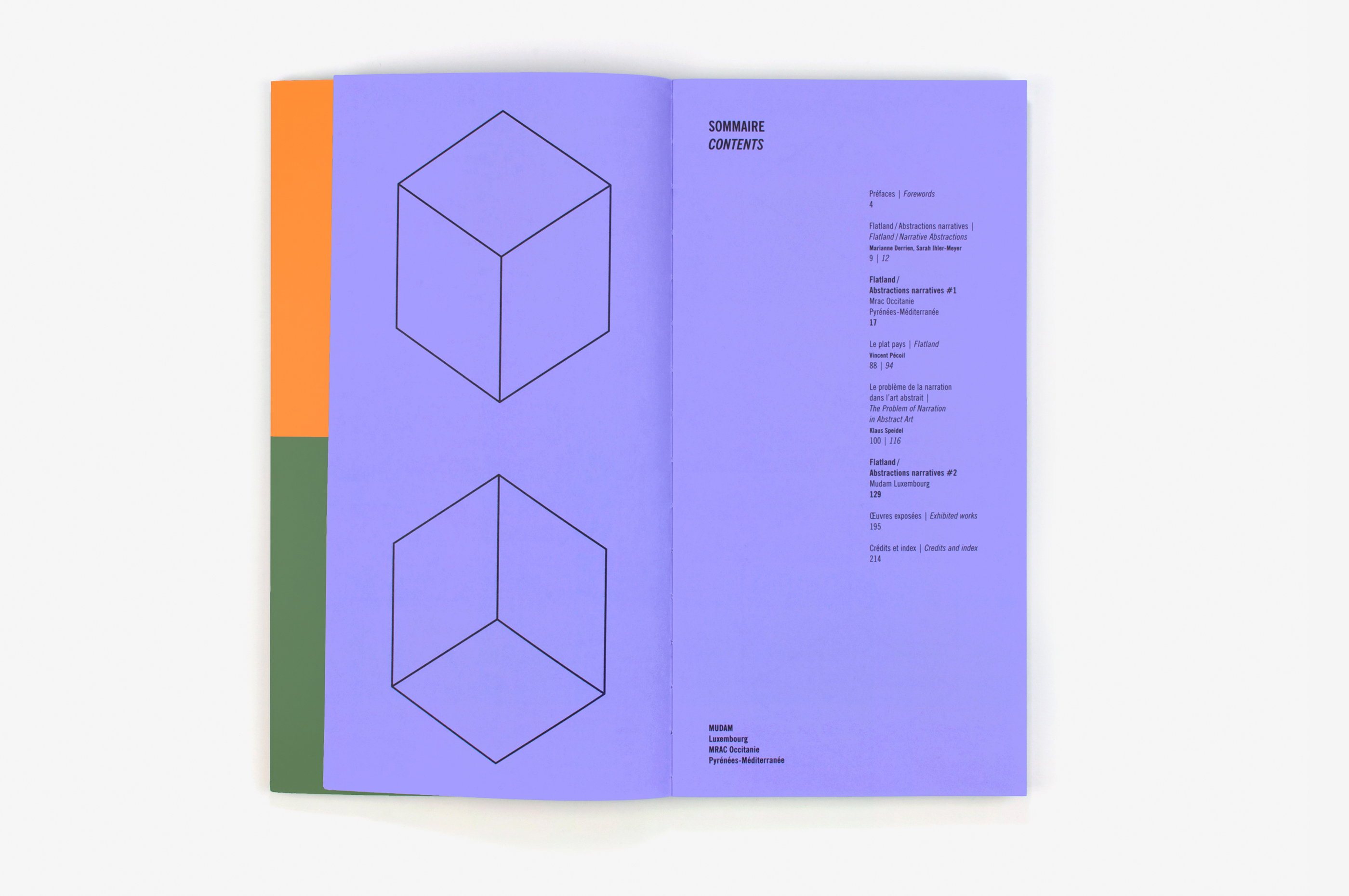 Ce catalogue présente l’exposition Flatland, Abstractions narratives initiée par Marianne Derrien et Sarah Ihler-Meyer, dont les deux volets se sont tenus au Mrac (Sérignan) puis au Mudam (Luxembourg). Les œuvres présentées font écho au célèbre livre Flatland de Edwin A. Abbott (dont le héros est un carré), et proposent des récits à partir de formes abstraites. L’ouvrage propose une véritable «mise en espace» du contenu. Le titrage, aux lettres axonométriques, est déployé physiquement, dans un accordéon de couleurs. Le carré (qui est aussi notre héros!) a déterminé le format du livre, il structure aussi la grille de mise en page. La reliure suisse rend visibles les fils noirs et la colle, et possible une lecture parfaitement à plat. Les deux volets du projet sont présentés distinctement dans l’ouvrage, comme de véritables déambulations dans les espaces d’exposition, dont les photographies ont été prises par Aurélien Mole. Les mises en regard, reflets, points de vue multiples et jeux de recto/verso accentuent cette sensation immersive.