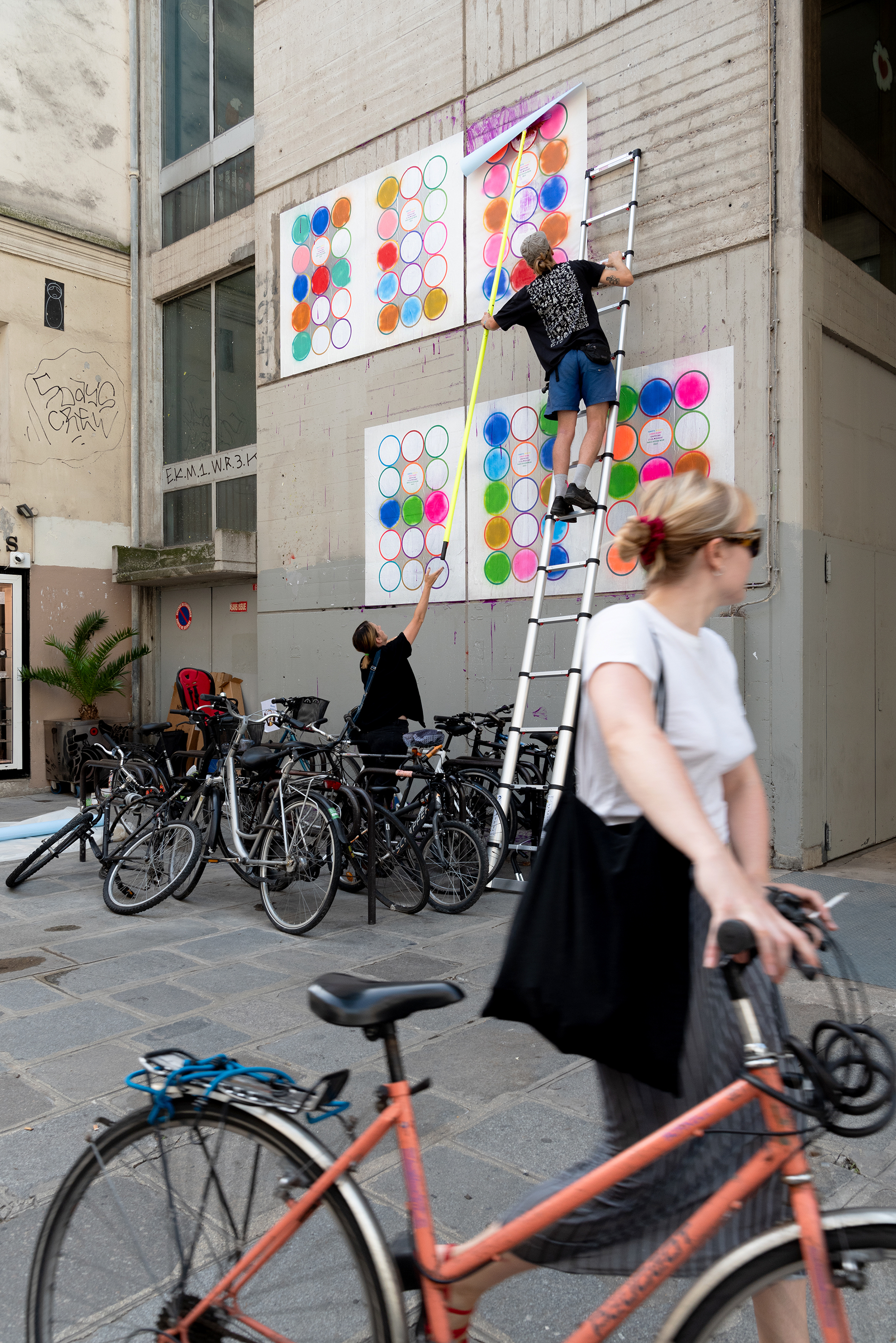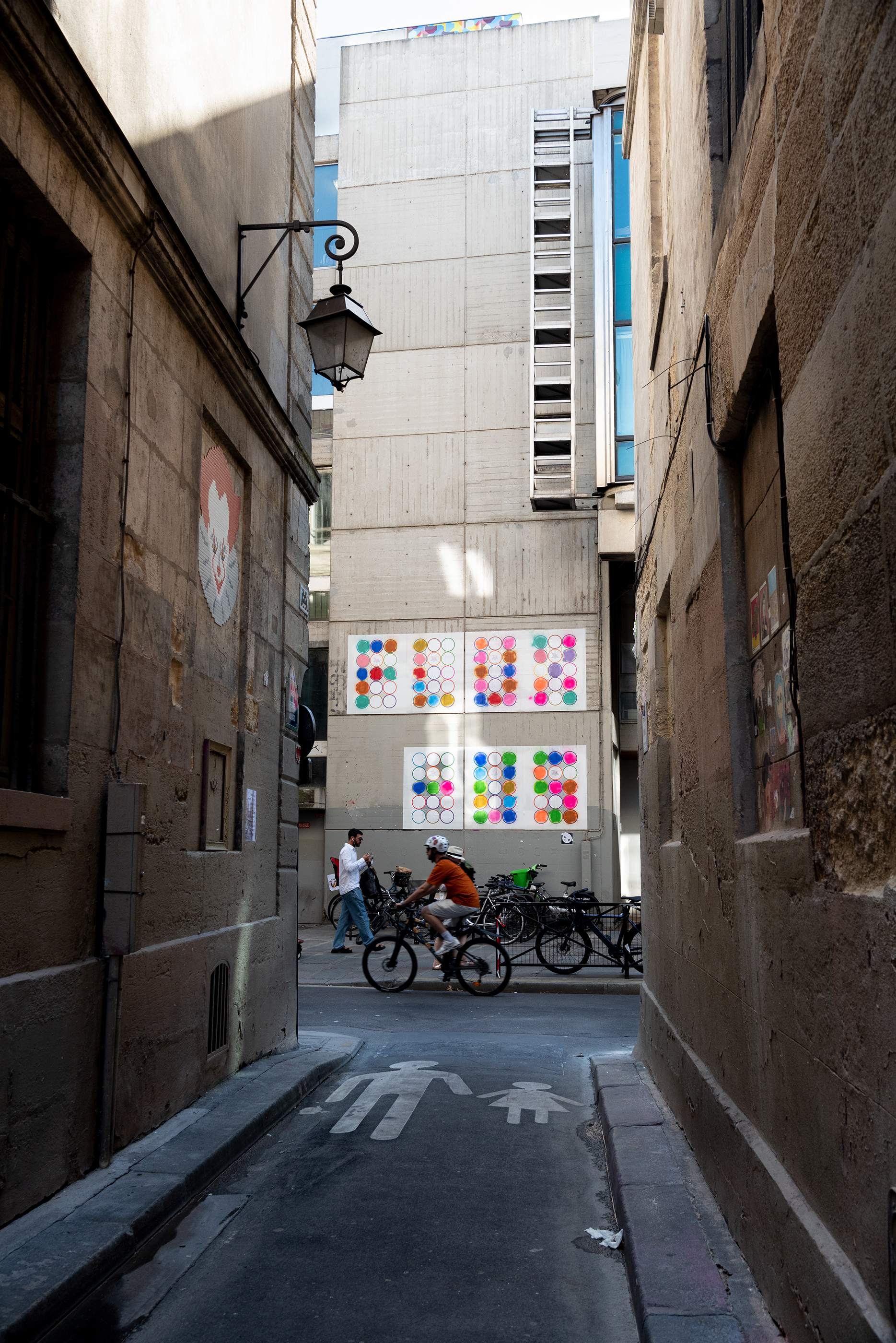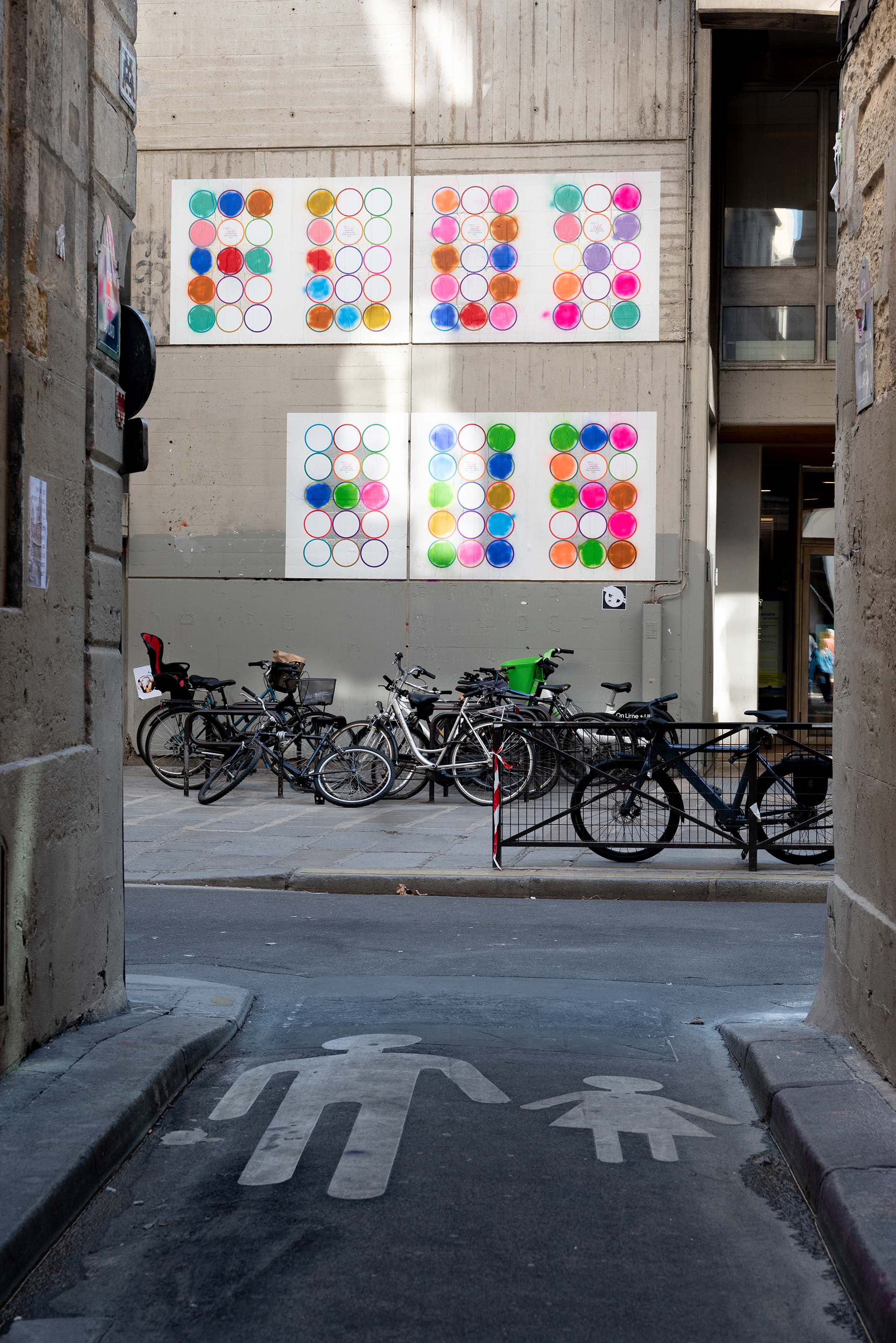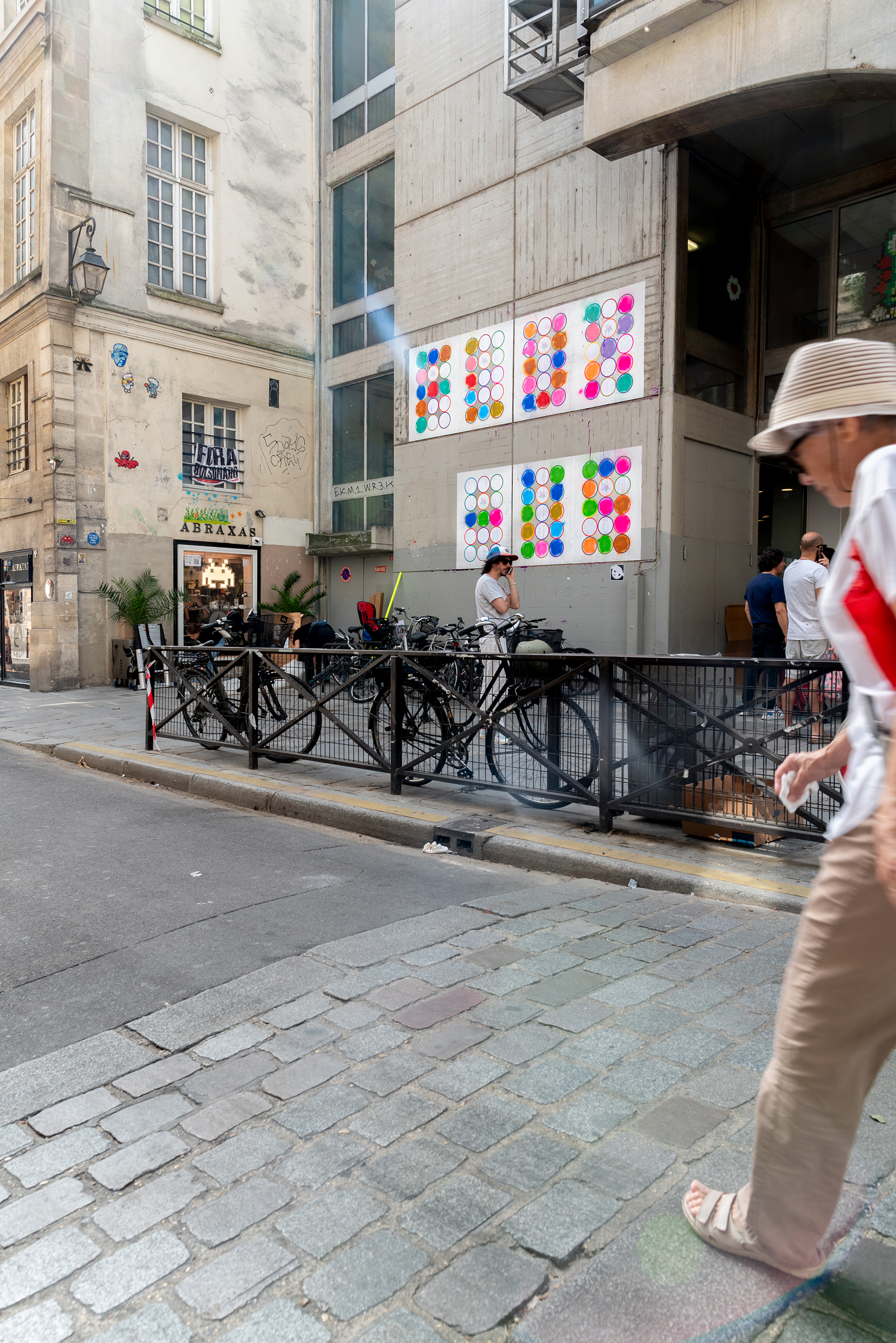 This installation was created on the wall of the Saint-Merri school for the Graphisme à ciel ouvert/Paris Design week festival. Ink from a spray can – a favourite street-art tool – is used here to fill in dots on a typographic grid. The word Flux-Us (the hyphenation leading us to read it in 2 stages) resonates with the urban flow and the utopian ideal of art for everyone, while including a nod to the Pompidou Centre located just round the corner!