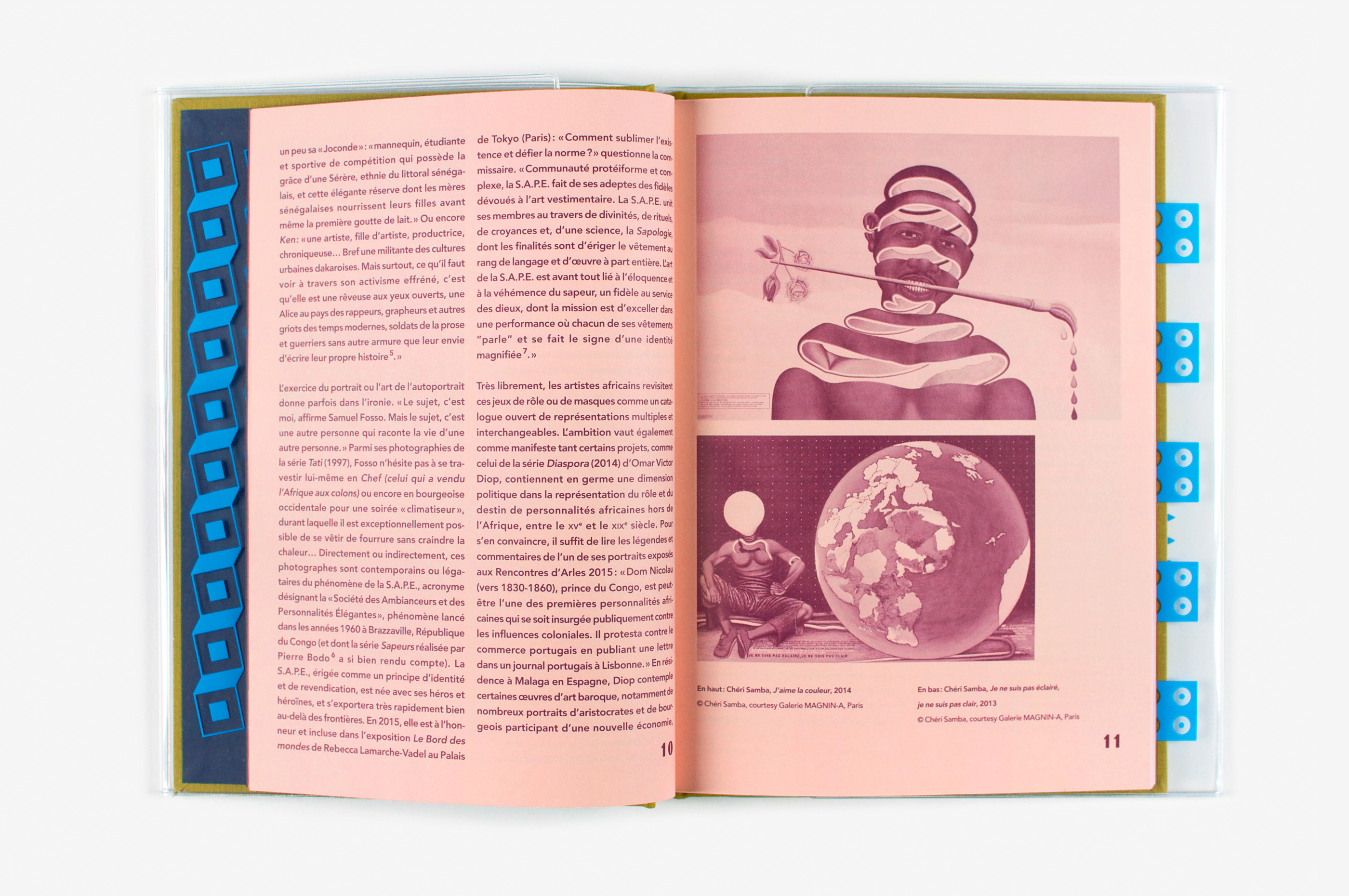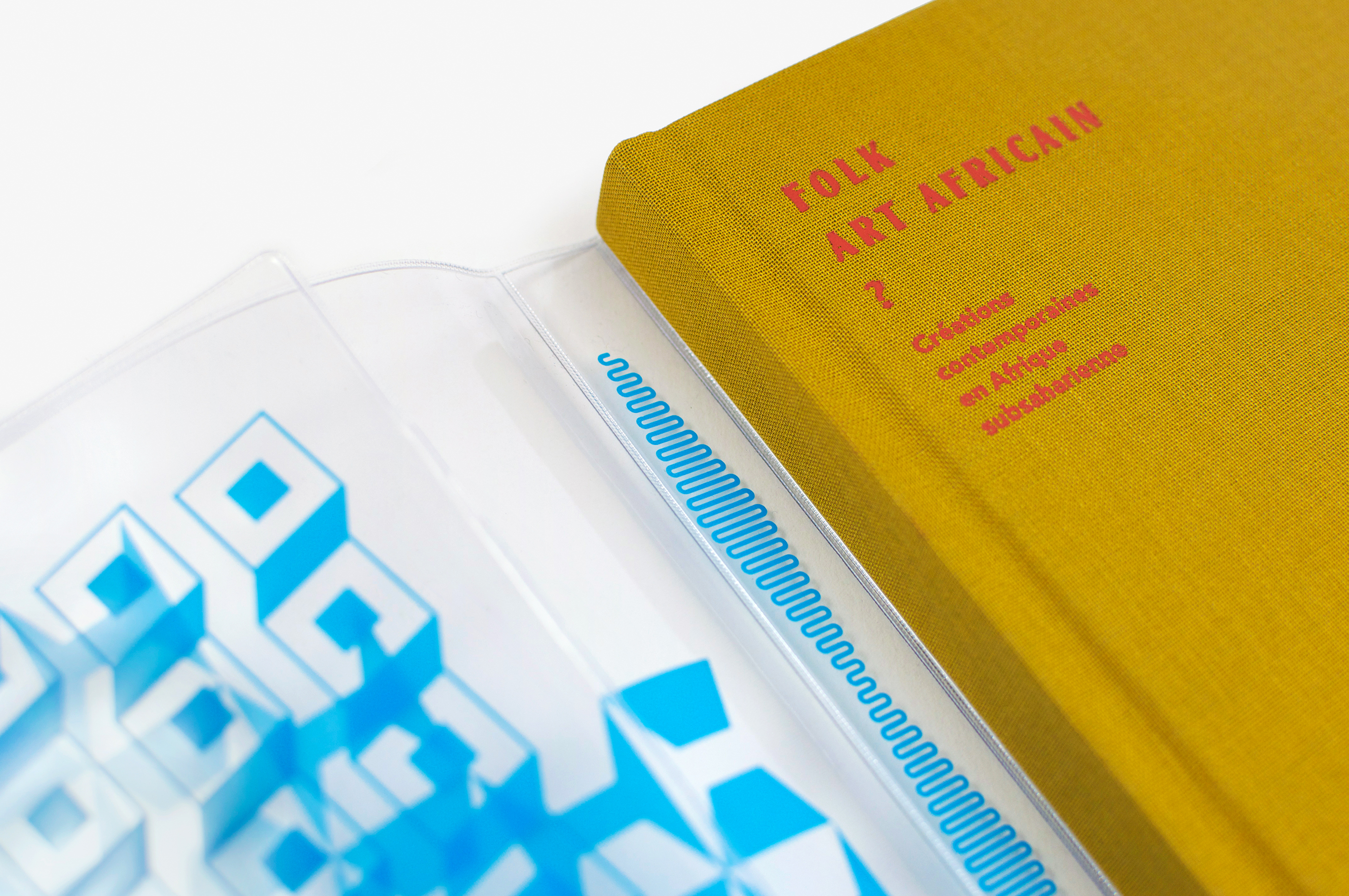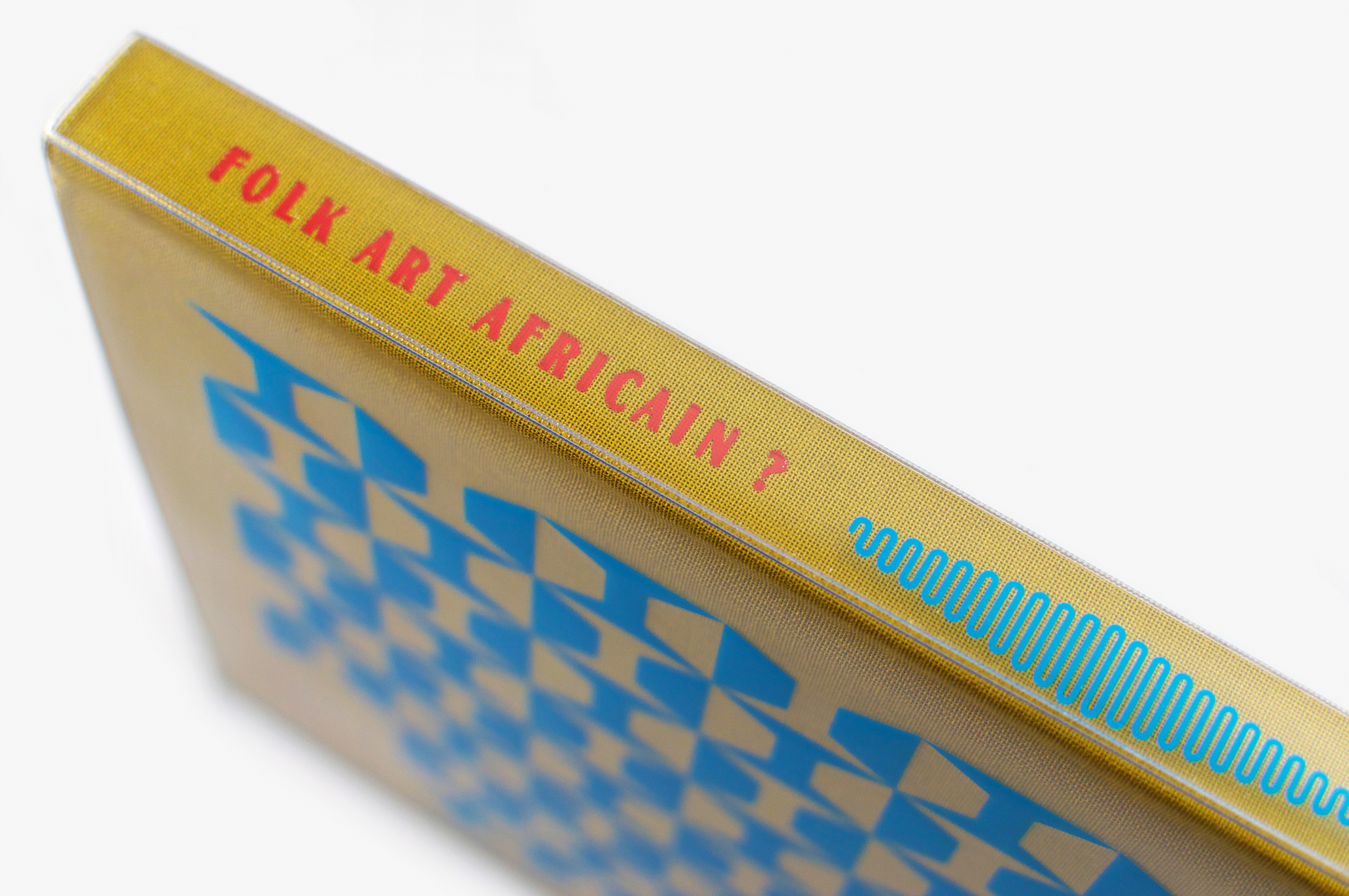 Cet ouvrage présente les travaux d’artistes contemporains africains dont les œuvres font écho aux cultures populaires de l’Afrique subsaharienne. Le contraste entre la matière plastique et la toile de la couverture évoque le métissage entre traditions et modernités. Des motifs inspirés de matières tissées folkloriques sont déployés sur la jaquette qui recouvre et protège le livre. Ils s’inscrivent dans un jeu de composition complémentaire avec la typographie, qui est dorée à chaud sur la couverture toilée. Cette idée de rythme et de tissage, qui structure la composition et la mise en page intérieure, est aussi présente dans la matière même de l’ouvrage: alternance ‘millefeuille’ des cahiers textes et images, tranchefile tissé noir et blanc…