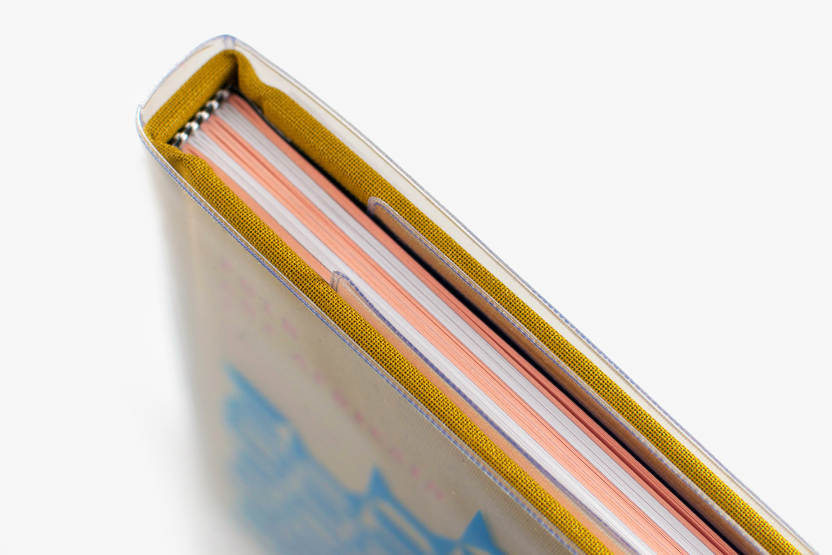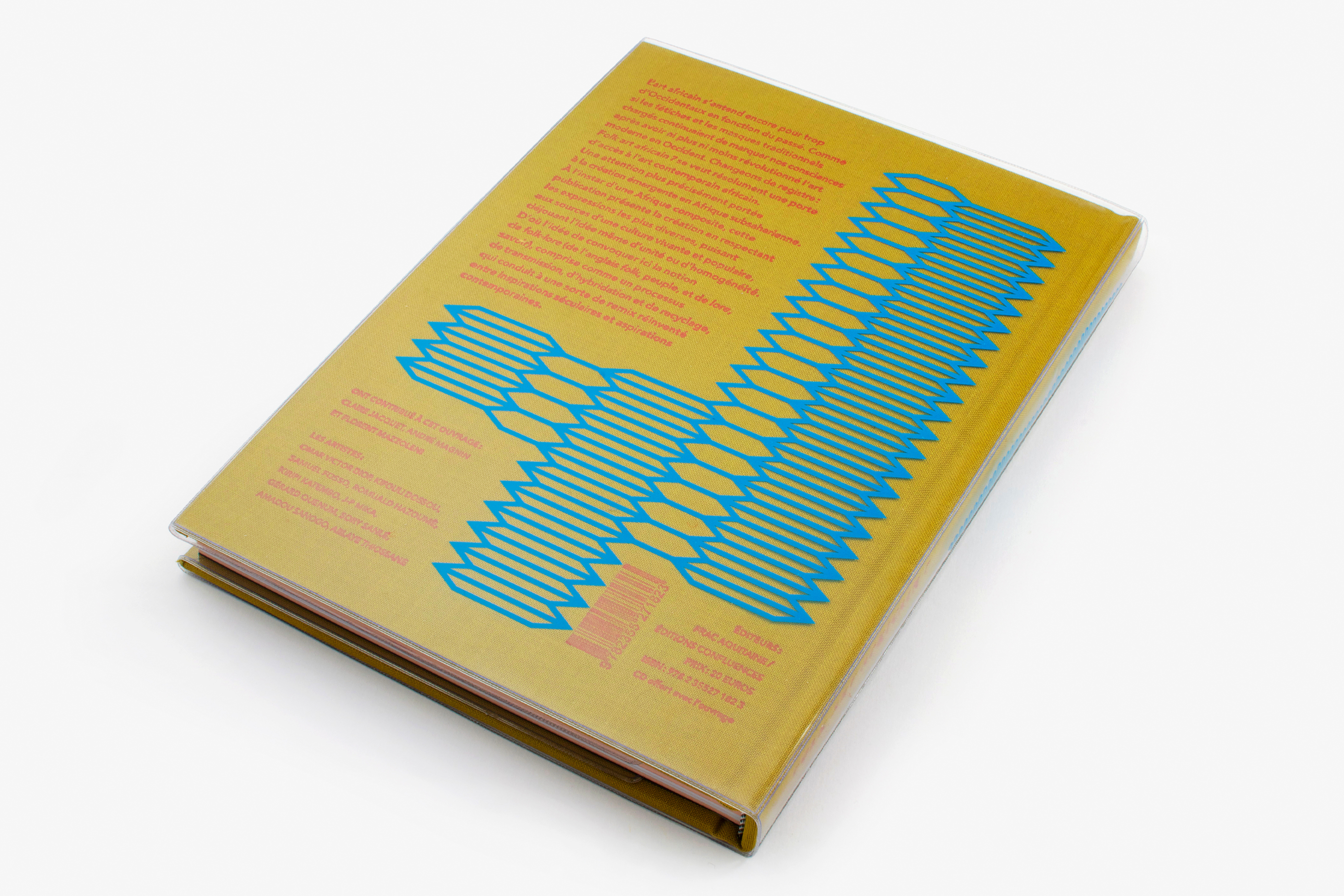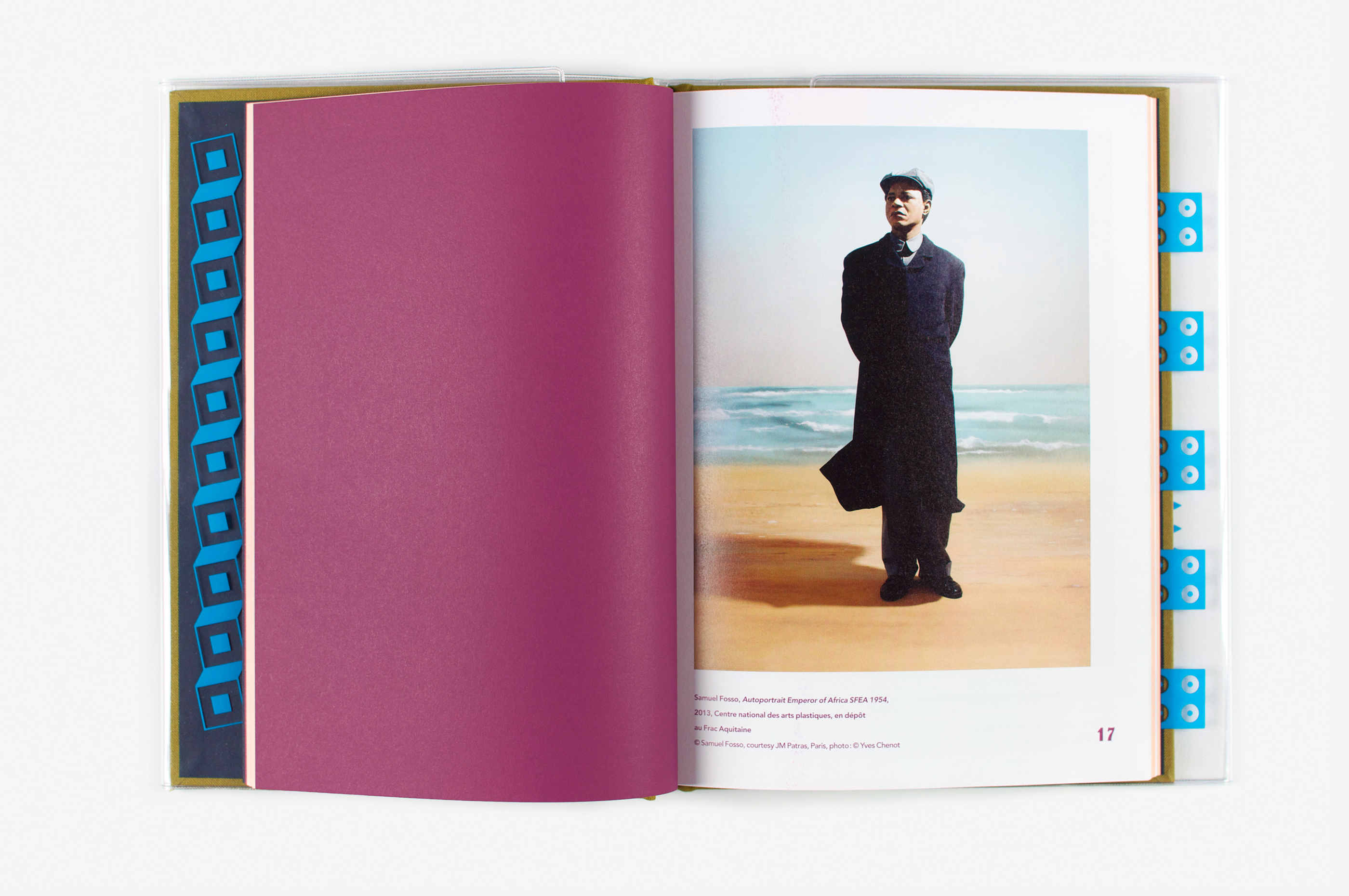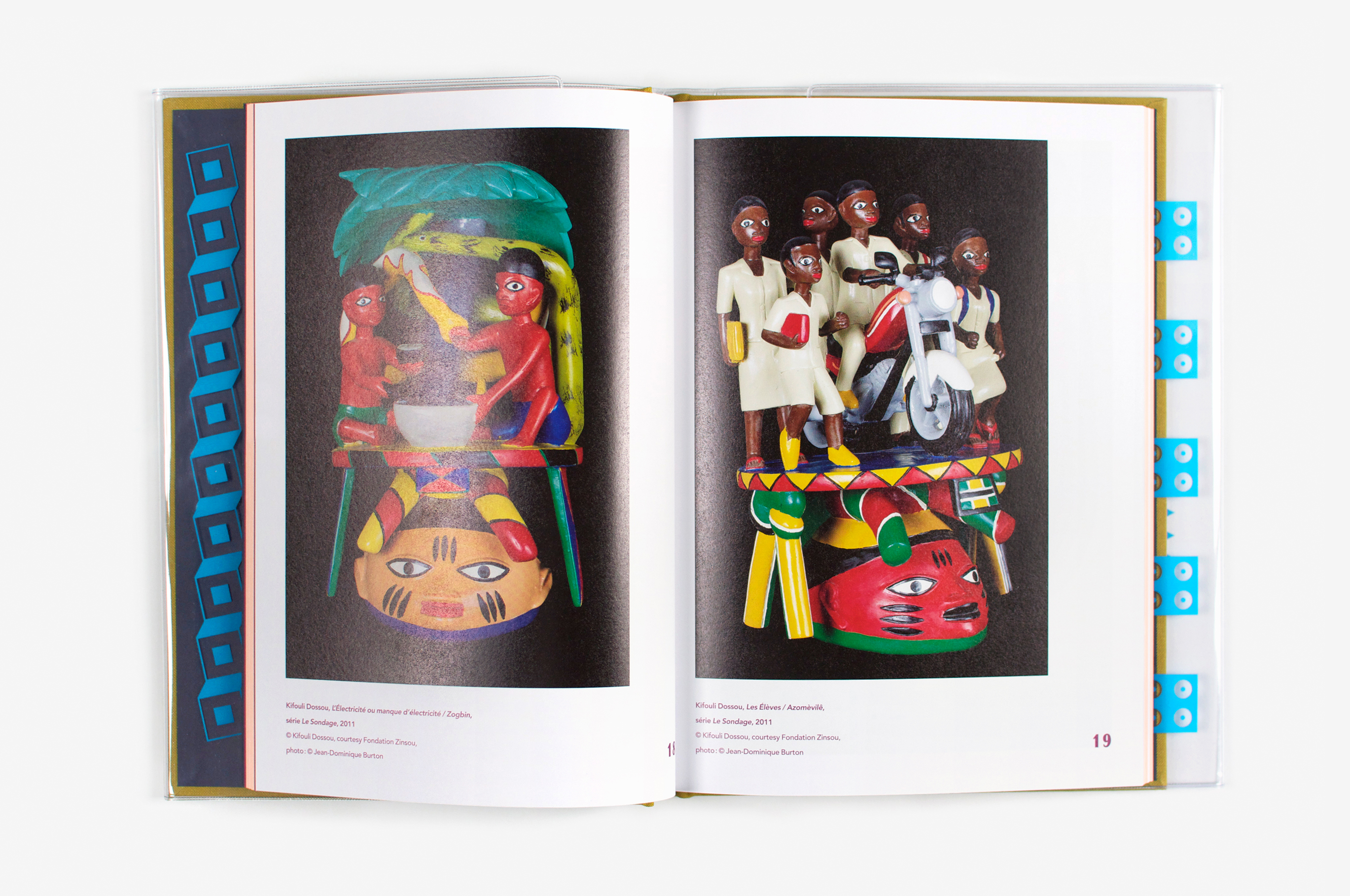 Cet ouvrage présente les travaux d’artistes contemporains africains dont les œuvres font écho aux cultures populaires de l’Afrique subsaharienne. Le contraste entre la matière plastique et la toile de la couverture évoque le métissage entre traditions et modernités. Des motifs inspirés de matières tissées folkloriques sont déployés sur la jaquette qui recouvre et protège le livre. Ils s’inscrivent dans un jeu de composition complémentaire avec la typographie, qui est dorée à chaud sur la couverture toilée. Cette idée de rythme et de tissage, qui structure la composition et la mise en page intérieure, est aussi présente dans la matière même de l’ouvrage: alternance ‘millefeuille’ des cahiers textes et images, tranchefile tissé noir et blanc…