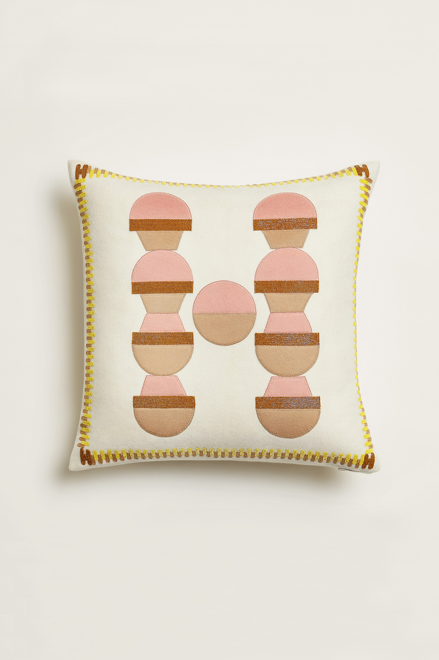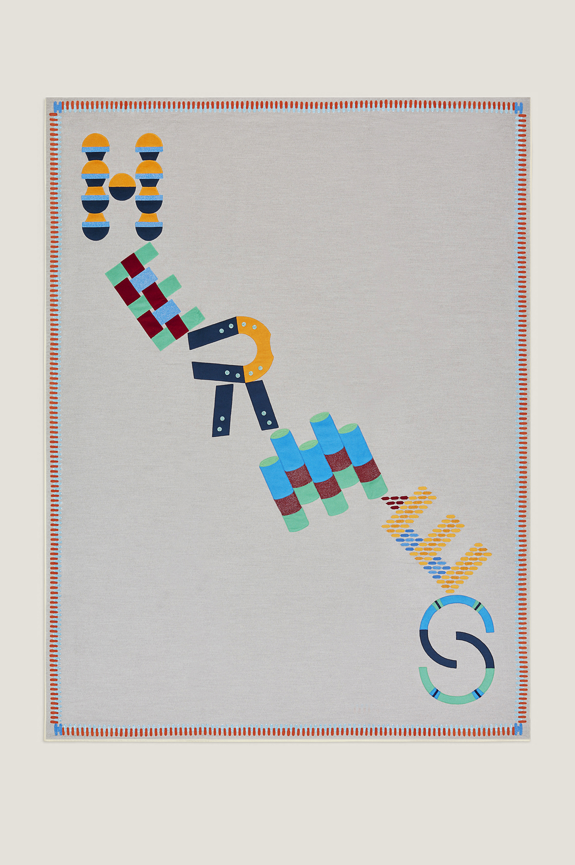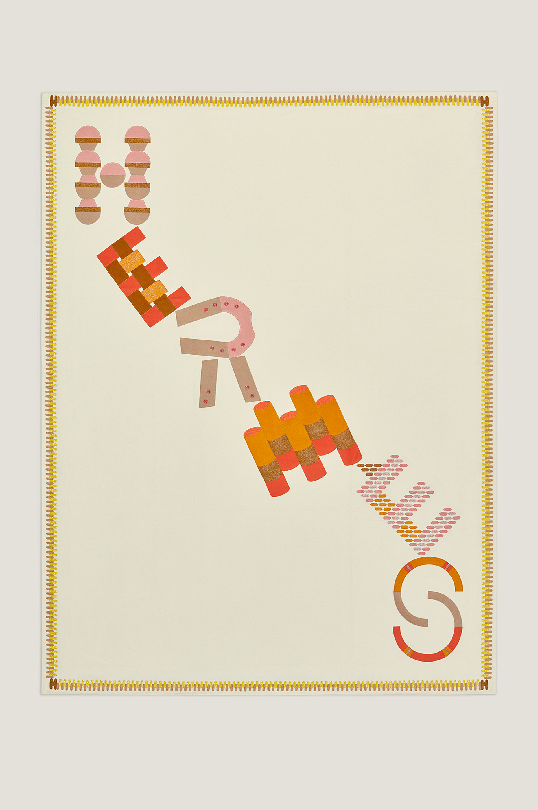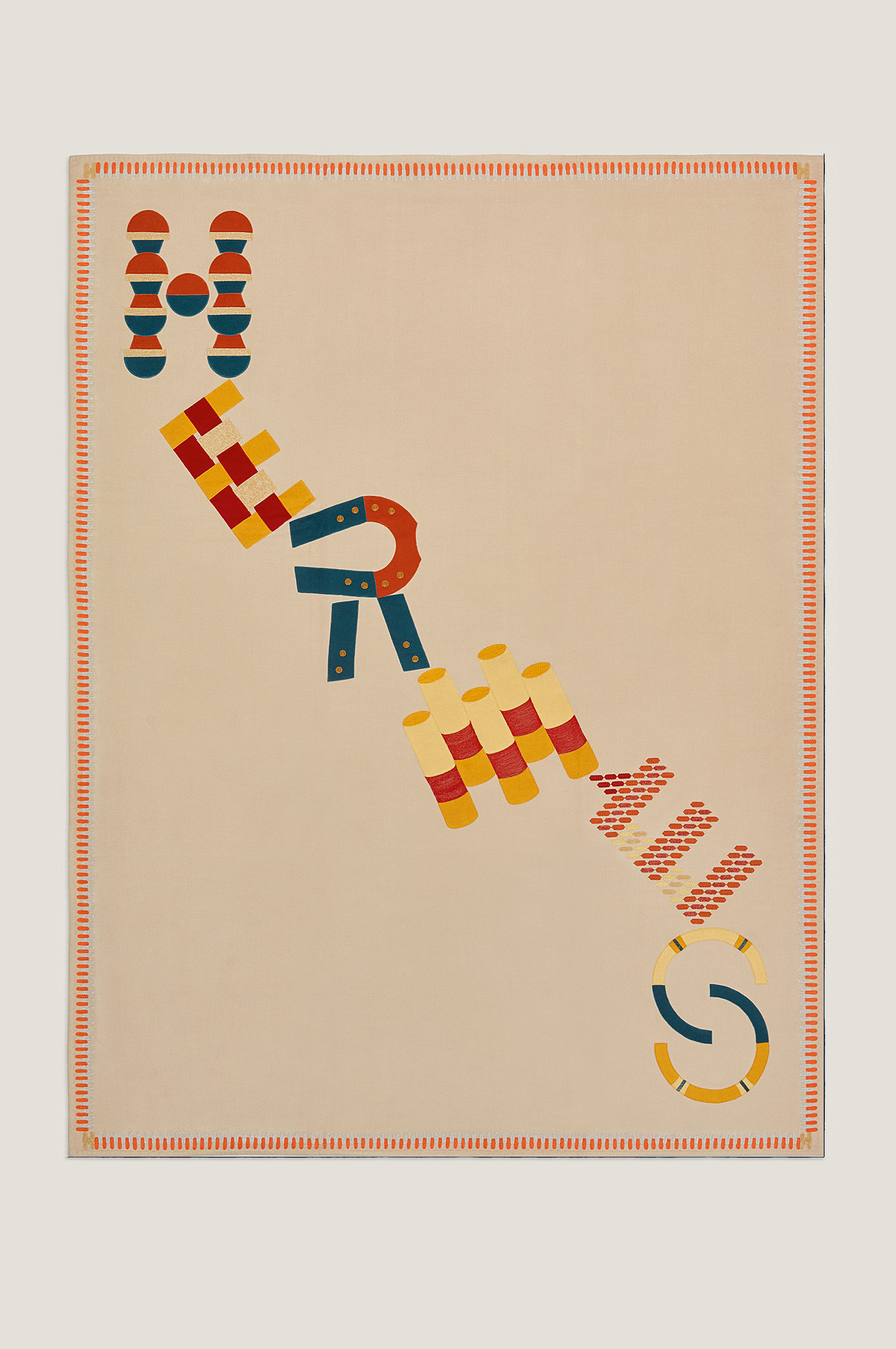 Le mot Hermès traverse, dans une diagonale joyeusement équilibriste, la surface du plaid. Chacune des lettres incarne dans son dessin un objet emblématique de la Maison, à la manière d’une quincaillerie typographique! Le H est un bouchon de flacon de parfum, le E un tissage de ceinture, le R un fer à cheval, le M est constitué de rouges à lèvres, le second E représente le point Sellier et enfin le S des barres d’obstacle emblématiques de l’équitation. Le coussin reprend uniquement le H.