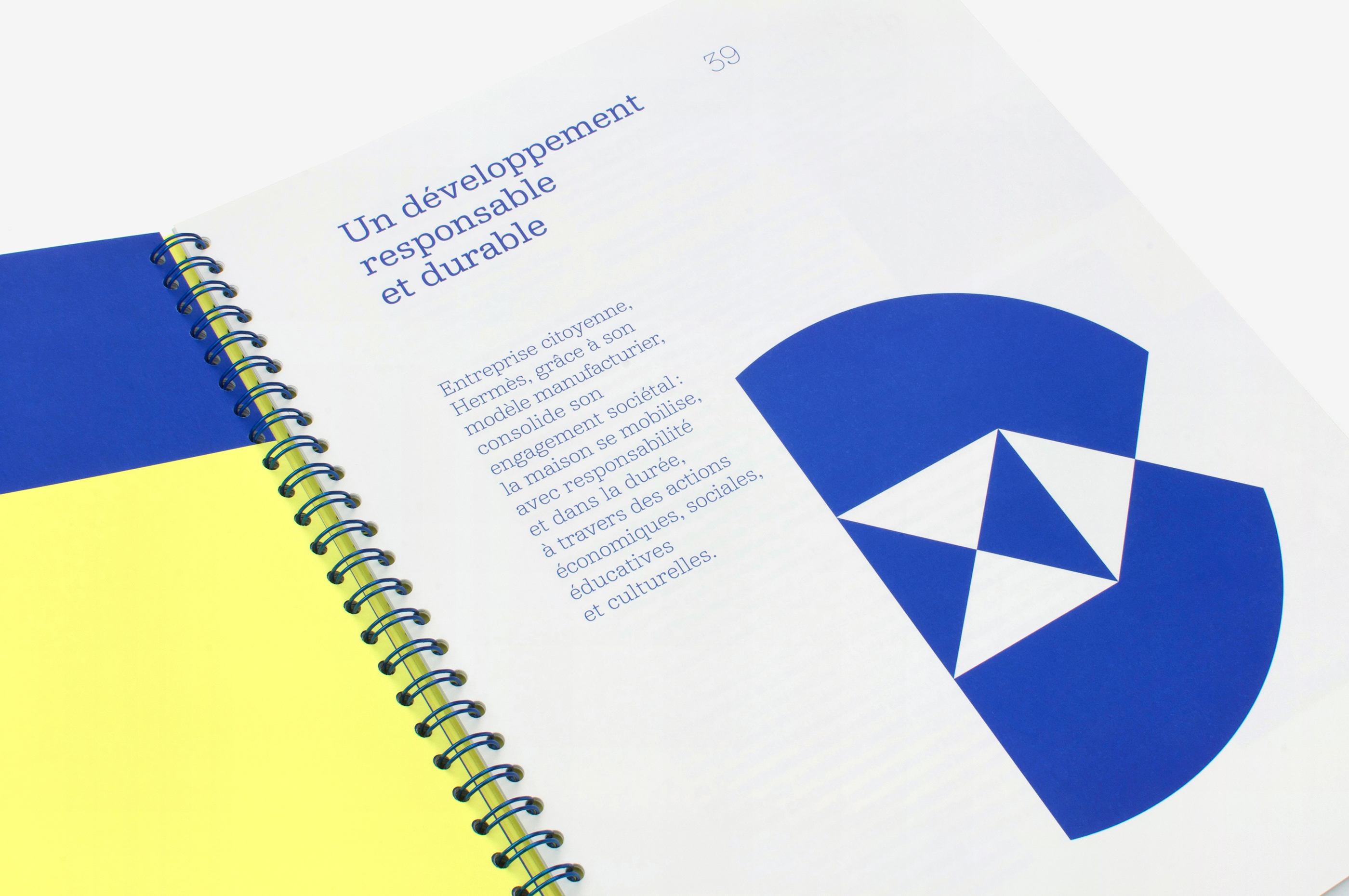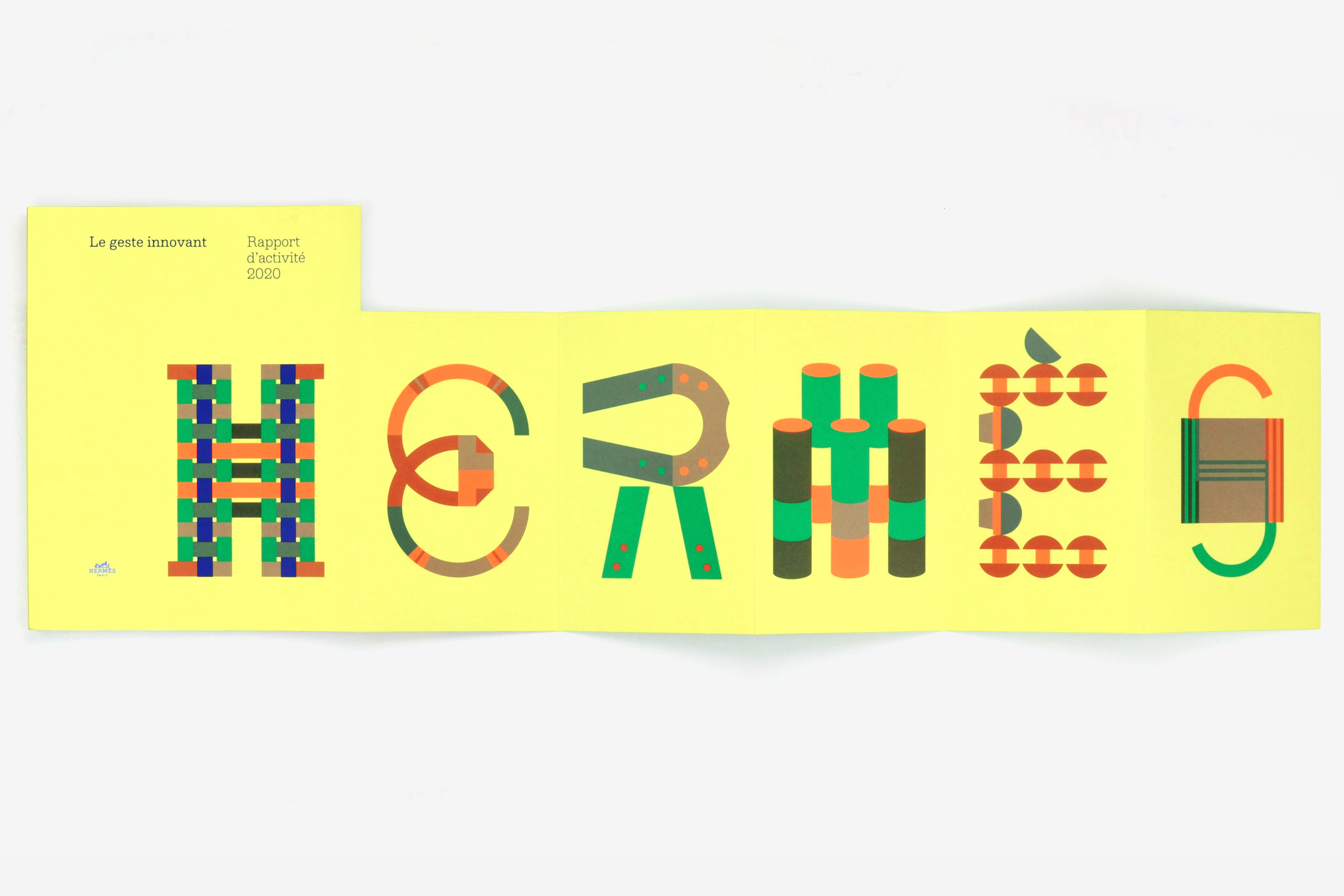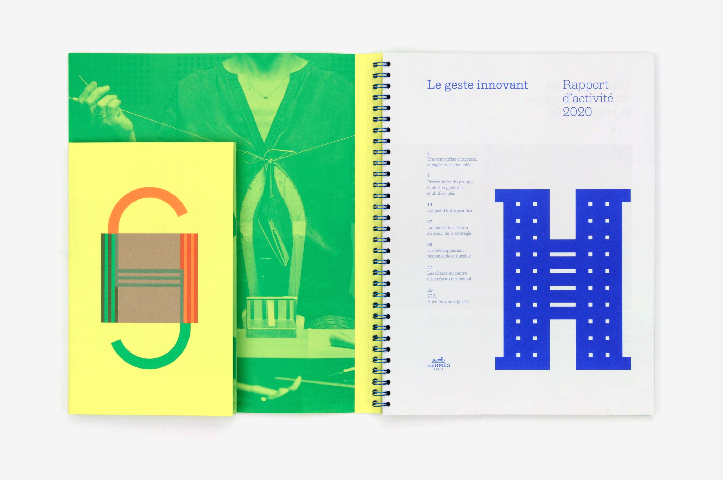 La thématique du «Geste innovant» a inspiré le graphisme de ce rapport d’activité. Les lettres H·E·R·M·È·S ont été dessinées à partir d’objets emblématiques: fers à cheval, bouchon de parfum, cuir tissé, cadenas… Elles se déploient en couleurs sous la forme d’un dépliant dont le verso est investi par une composition de photographies monochromes liées aux savoir-faire de la maison. Le principe des lettrines graphiques est repris sur les intercalaires à l’intérieur de la publication. La reliure spirale fait un clin d’œil aux codes des documents administratifs, ici bousculés par la sophistication du façonnage.