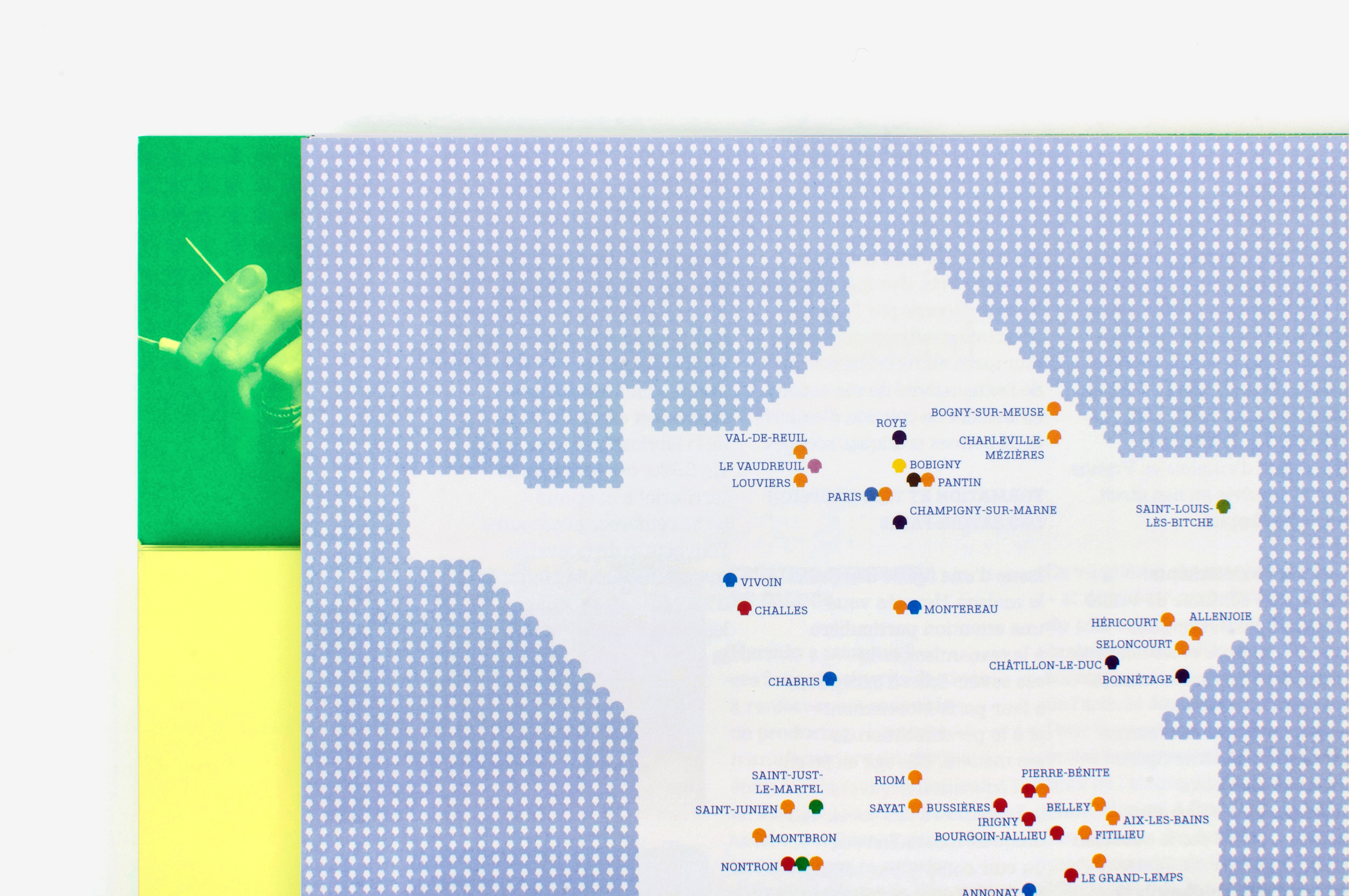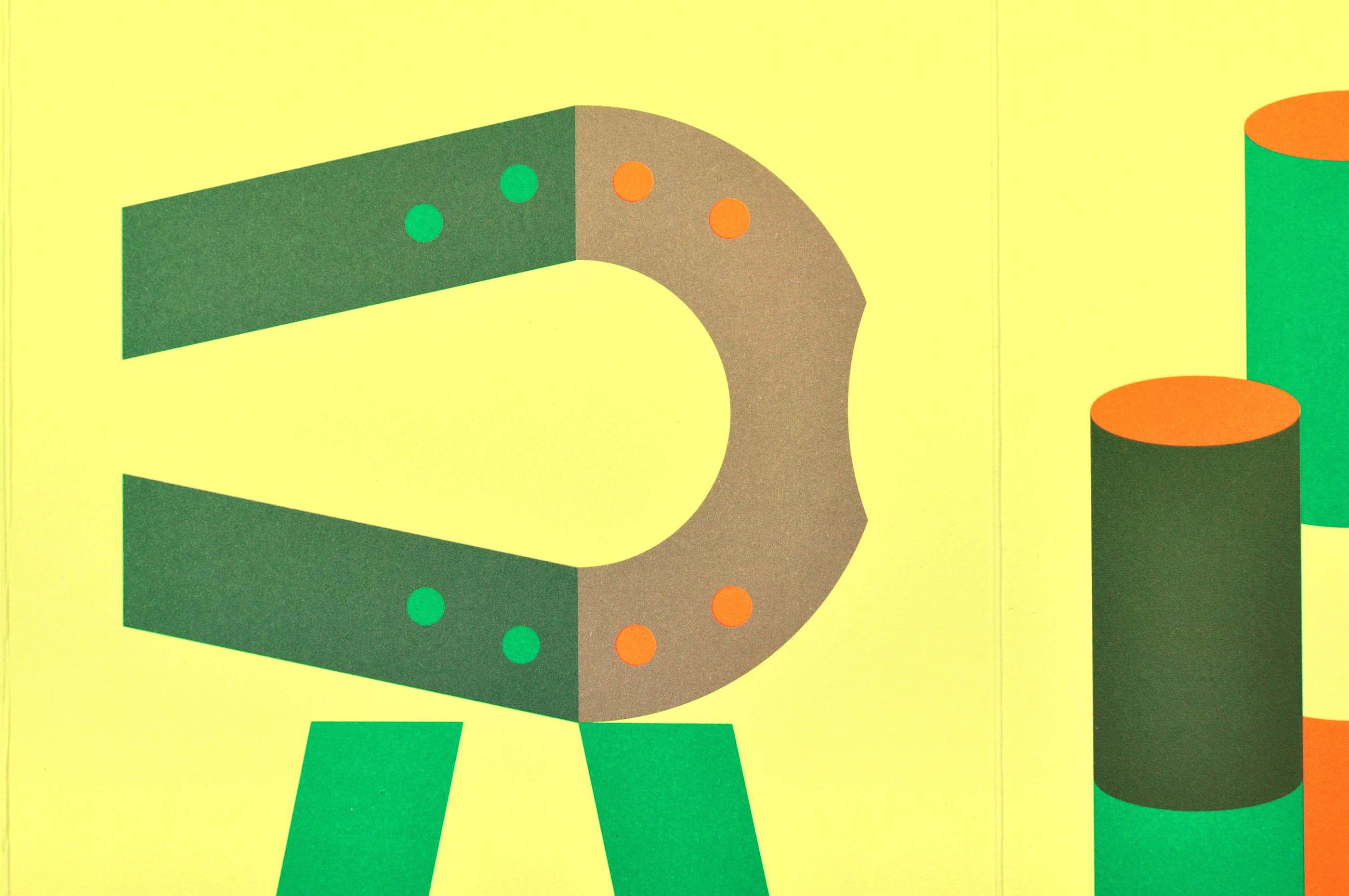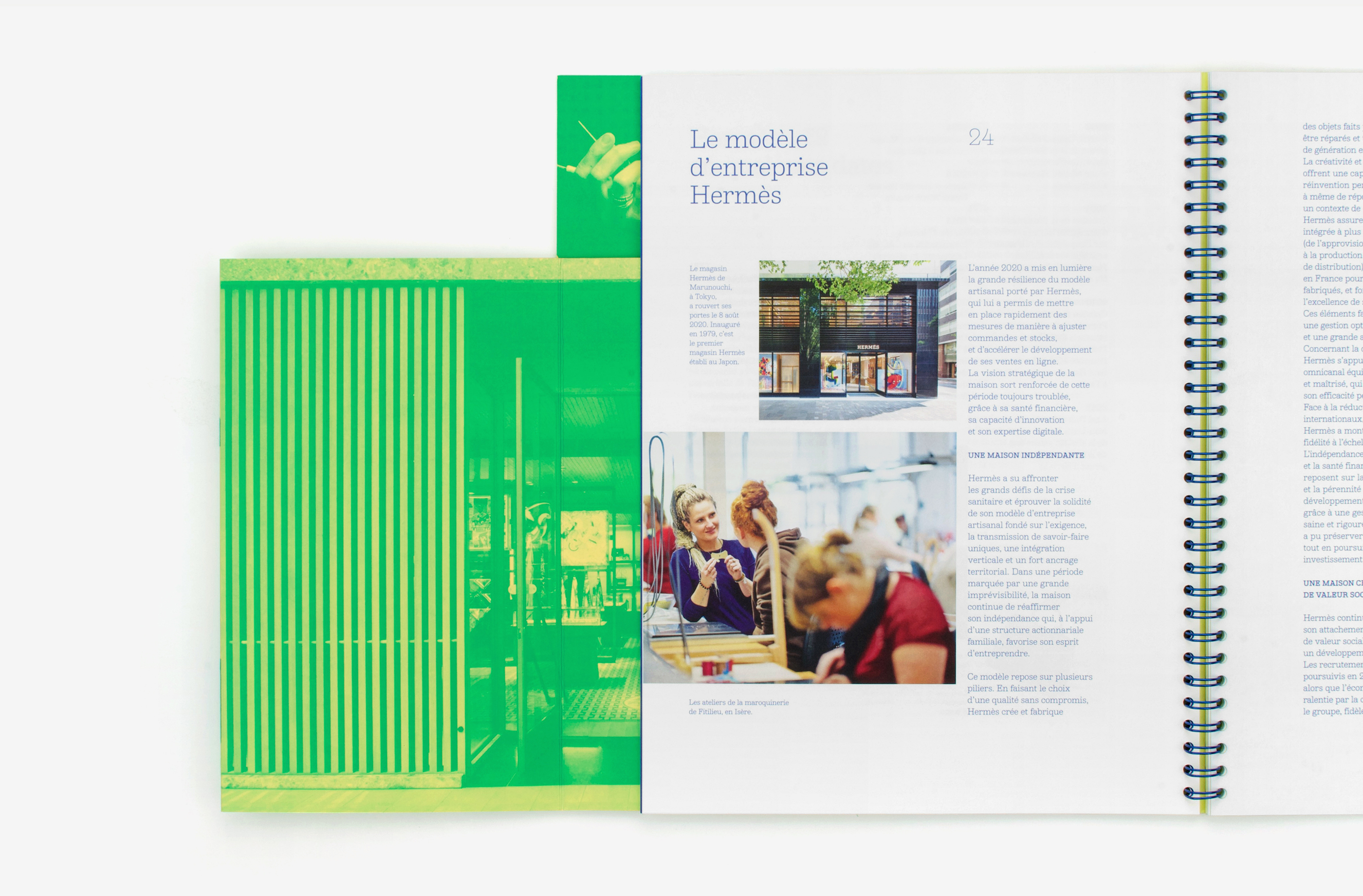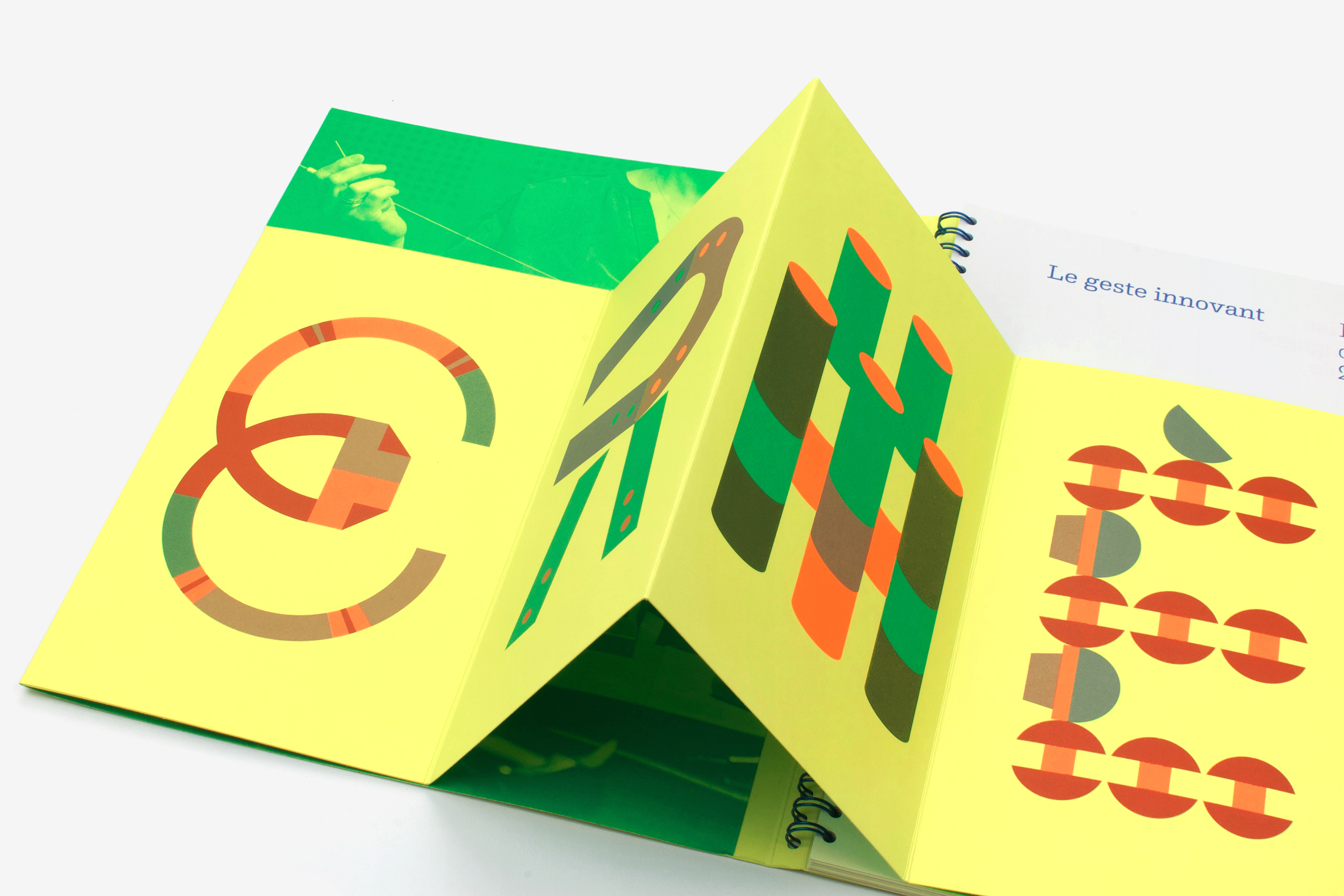 La thématique du «Geste innovant» a inspiré le graphisme de ce rapport d’activité. Les lettres H·E·R·M·È·S ont été dessinées à partir d’objets emblématiques: fers à cheval, bouchon de parfum, cuir tissé, cadenas… Elles se déploient en couleurs sous la forme d’un dépliant dont le verso est investi par une composition de photographies monochromes liées aux savoir-faire de la maison. Le principe des lettrines graphiques est repris sur les intercalaires à l’intérieur de la publication. La reliure spirale fait un clin d’œil aux codes des documents administratifs, ici bousculés par la sophistication du façonnage.