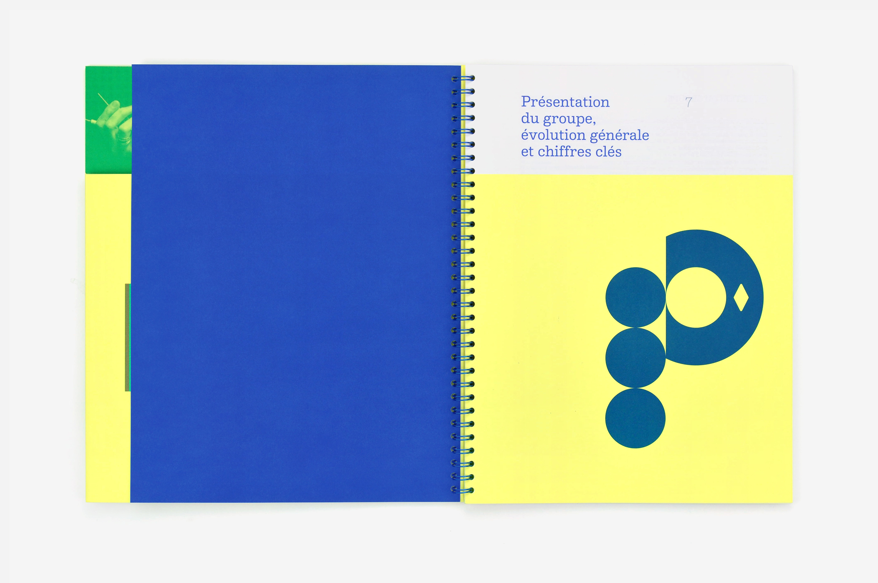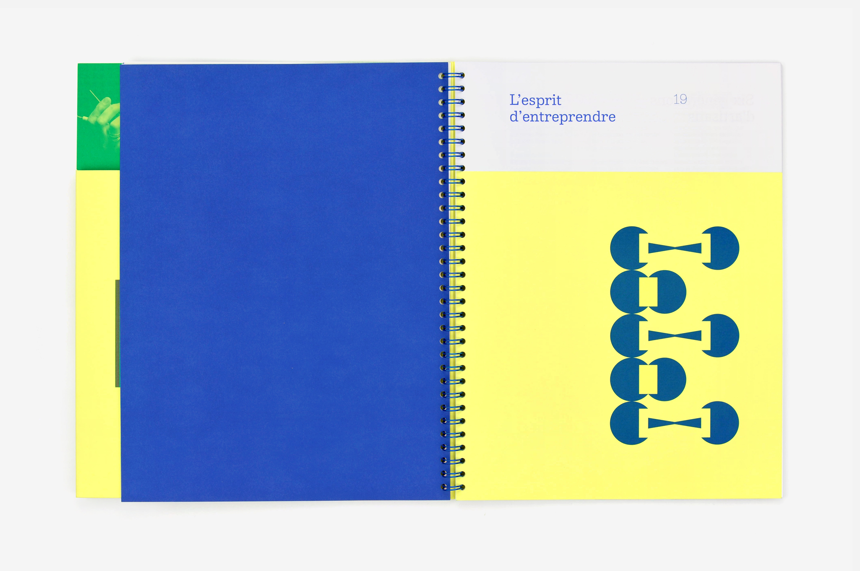 The graphic inspiration for this activity report was the theme of “Innovation in the Making”. The design of the letters H-E-R-M-È-S alluded to objects associated with the company: horseshoes, perfume stoppers, woven leather, padlocks, etc. The coloured images are fan-folded, the reverse side showing a composition of monochrome photographs linked to the company’s activities. Capital letters in a similar style are repeated on the dividers inside the publication. The spiral binding is a reference to the appearance of an administrative document, but here transformed by the sophistication of the overall product.