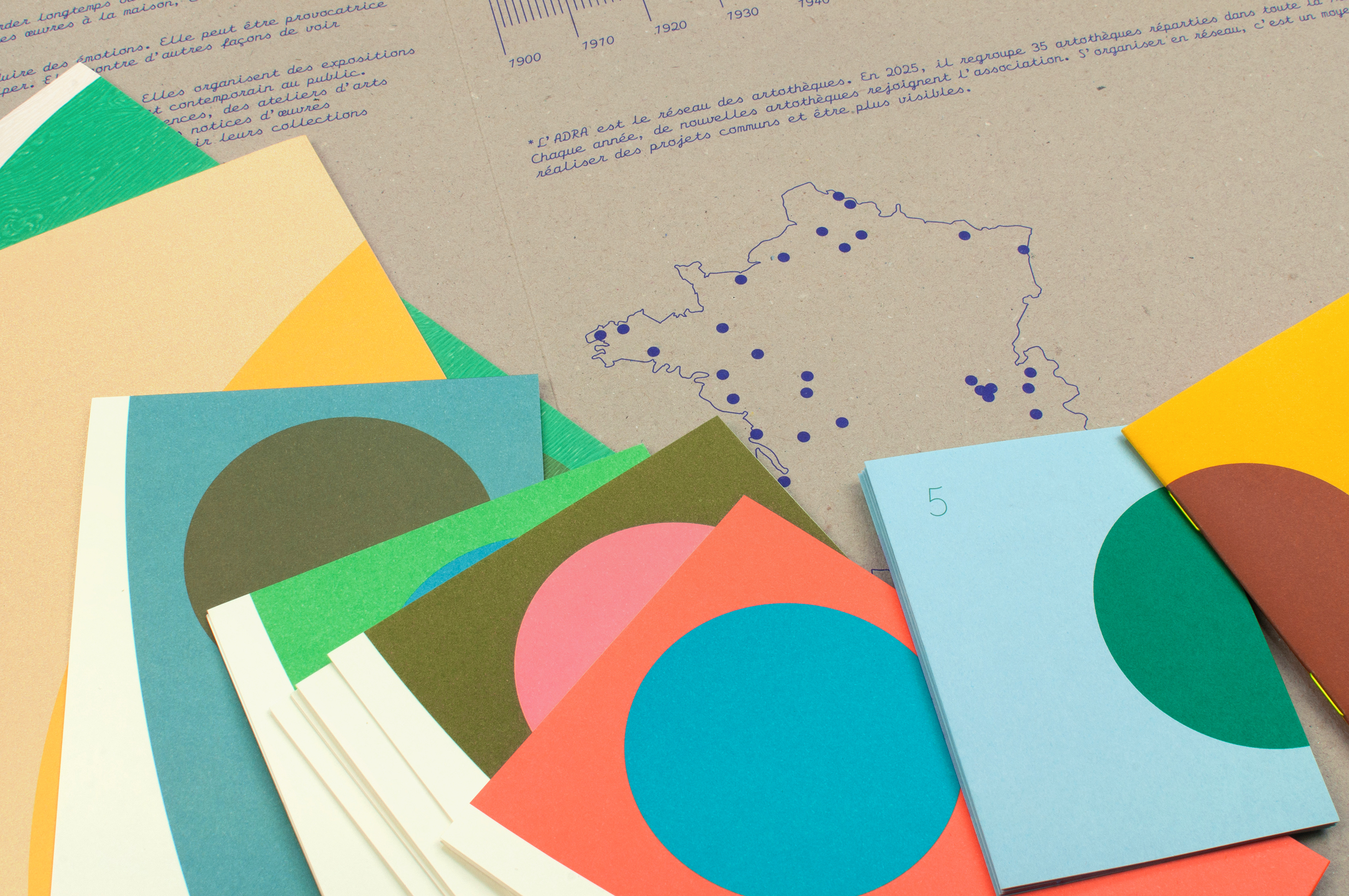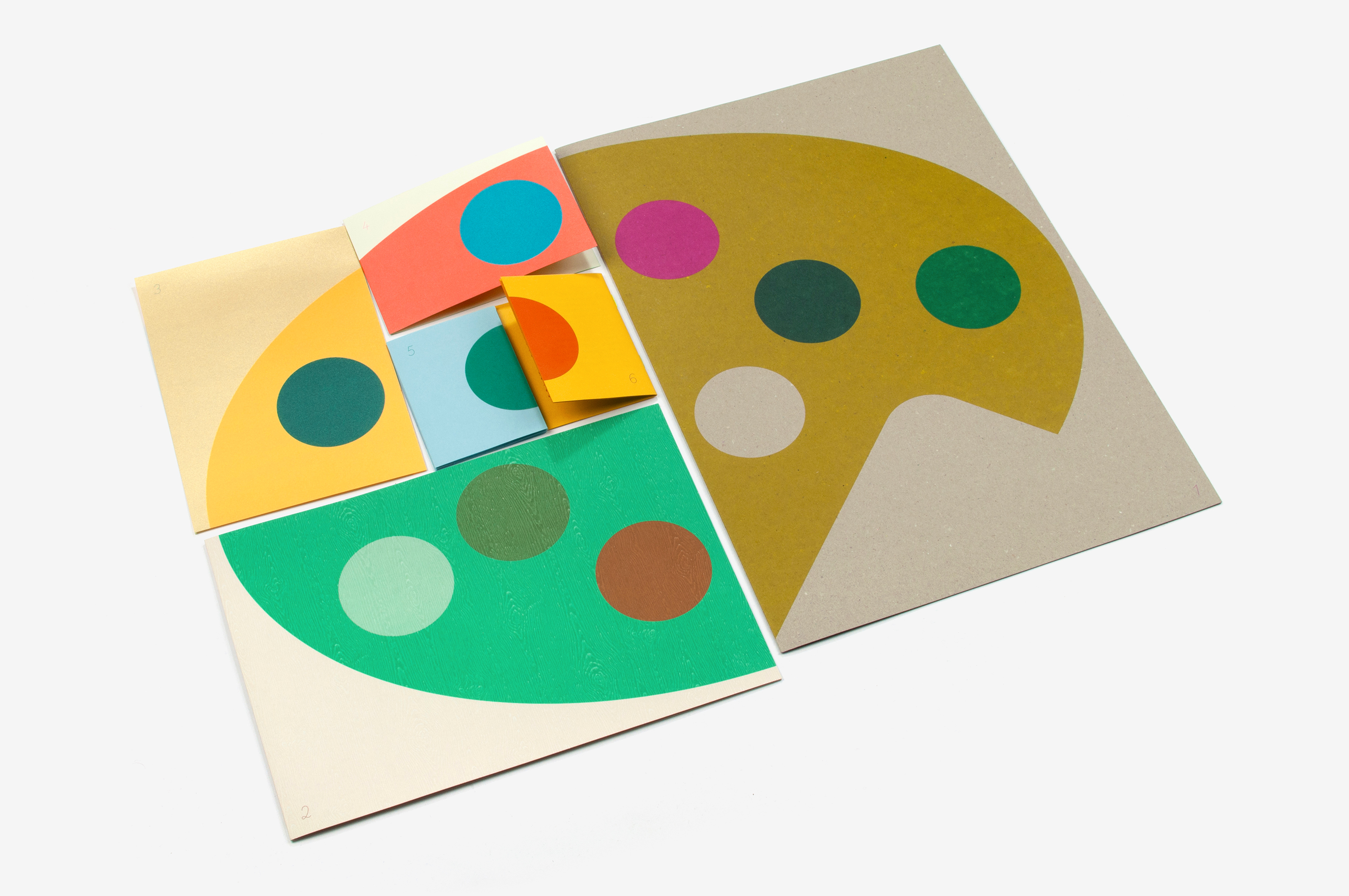 Jeu l’emprunte is an educational resource for the Association pour le Développement et la Recherche sur les Artothèques (Association for the Development and Research of Art Libraries). It allows secondary school pupils to learn about the visual arts in a fun way and discover what an art library is. It consists of several complementary materials (introduction, rules of the game, glossary, description guide, activity sheets, etc.). Laid out flat, these materials complement a device that displays a work of art on a wooden easel and recreate the overall image of a painter's palette. The iconic palette becomes, metaphorically, a tool for understanding the visual arts. Each item, printed on specific paper (rough, coloured, iridescent, etc.) and in a variety of colours, can be displayed either front or back. Thus, the image of the palette is both composite and evolving. The Olympe script typeface, with its old-style fixed pitch, allows for the imaginative imitation of the kind of teaching materials that teachers used to make.