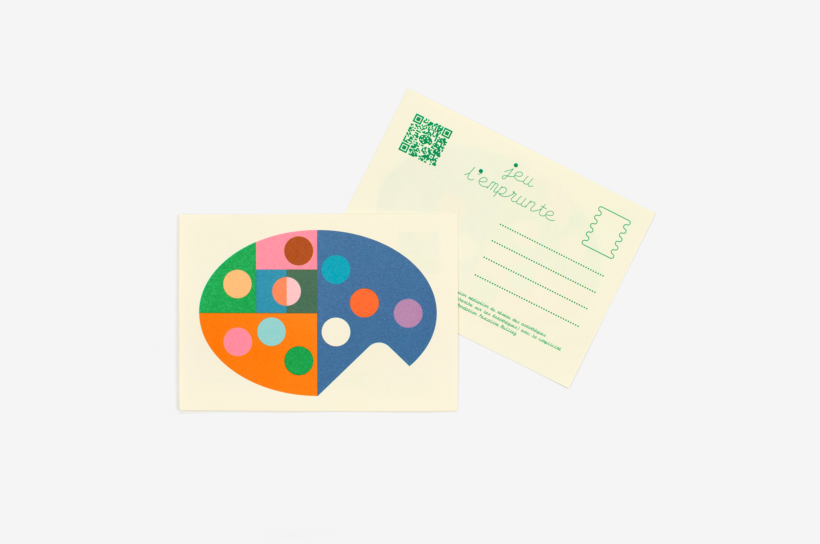 Jeu l’emprunte est un outil pédagogique proposé par l’Association pour le Développement et la Recherche sur les Artothèques. Il permet aux collégien·ne·s d’être sensibilisé·e·s aux arts visuels de manière ludique et de découvrir ce qu’est une artothèque. Cet outil est constitué de plusieurs supports complémentaires (présentation, règles du jeu, lexique, aide à la description, fiches mission, etc). Disposés à plat, ces supports complémentent un dispositif qui présente une œuvre sur un chevalet en bois, et recomposent l’image globale d’une palette de peinture. L’outil iconique de la palette devient, de façon métaphorique, un outil de compréhension des arts visuels. Chaque support, imprimé sur un papier spécifique (brut, coloré, iridescent…), et avec des couleurs variées, peut être disposé recto ou bien verso. Ainsi, l’image de la palette est à la fois composite et évolutive. La typographie Olympe, avec son dessin script et mécanique, permet de mimer avec fantaisie les documents vintage auto-édités par les professeurs.