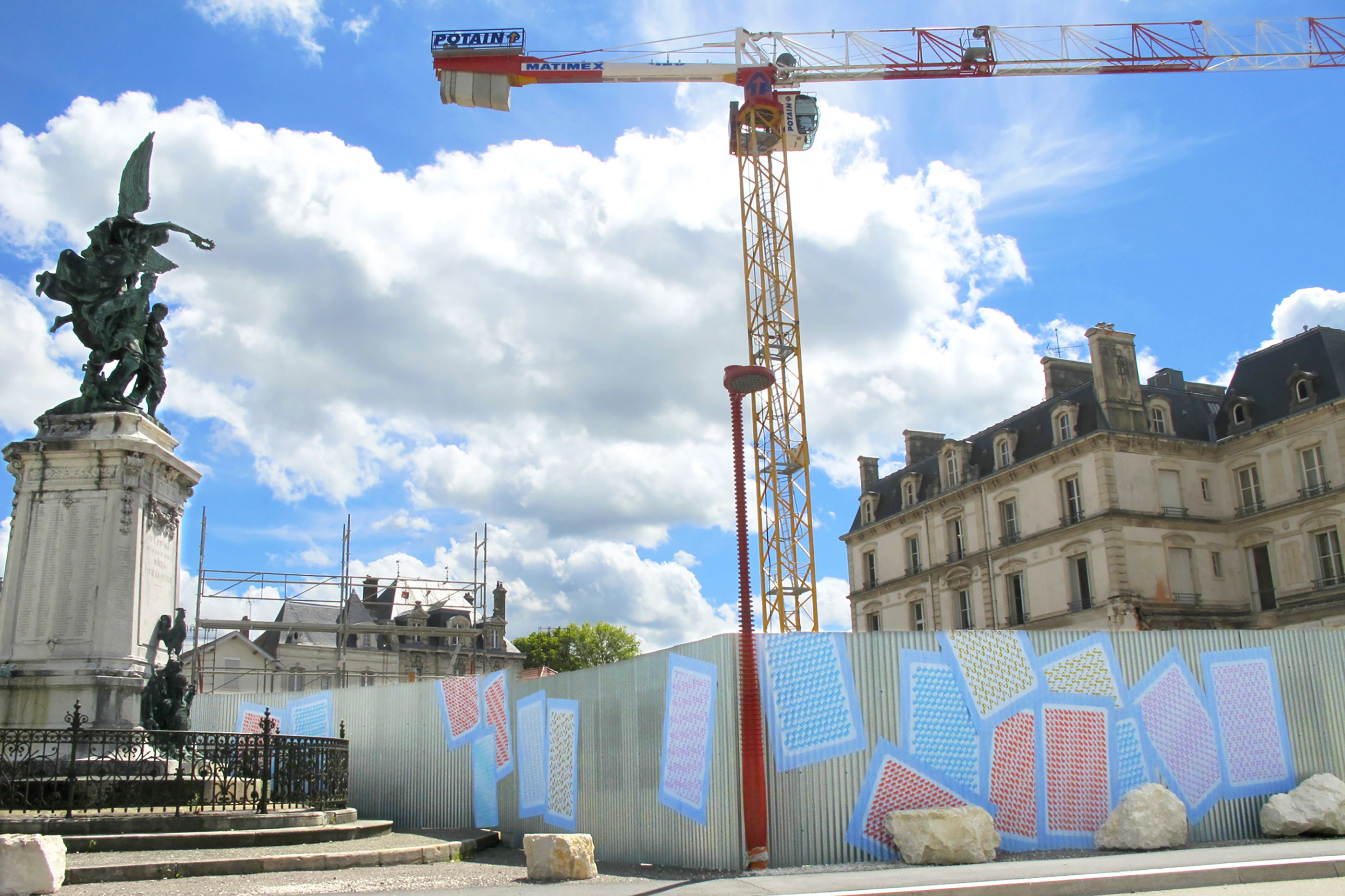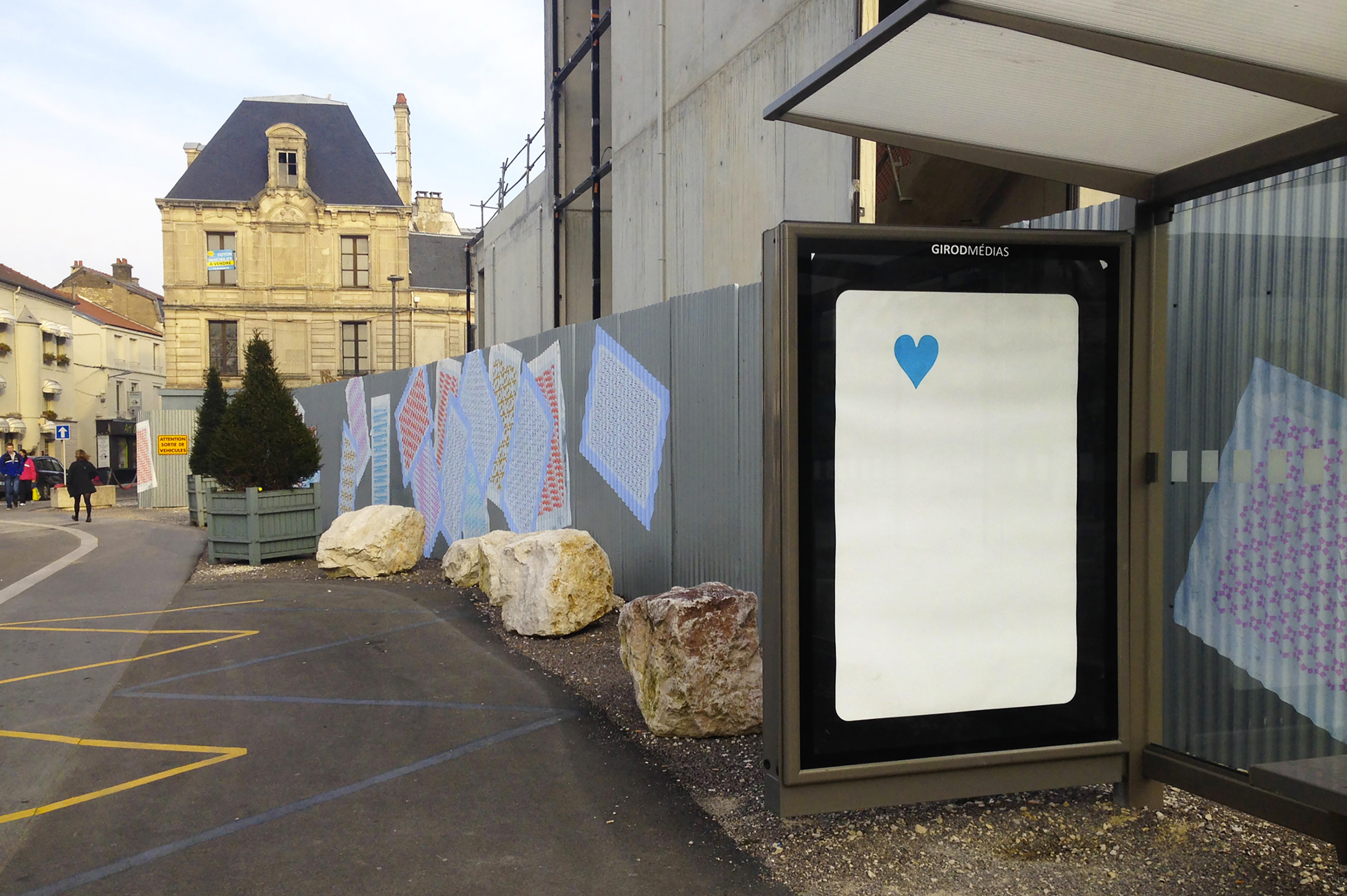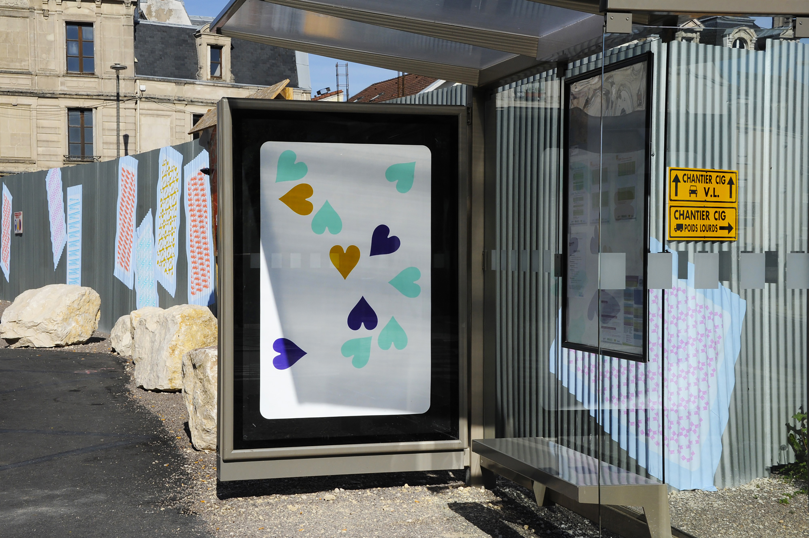 J’ai investi la palissade du chantier du Signe, centre national du graphisme à Chaumont avec les faces tarotées d’un jeu de cartes. Imprimées sur le dos bleu du papier affiche, elles sont recouvertes de motifs créés à partir de chacun des logos des 6 partenaires – ou acteurs – du chantier. Un clin d’œil à ce support parfois investi comme support publicitaire. Elles sont collées de façon irrégulière et recouvertes au fil du temps, comme un jeu de cartes en vrac, jouant avec le relief de la palissade. En regard, certains panneaux d’affichage de la ville sont occupés avec le recto de ces cartes à jouer. Imprimées sur la face affiche du papier, elles déploient leur motif de façon aléatoire, comme un virus. Cœurs sur la ville!
