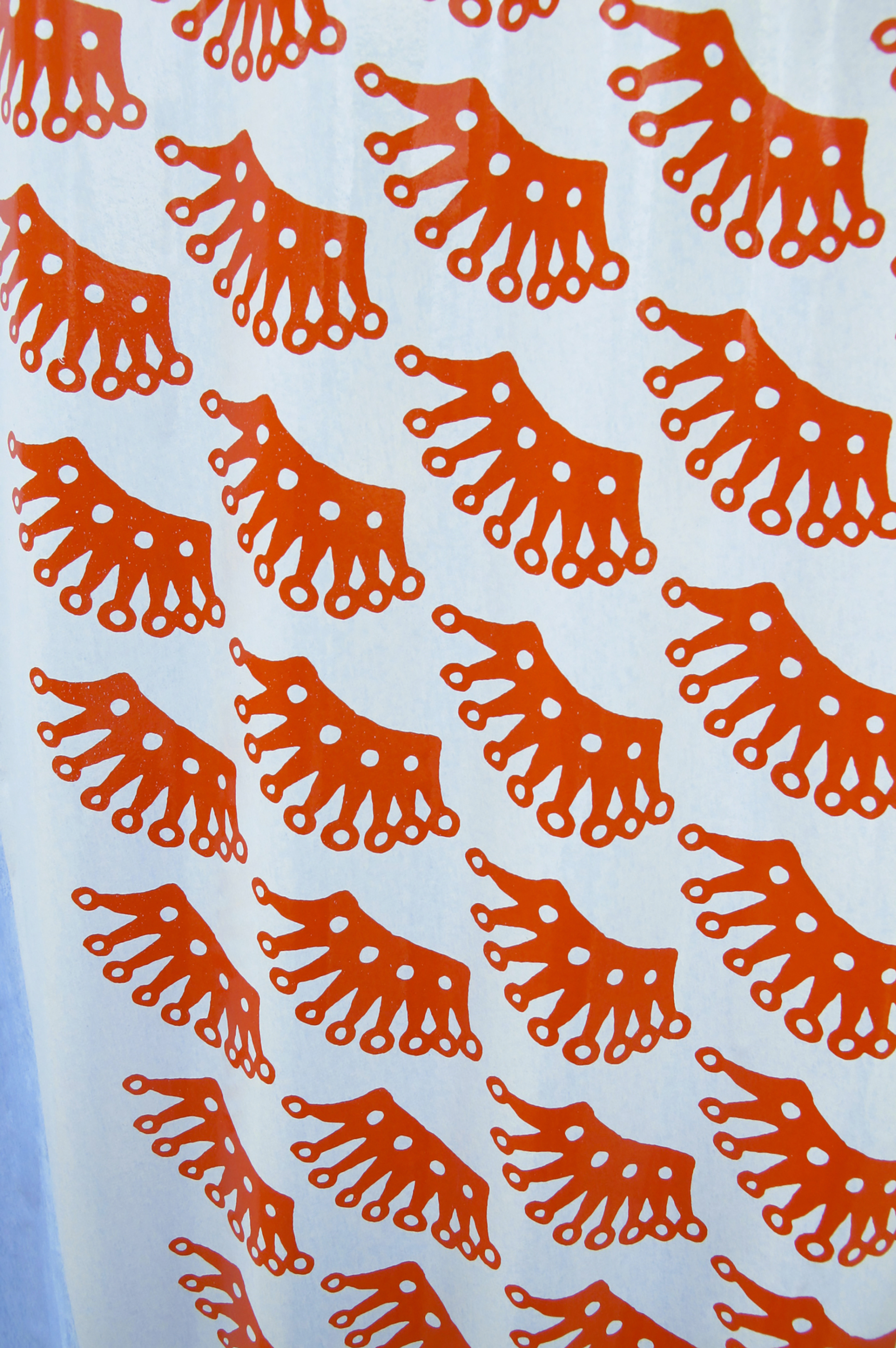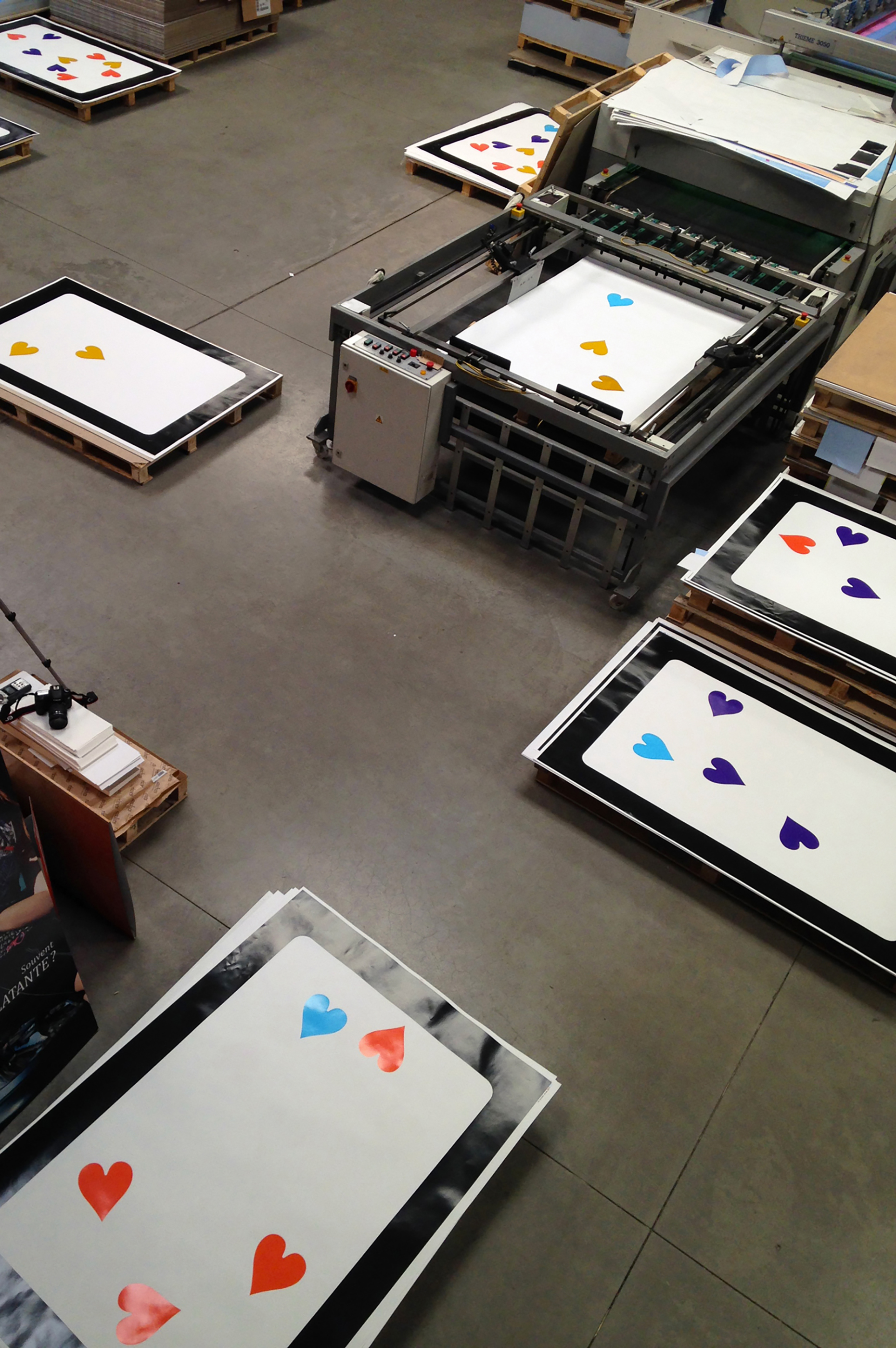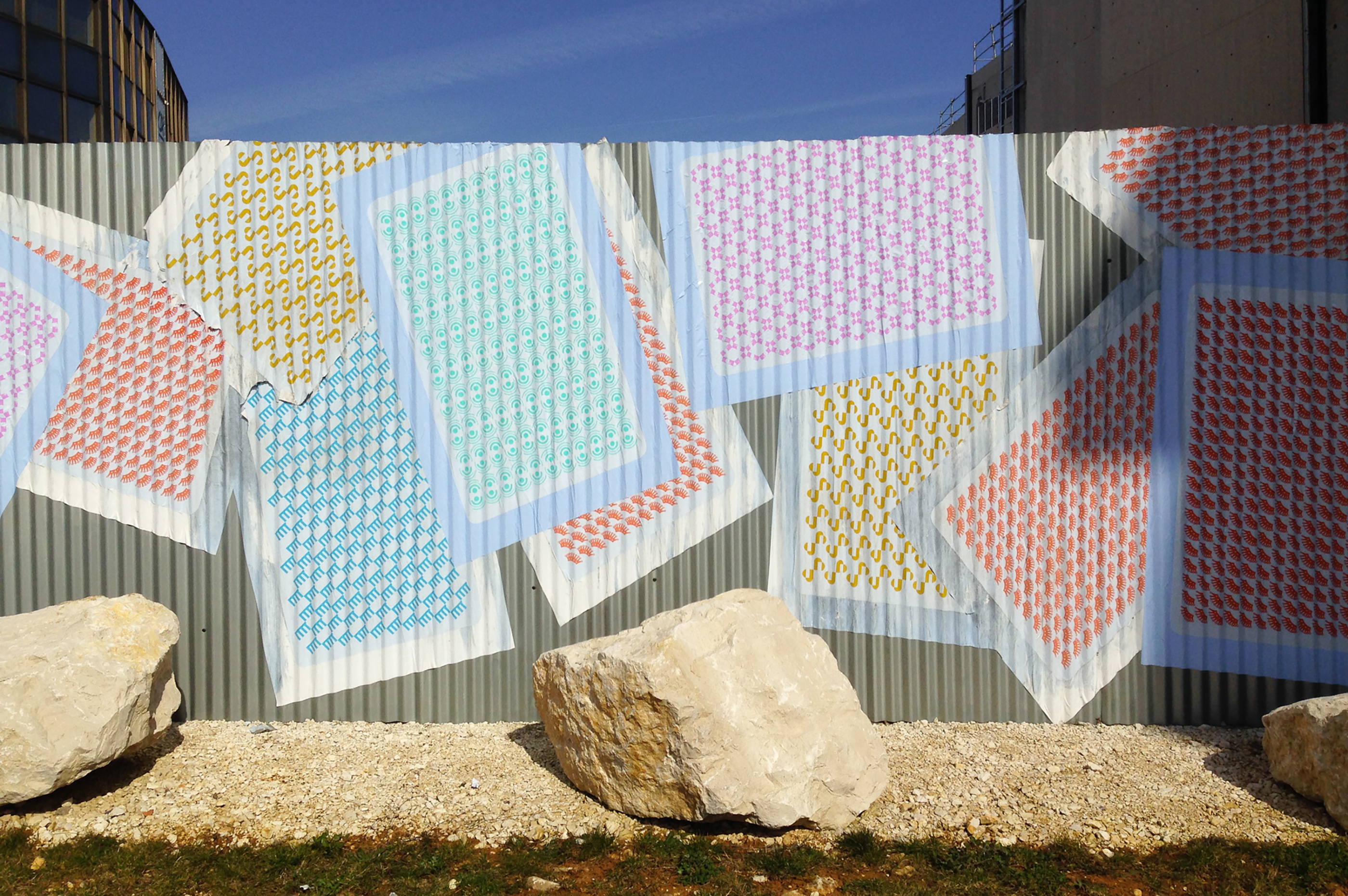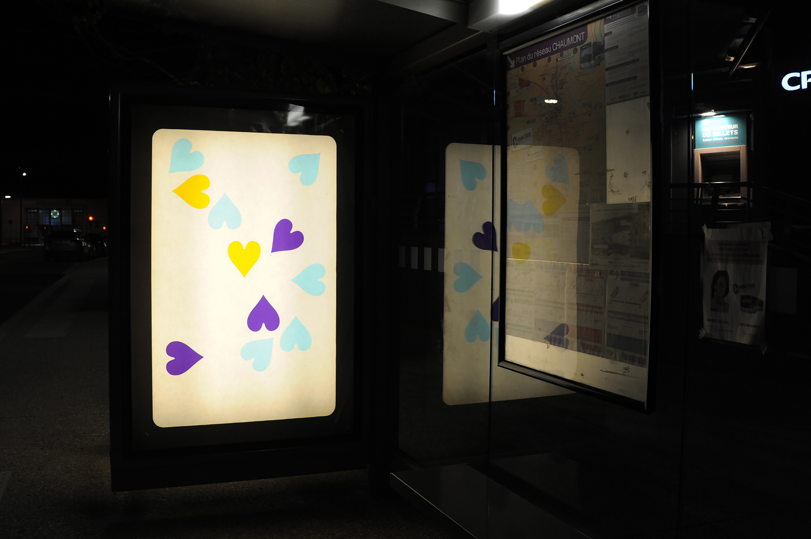 I decorated the metal fence surrounding the construction site for the International Centre of Graphic Design in Chaumont, with tarot-like faces of playing cards. Printed on the backside of blue poster paper, they’re covered with patterns, each inspired by one of 6 logos representing the sponsors – or contributors – to the site. A nod to the common use of this format, for advertising exposure. They are glued irregularly and overlap here and there, like a loose deck of cards, playing with the corrugated relief of the fence. In reply, certain billboards in the city display the front of the playing cards. Printed on the front side of the poster paper, their pattern is displayed randomly, like a virus. Hearts all over the town!