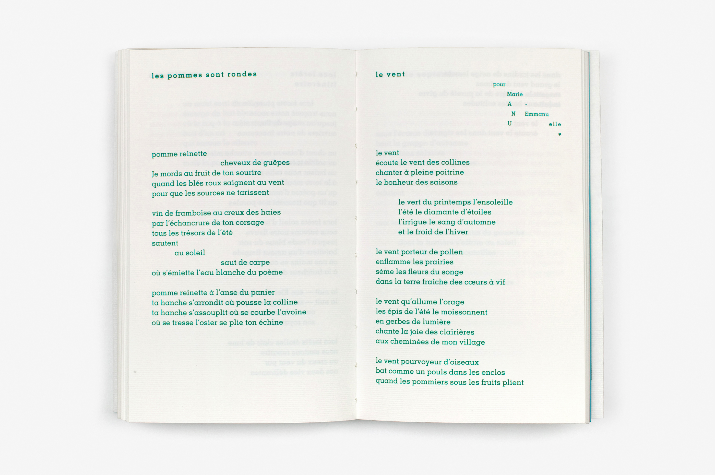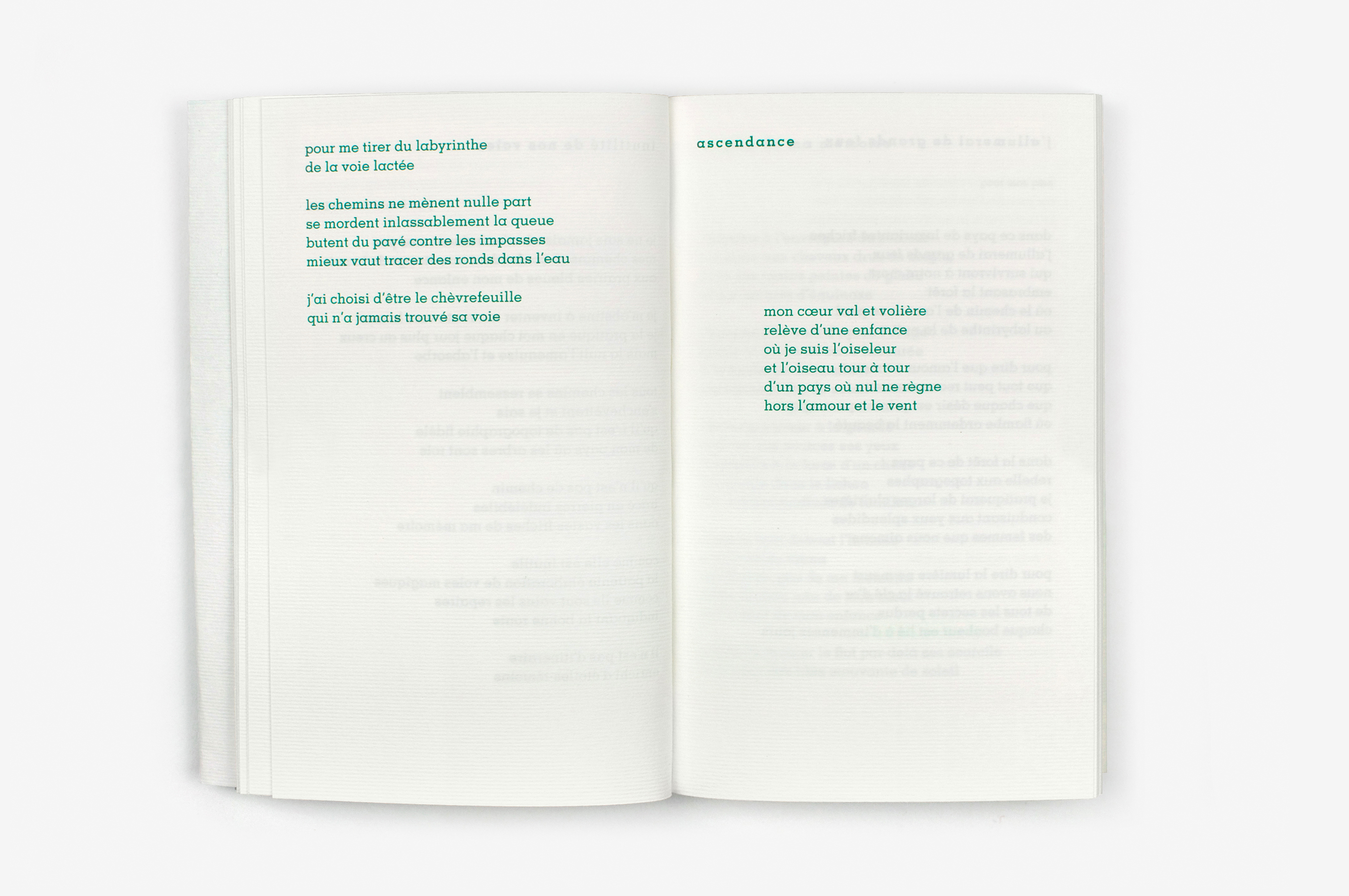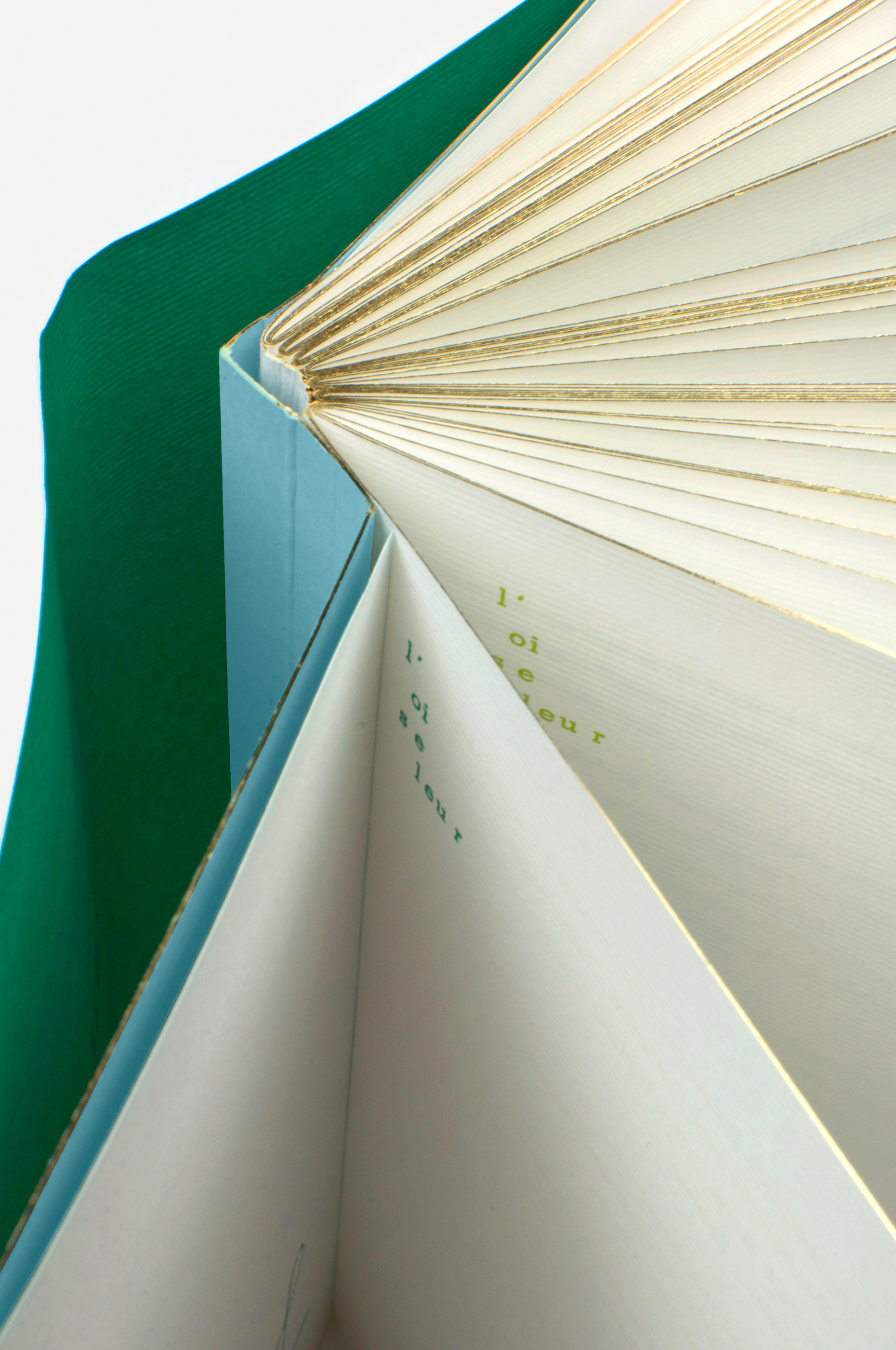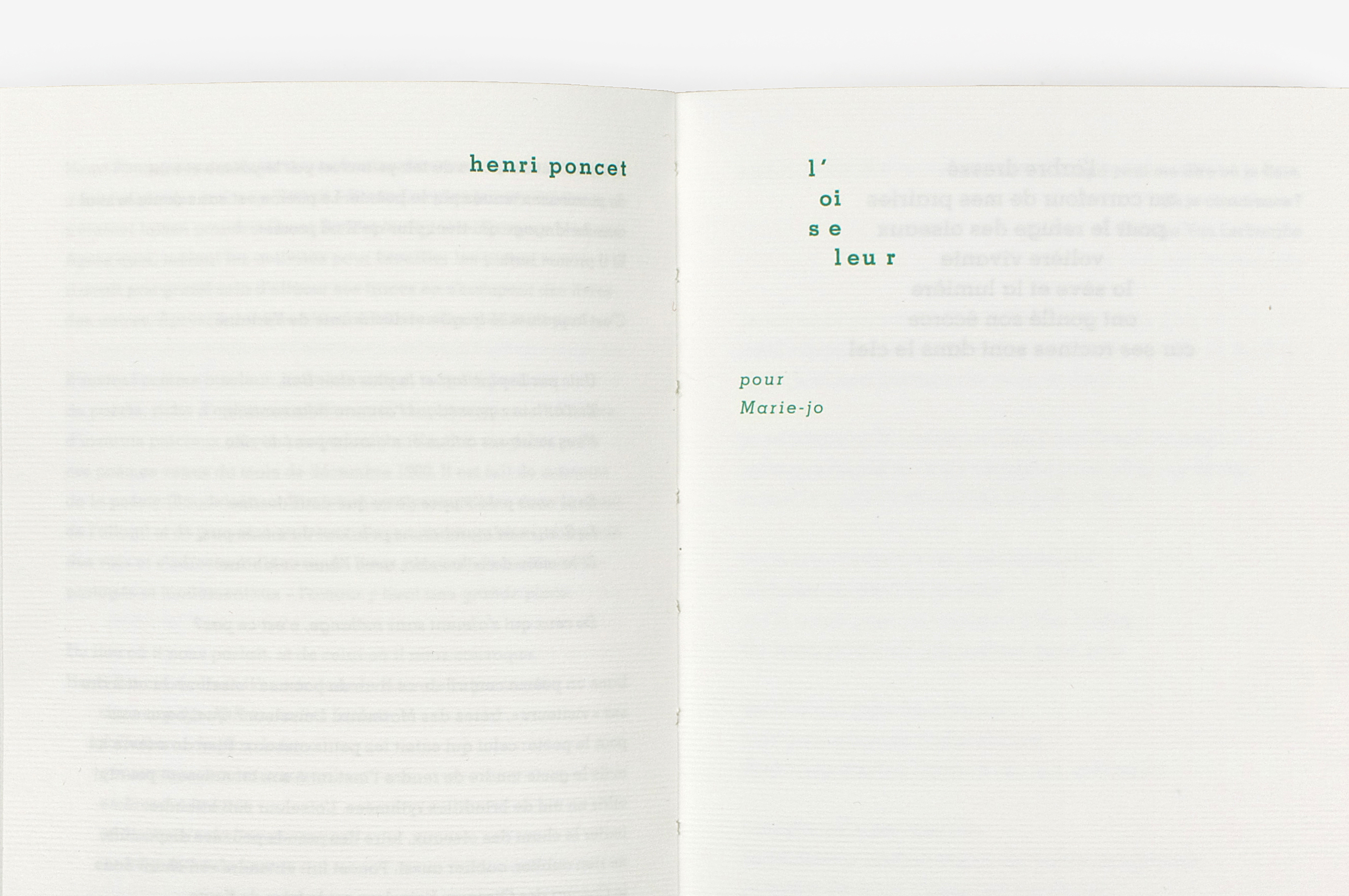 This work, particularly dear to my heart, is a reissue of a collection of poems written in 1960 by my grandfather Henri Poncet. Although known as a successful publisher, setting up éditions Comp’Act and later ActMêm, he was less well known as a poet (indeed, he himself did his best to throw people off the scent!). This wonderful poetry lurked on the page in shredded strips, passed around like secret messages. It was necessary and urgent to republish the text of L’oiseleur in color. The little book with its gilded top edge seems to thank us: it opens itself. I am determined to believe that this is not only because of the weight of the paper!