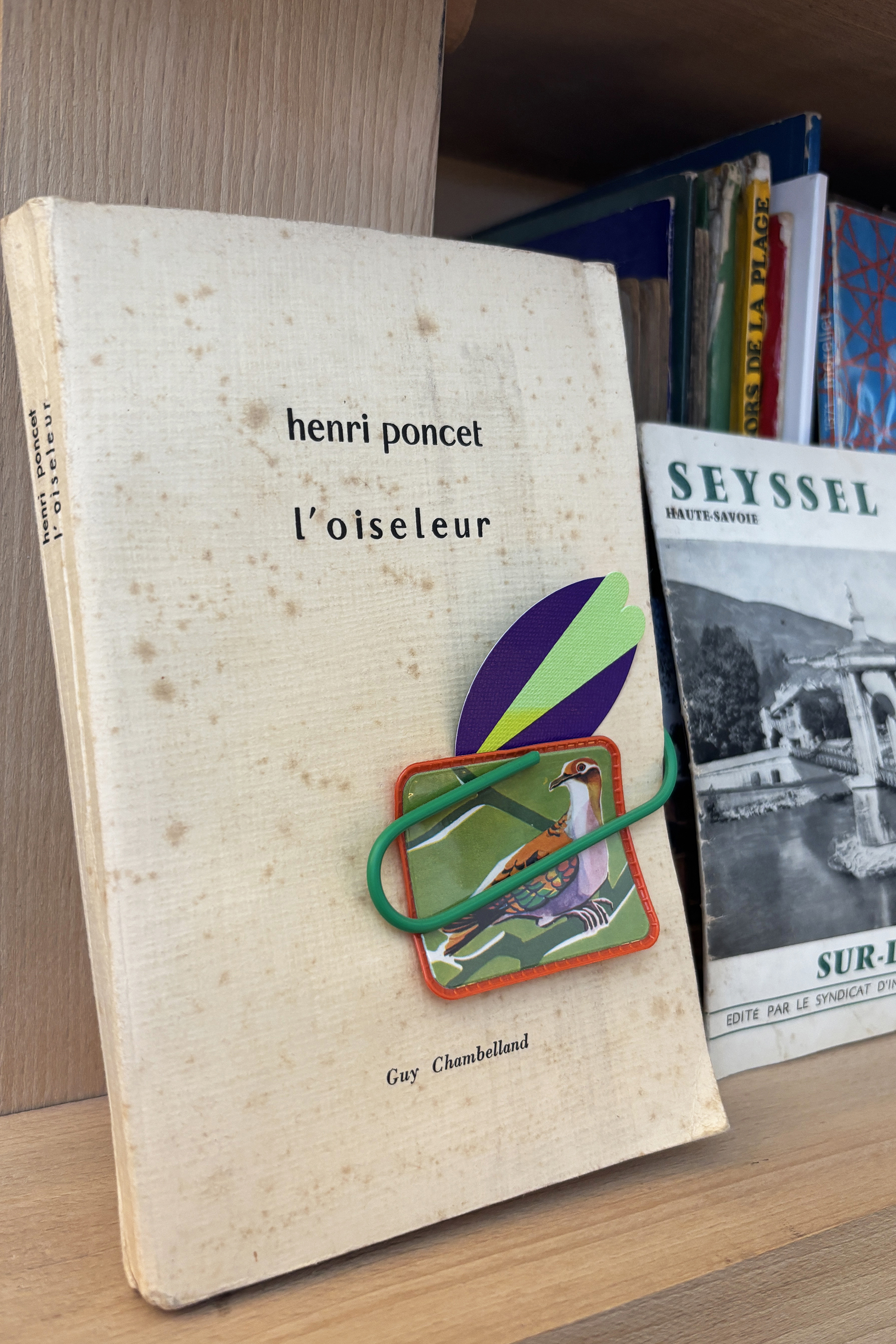 Cet ouvrage, cher à mon cœur, est la réédition du recueil poétique écrit par mon grand-père Henri Poncet en 1960. Celui-ci a fait un remarquable parcours d’éditeur, en fondant les éditions Comp’Act puis l’ActMêm, mais il a été finalement peu connu en tant que poète (il s’est employé lui-même a brouiller les pistes!). Le miracle de cette poésie était tapi sur des pages en lambeaux, disséminées à la manière d’un secret. Il était nécessaire et urgent de rééditer L’oiseleur en encre de couleur. Le petit livre, à la tranche dorée en tête, semble nous remercier: il s’ouvre tout seul. Je persiste à croire que ce n’est pas seulement lié au grammage du papier!