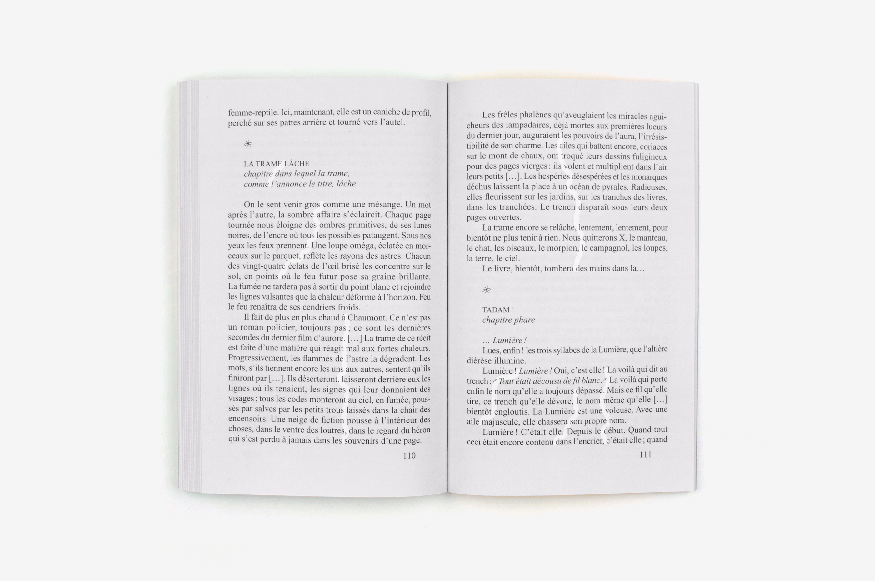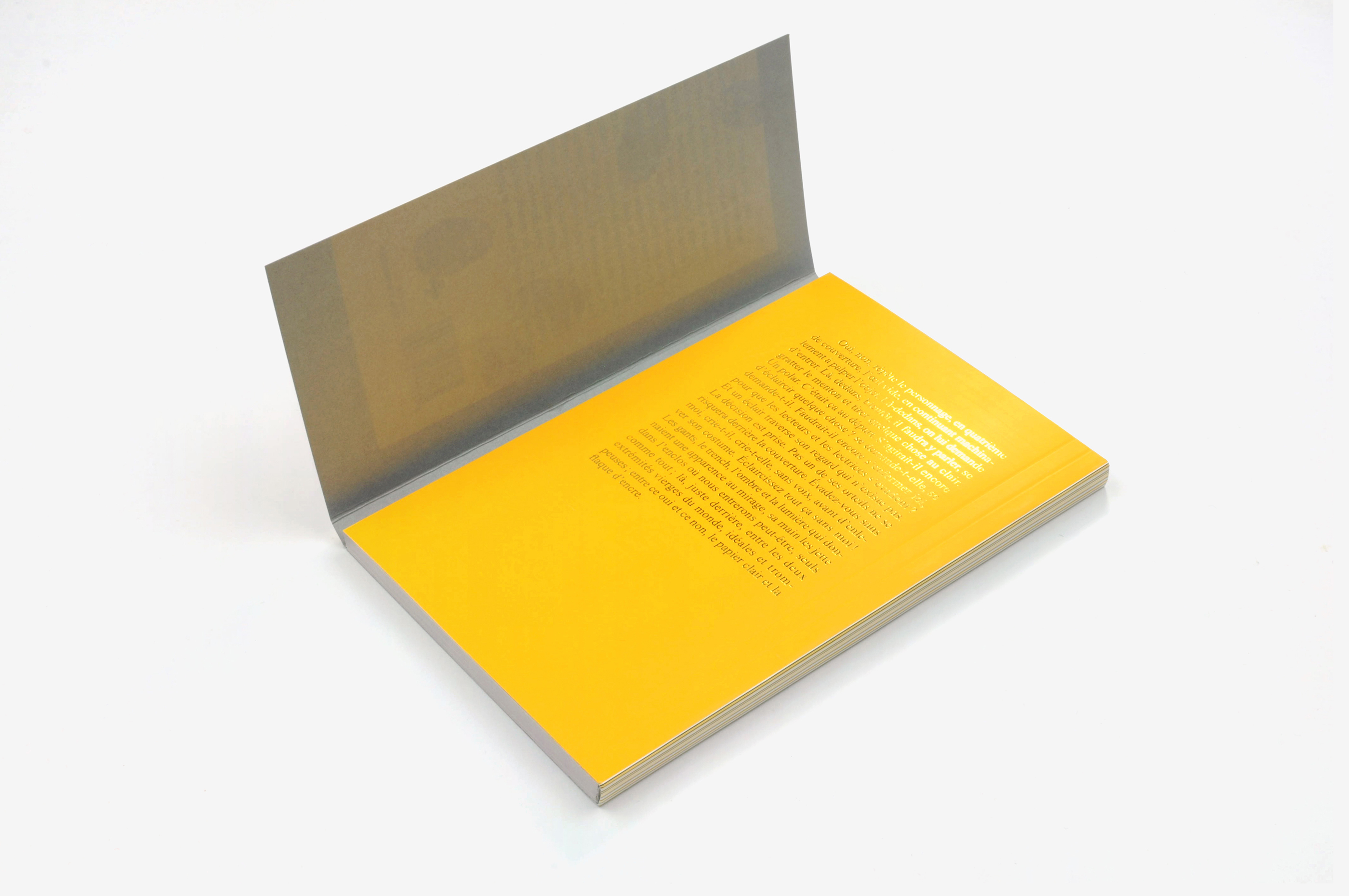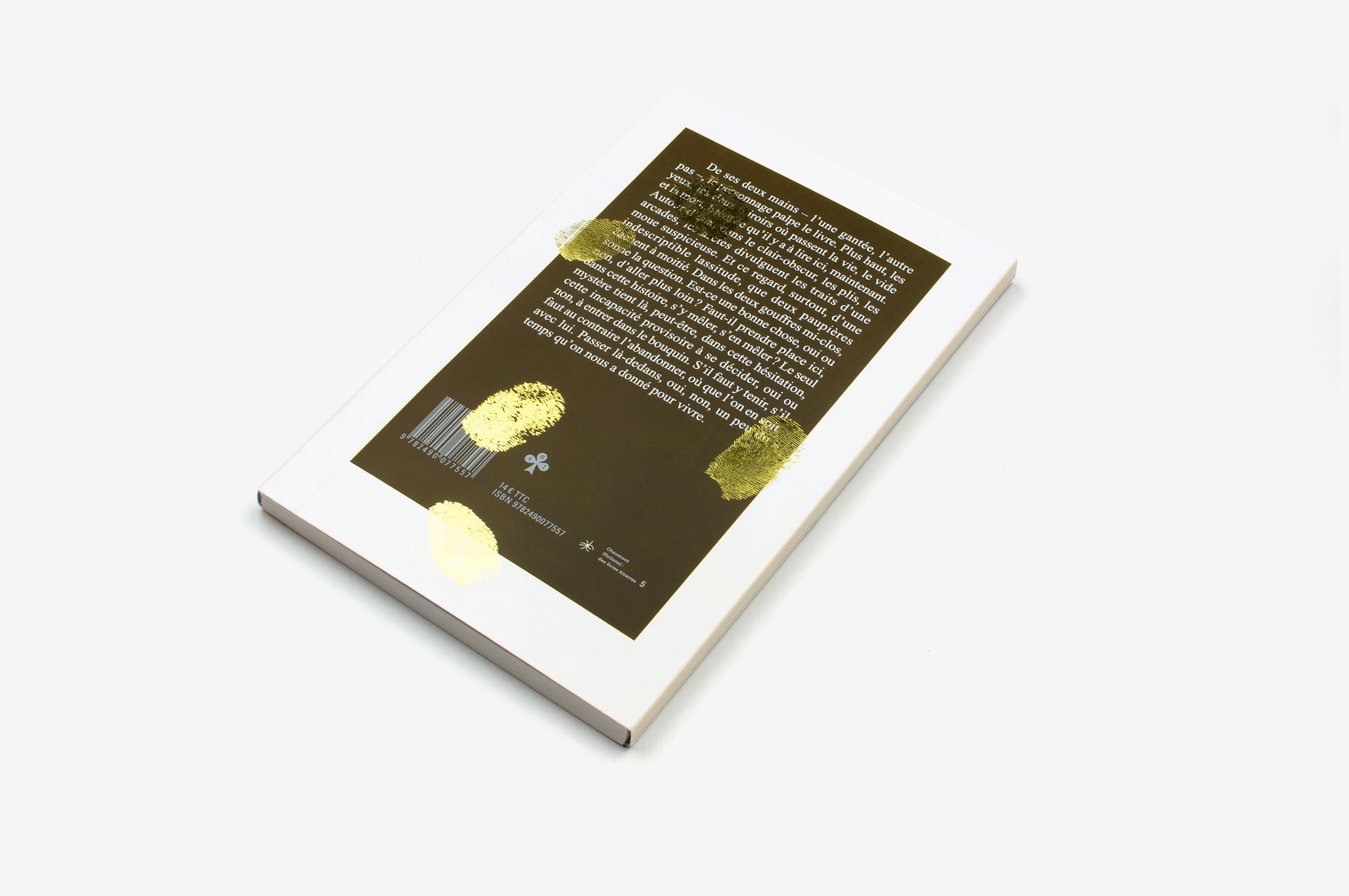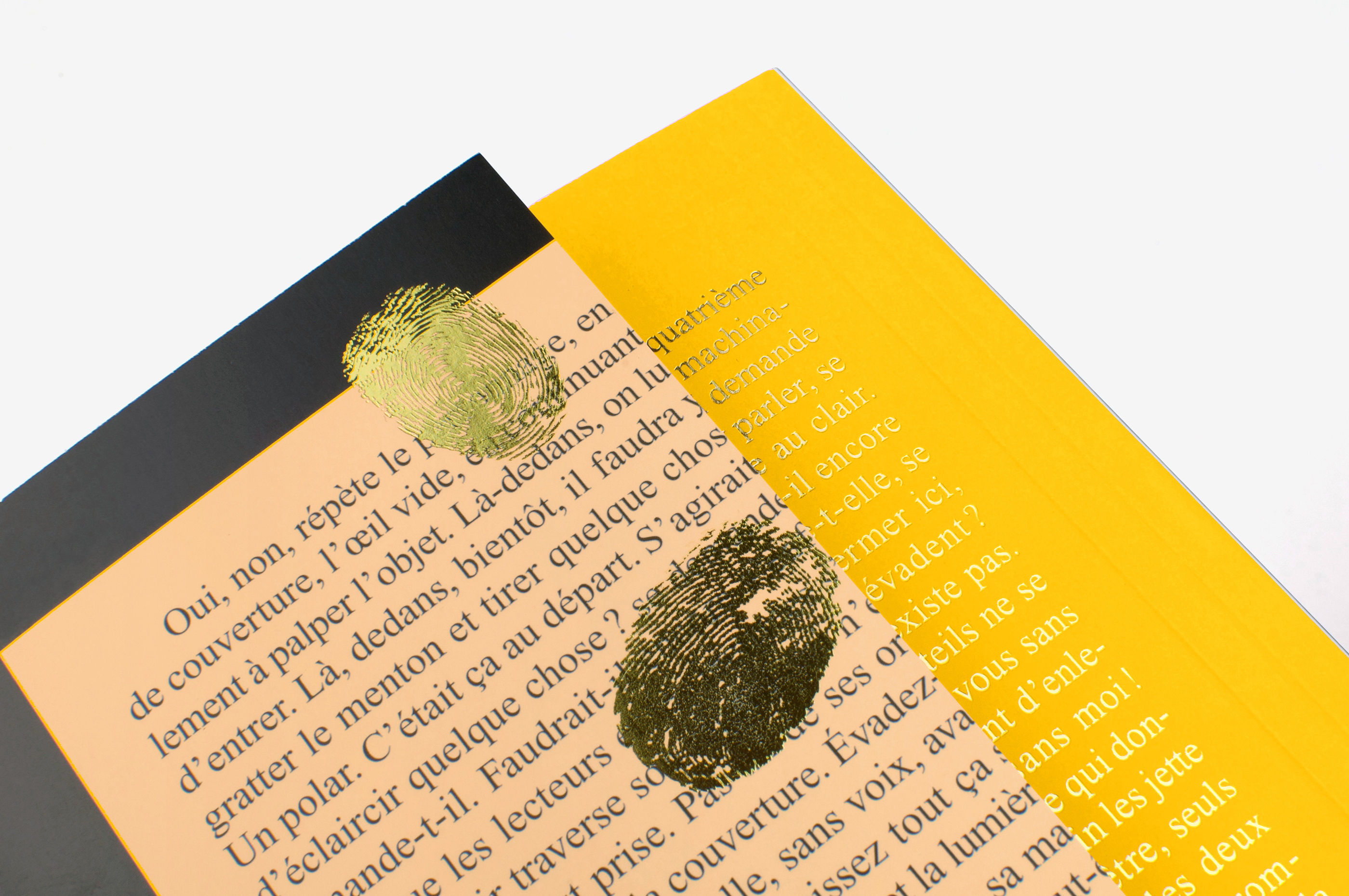 This book is the fifth work in the Collection Chaumont: fiction. Des livres bizarres, begun during my residence in Chaumont in 2007. It was the first novel by the multidisciplinary artist Joseph Schiano di Lombo and appeared more than ten years after the first four books in the series. The book concludes a publishing project that has paved the way for many personal publishing projects. In its graphic design, the book has the archetypical appearance of a detective novel in its most mainstream form. At the same time, the book’s design is strangely confusing, giving it a false dimension: the spine, the back cover, the reading direction… the reader is deceived as much by the layout as by the text. The traditional colour scheme of the detective novel is present, but made restless by overprinting. The cracks inside the book are highlighted with white ink. Hot gold fingerprints on the cover lead us to a four-handed culprit!