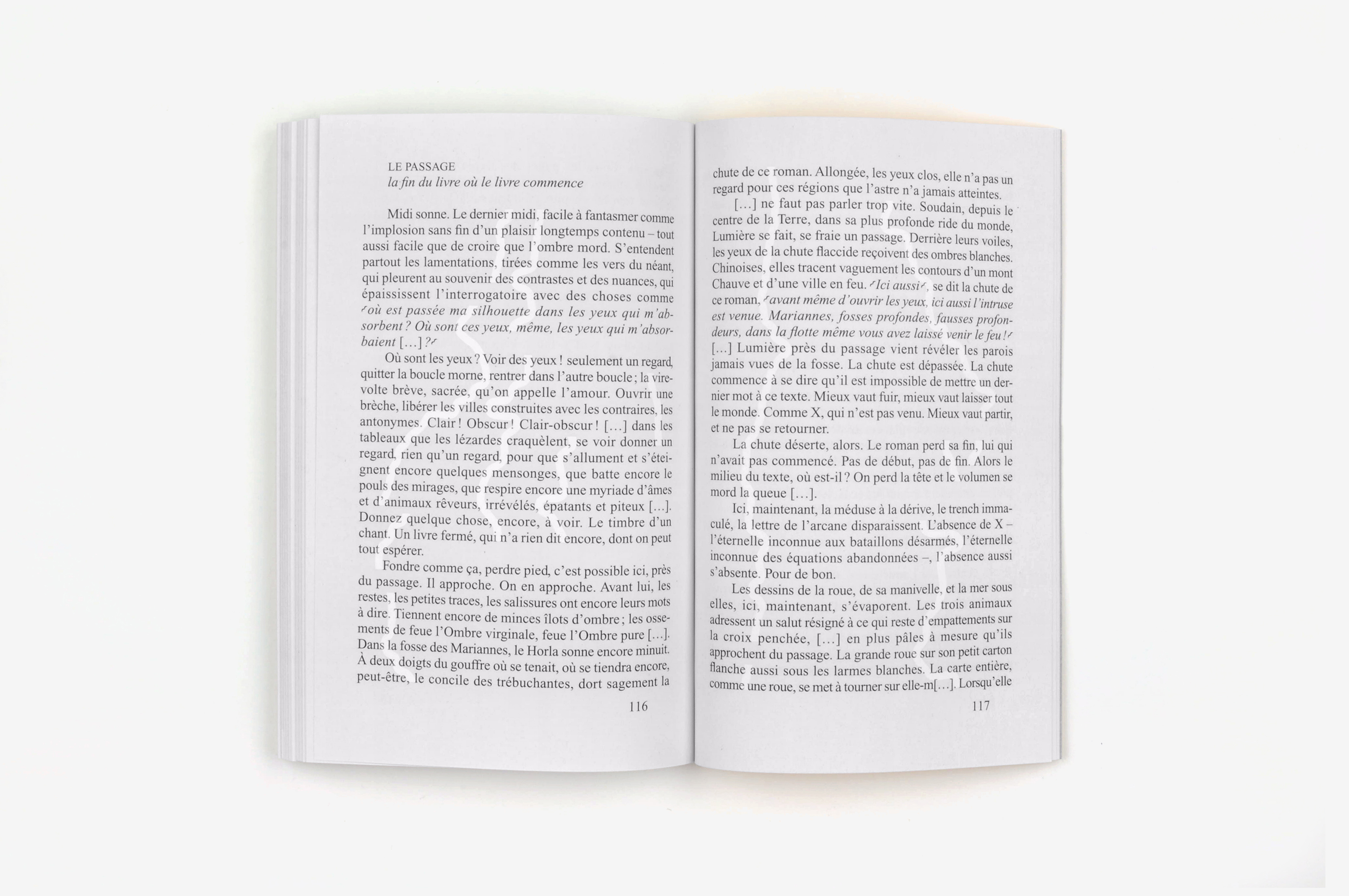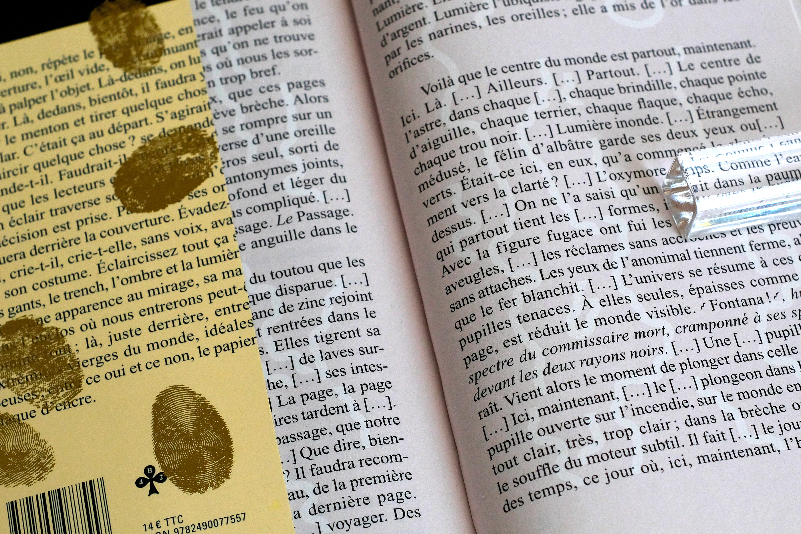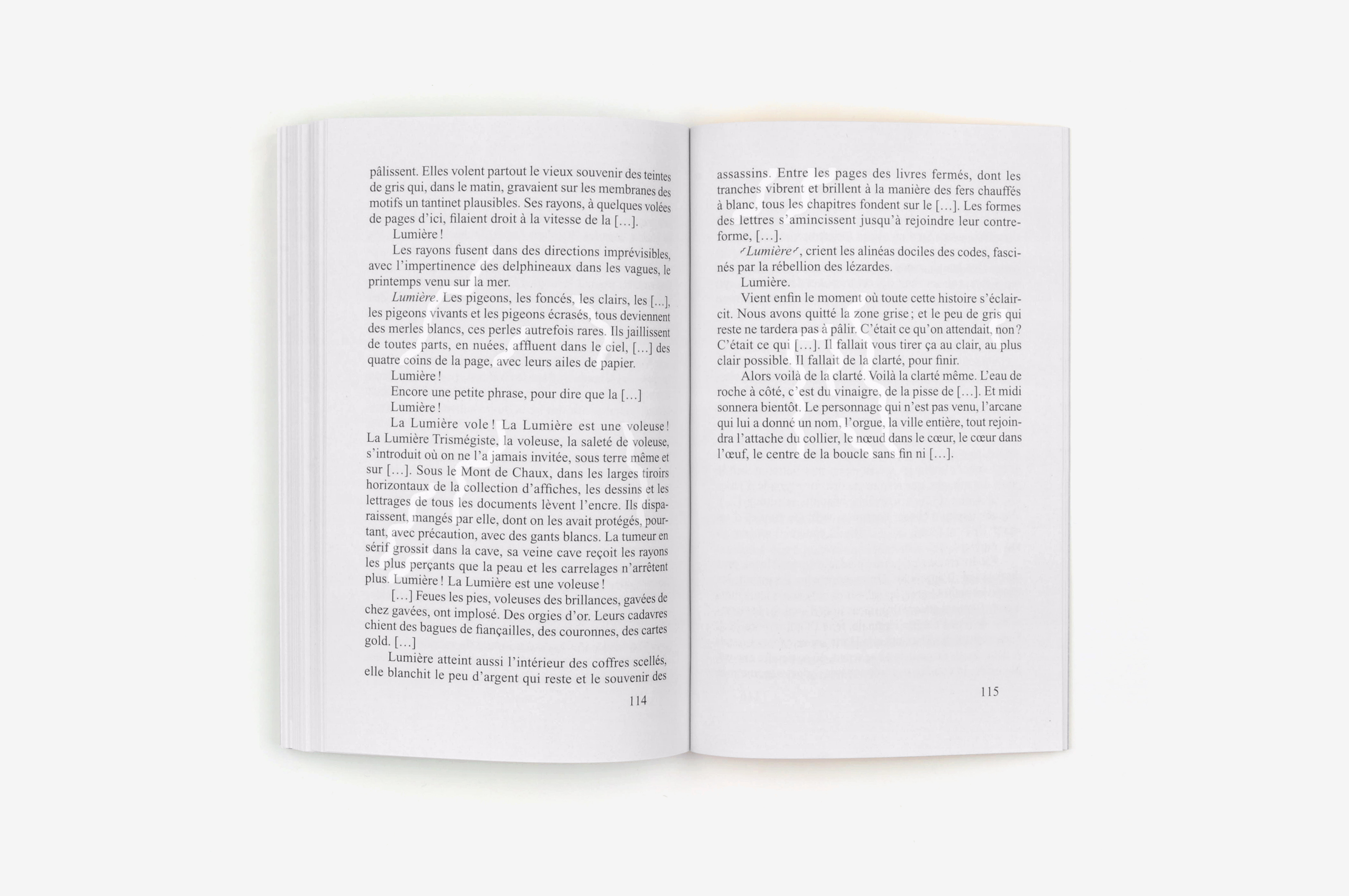 This book is the fifth work in the Collection Chaumont: fiction. Des livres bizarres, begun during my residence in Chaumont in 2007. It was the first novel by the multidisciplinary artist Joseph Schiano di Lombo and appeared more than ten years after the first four books in the series. The book concludes a publishing project that has paved the way for many personal publishing projects. In its graphic design, the book has the archetypical appearance of a detective novel in its most mainstream form. At the same time, the book’s design is strangely confusing, giving it a false dimension: the spine, the back cover, the reading direction… the reader is deceived as much by the layout as by the text. The traditional colour scheme of the detective novel is present, but made restless by overprinting. The cracks inside the book are highlighted with white ink. Hot gold fingerprints on the cover lead us to a four-handed culprit!