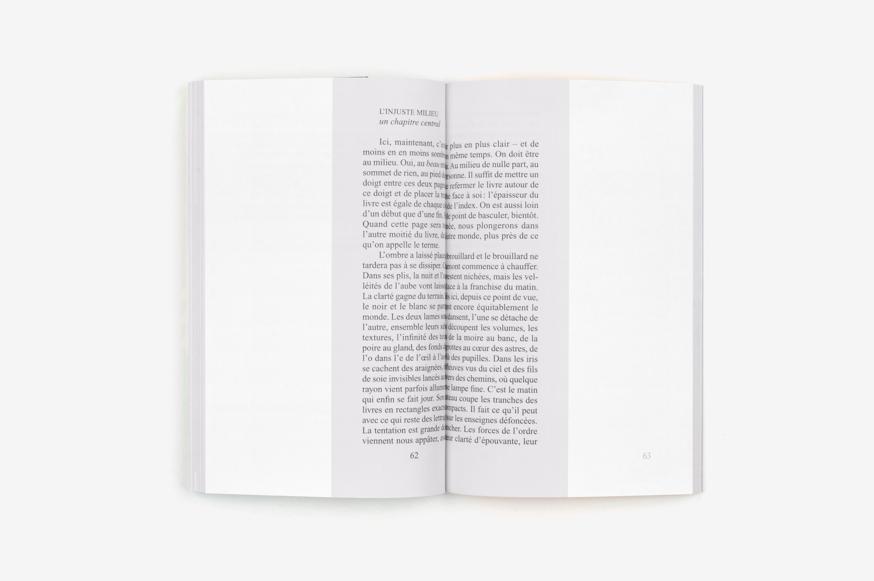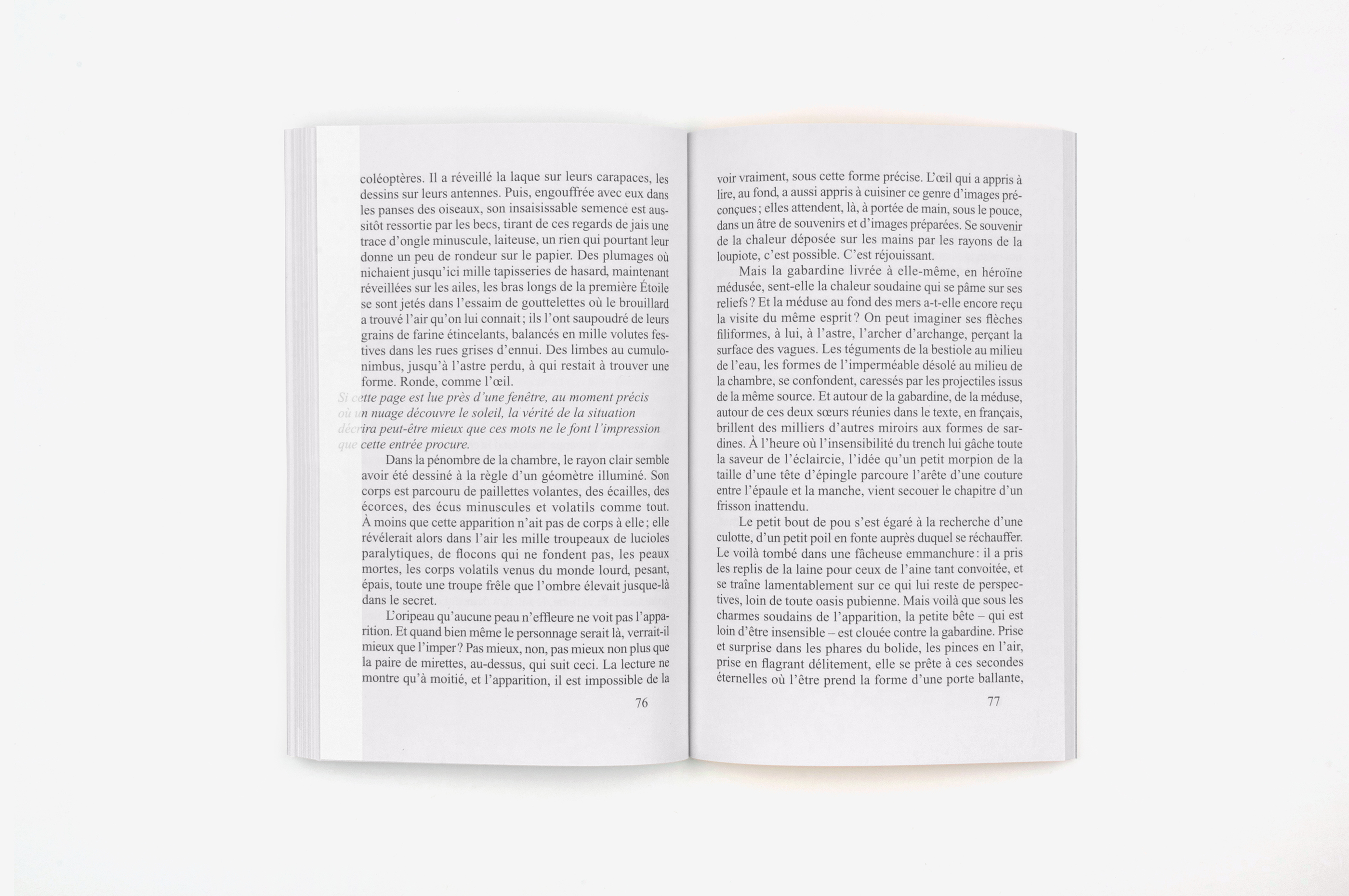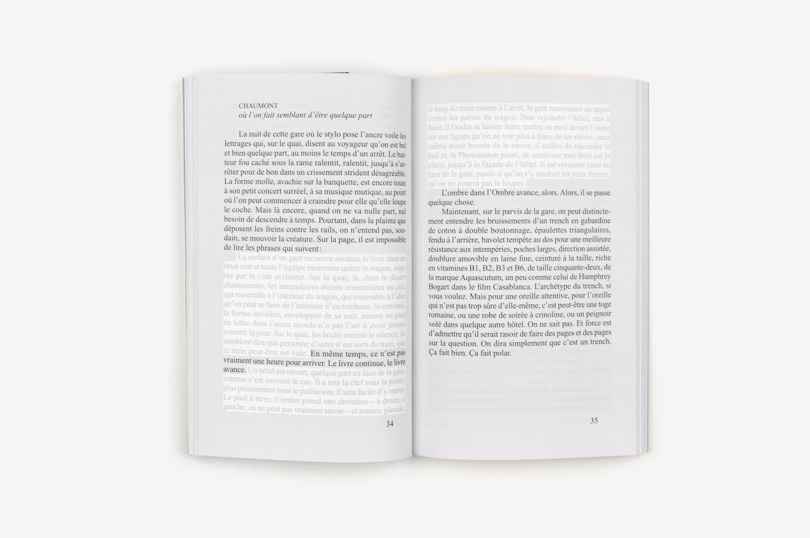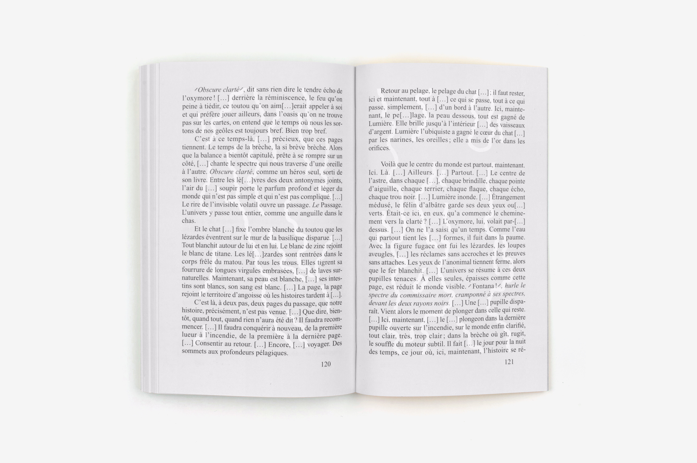 This book is the fifth work in the Collection Chaumont: fiction. Des livres bizarres, begun during my residence in Chaumont in 2007. It was the first novel by the multidisciplinary artist Joseph Schiano di Lombo and appeared more than ten years after the first four books in the series. The book concludes a publishing project that has paved the way for many personal publishing projects. In its graphic design, the book has the archetypical appearance of a detective novel in its most mainstream form. At the same time, the book’s design is strangely confusing, giving it a false dimension: the spine, the back cover, the reading direction… the reader is deceived as much by the layout as by the text. The traditional colour scheme of the detective novel is present, but made restless by overprinting. The cracks inside the book are highlighted with white ink. Hot gold fingerprints on the cover lead us to a four-handed culprit!