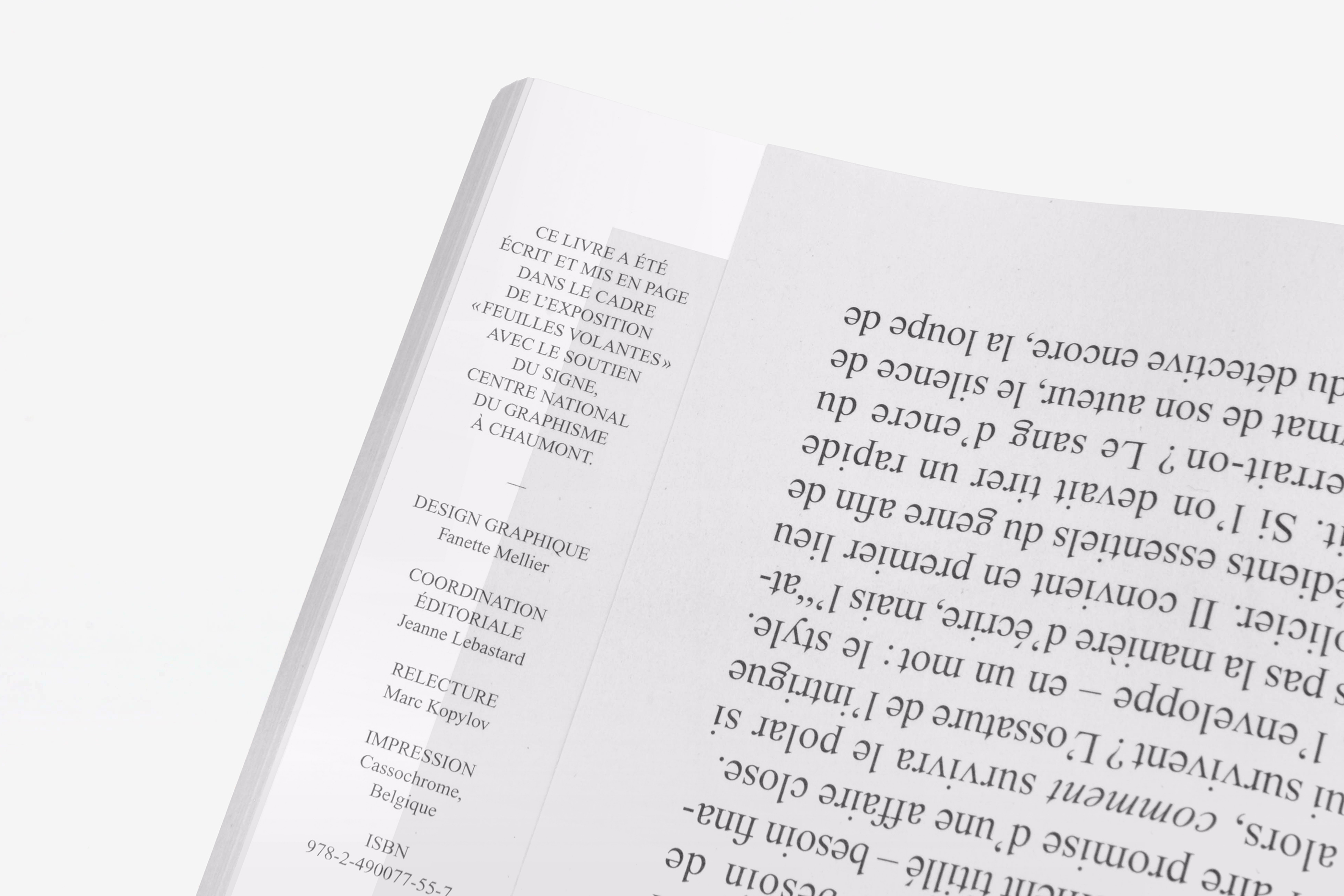 Ce livre est le cinquième ouvrage de la collection Chaumont: fictions. Des livres bizarres, initiée lors de ma résidence à Chaumont en 2007. Il a été écrit plus de dix ans après les quatre premiers ouvrages, par l’artiste pluridisciplinaire Joseph Schiano di Lombo dont c’est le premier roman. L’ouvrage vient clore ce projet éditorial, qui a ouvert la voie à beaucoup de projets d’édition personnels. Le livre, dans son graphisme, empreinte la forme archétypale du polar dans ce qu’elle a de plus mainstream. Néanmoins, le façonnage brouille bizarrement les pistes en conférant une dimension factice au livre. Tranche, dos, quatrième de couverture, sens de lecture… le lecteur est ici leurré par la mise en forme, tout autant que par le texte. La gamme colorée traditionnelle du roman policier est bien présente, mais rendue fébrile par des jeux de surimpression. Les lézardes, à l’intérieur du livre, sont réveillées par l’encre blanche. Des empreintes digitales dorées à chaud en couverture nous conduisent vers un coupable à quatre mains!