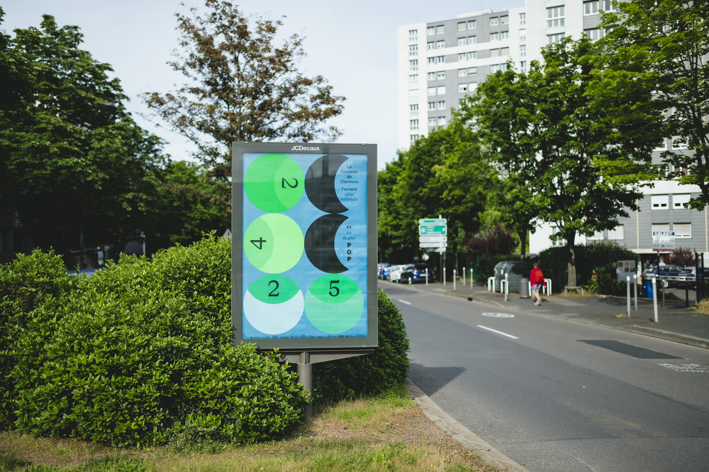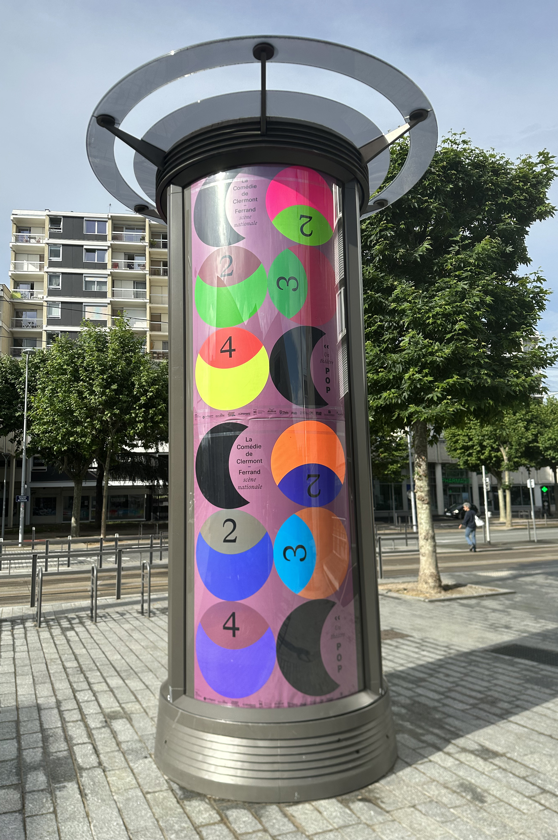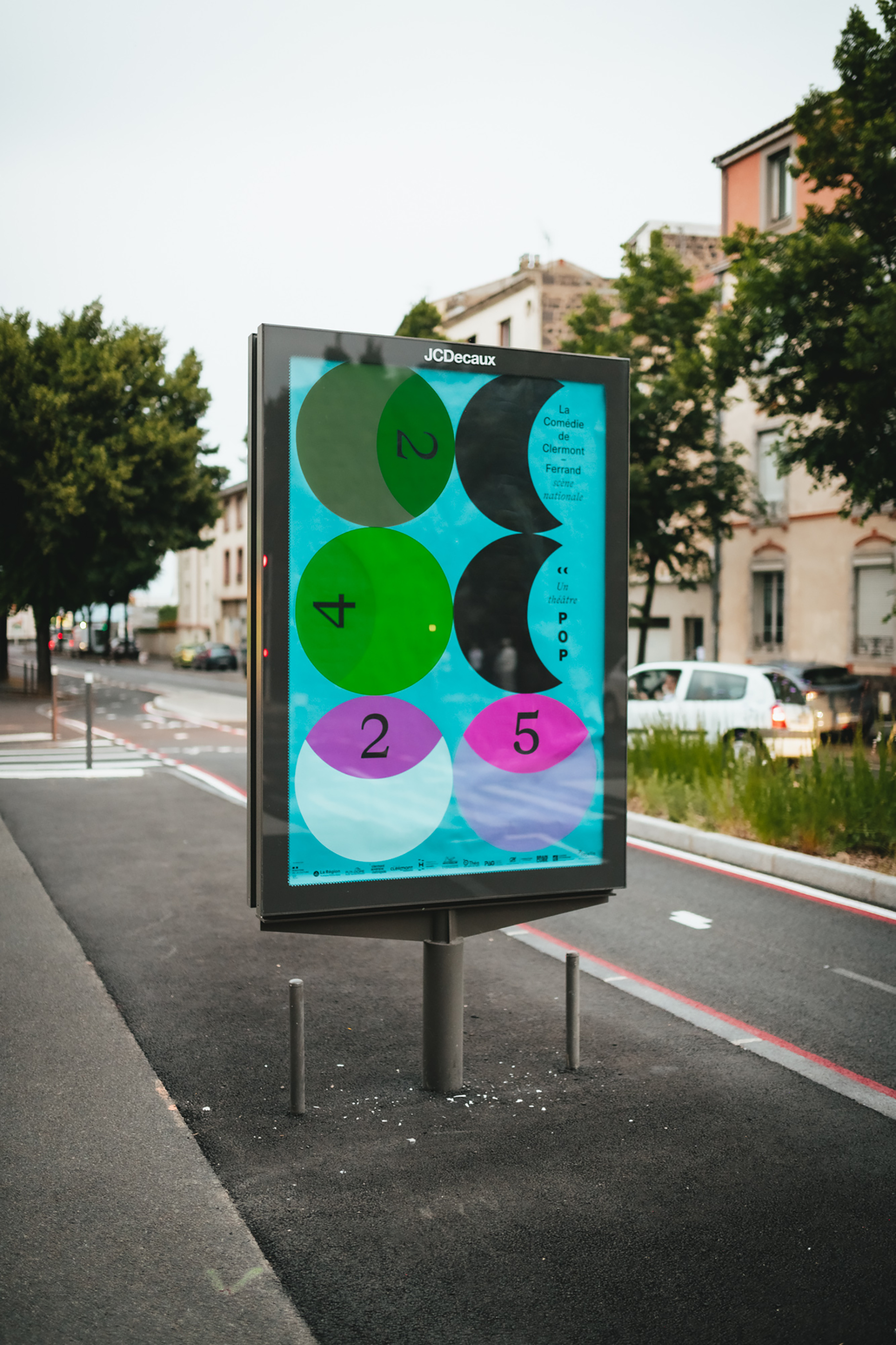 Two Cs, like two open parentheses… The circular shape of the stage, and the oculus in its entrance hall naturally led me to design these two open moons for the Comédie de Clermont’s logo. Their shape and arrangement suggest the idea of a “counterform”: metaphorically, this (inclusive) counterform is represented by the audience. The shape also represents night, eclipse, spotlight, stage and wings: the visible and the non-visible. In its form it evokes the roundness of the word “pop” and the idea of an eye. It moves over time like a caterpillar, drawing a frame, a frieze or a series of objects, according to the needs and the context. It is in this way that the identity of the theatre takes shape from day to day, in a movement that is both linear and protean.