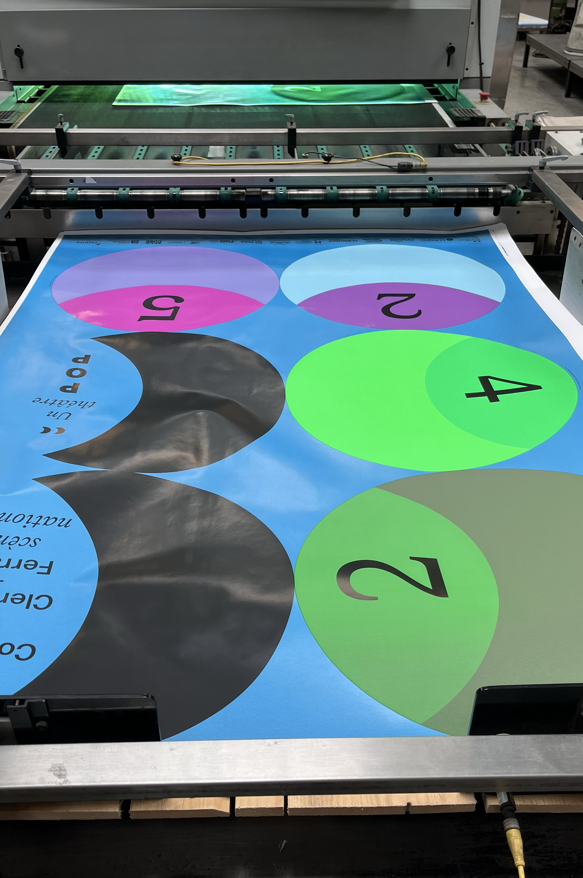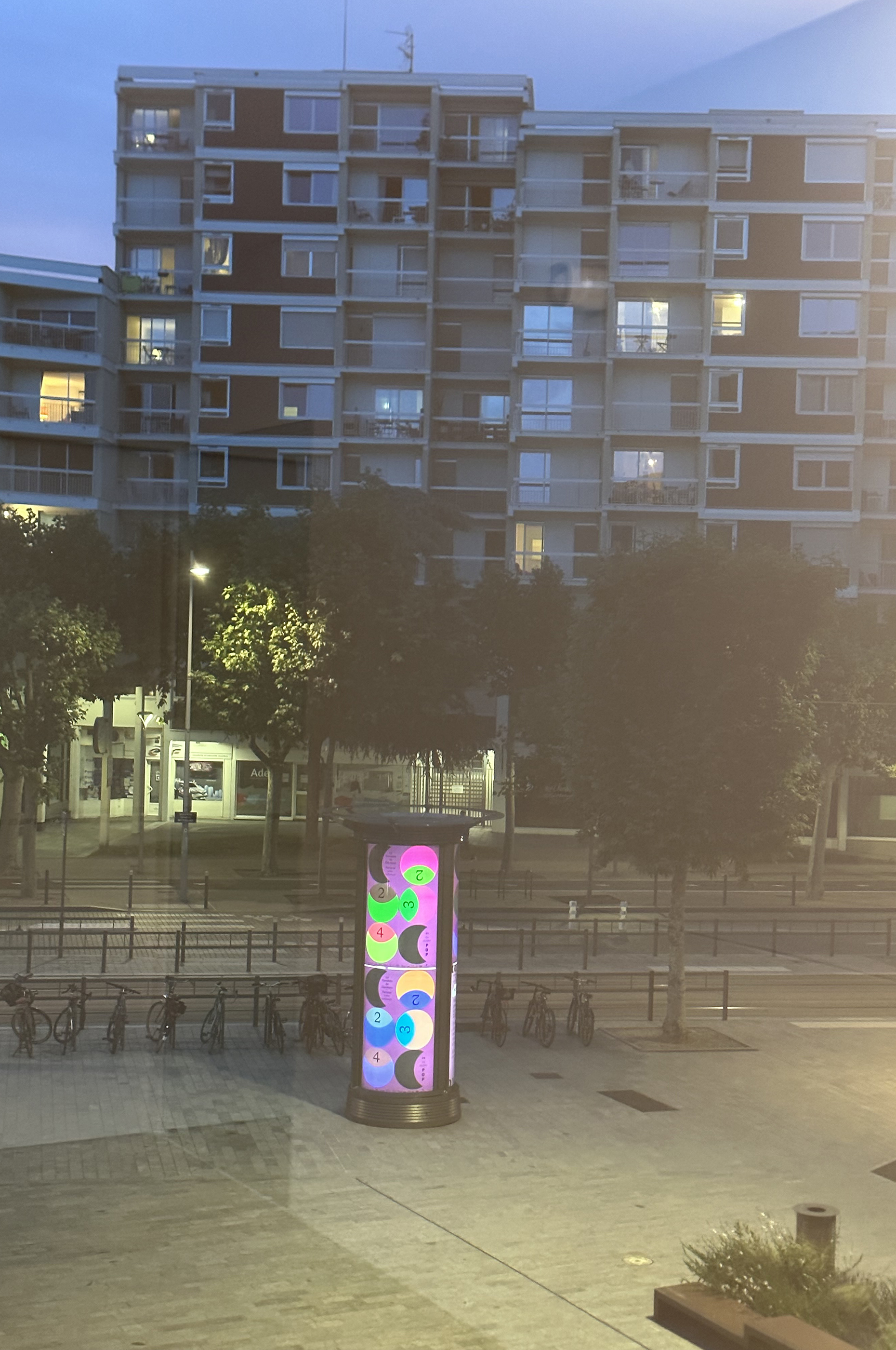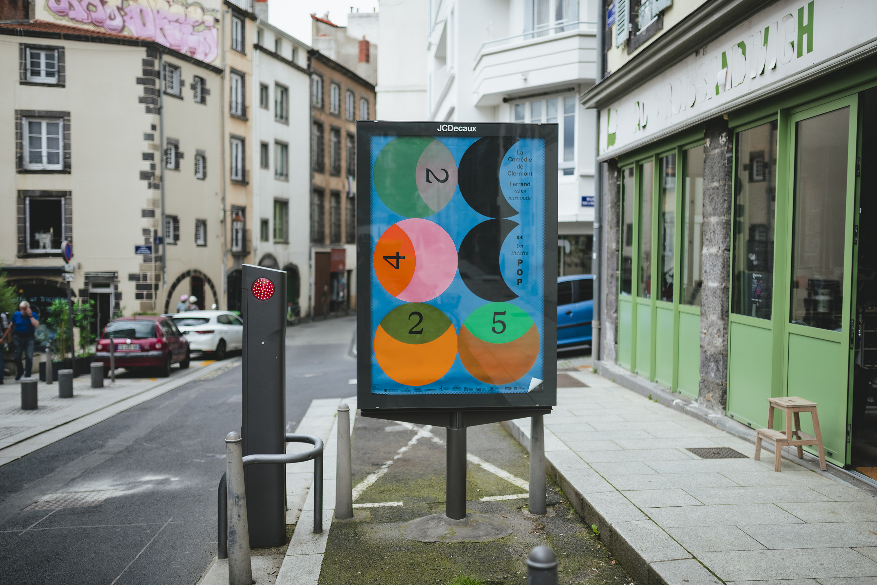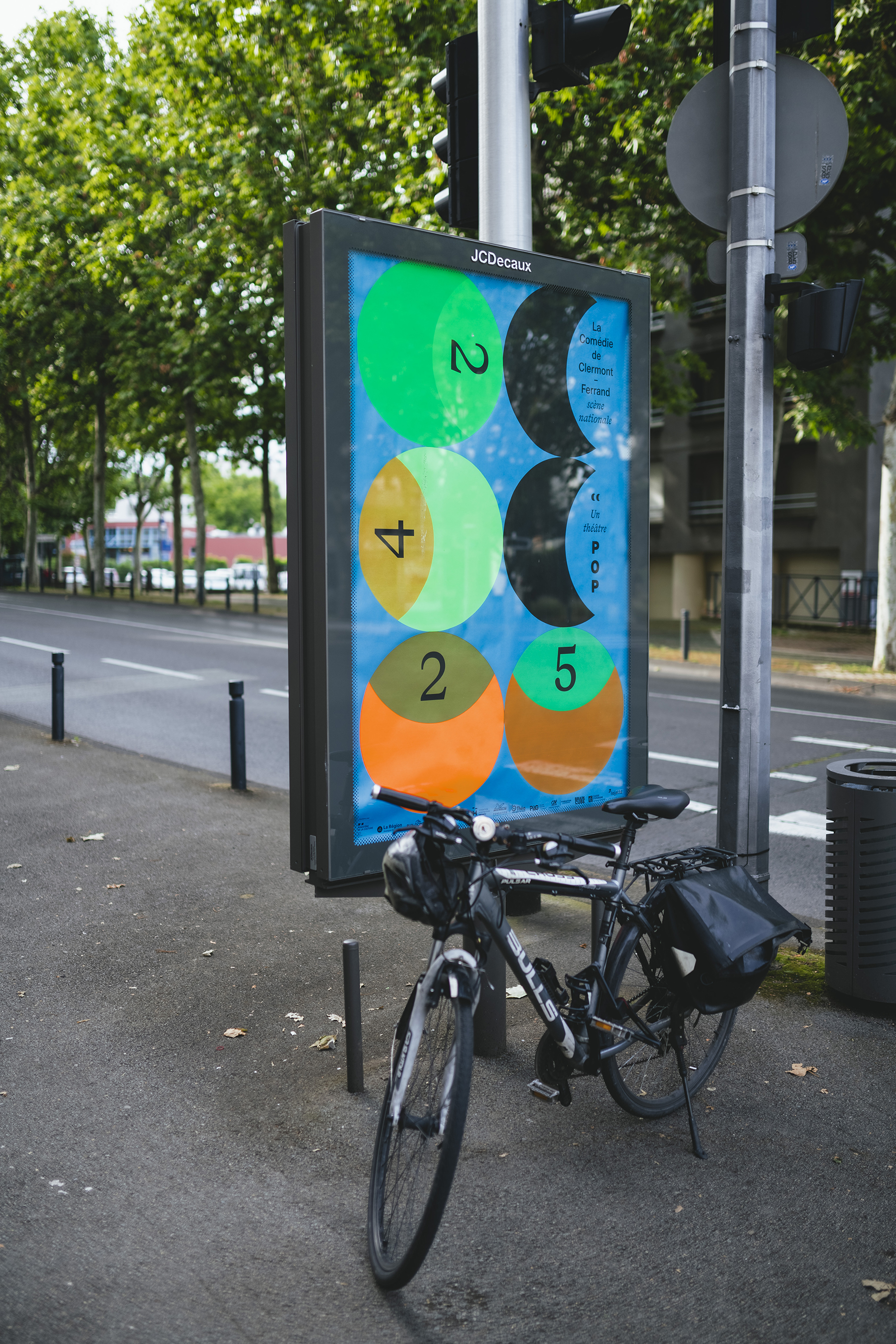 Two Cs, like two open parentheses… The circular shape of the stage, and the oculus in its entrance hall naturally led me to design these two open moons for the Comédie de Clermont’s logo. Their shape and arrangement suggest the idea of a “counterform”: metaphorically, this (inclusive) counterform is represented by the audience. The shape also represents night, eclipse, spotlight, stage and wings: the visible and the non-visible. In its form it evokes the roundness of the word “pop” and the idea of an eye. It moves over time like a caterpillar, drawing a frame, a frieze or a series of objects, according to the needs and the context. It is in this way that the identity of the theatre takes shape from day to day, in a movement that is both linear and protean.