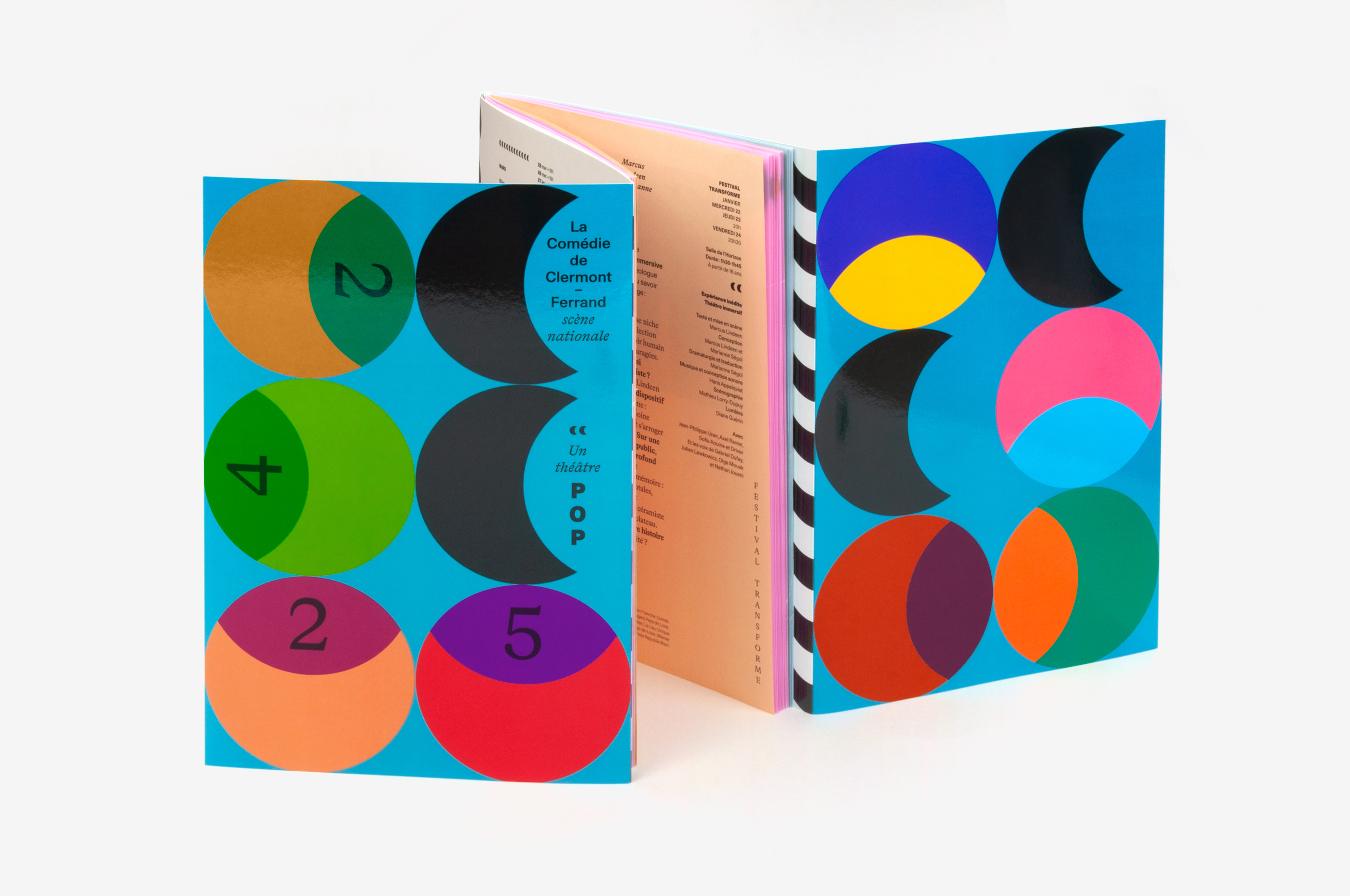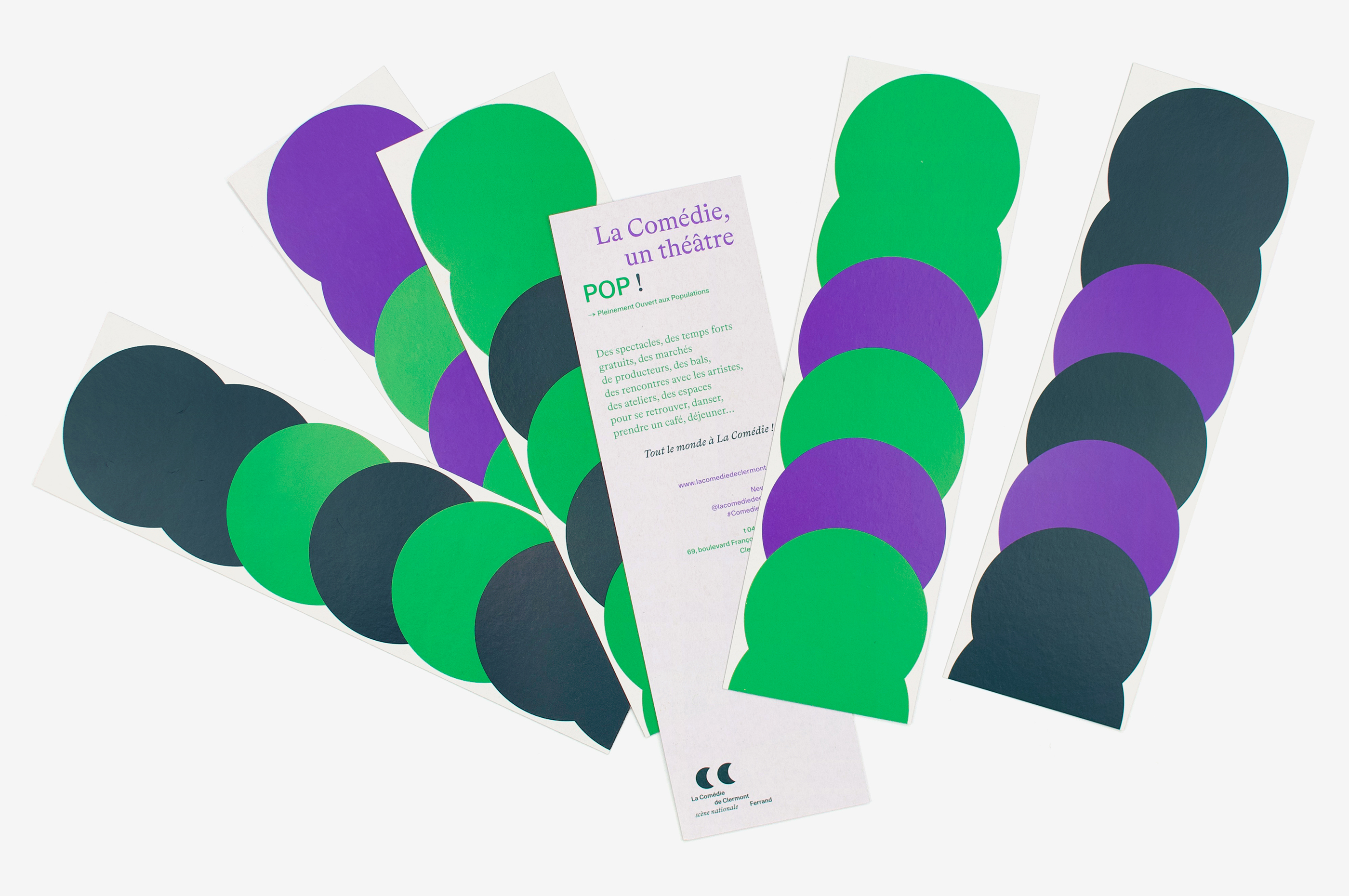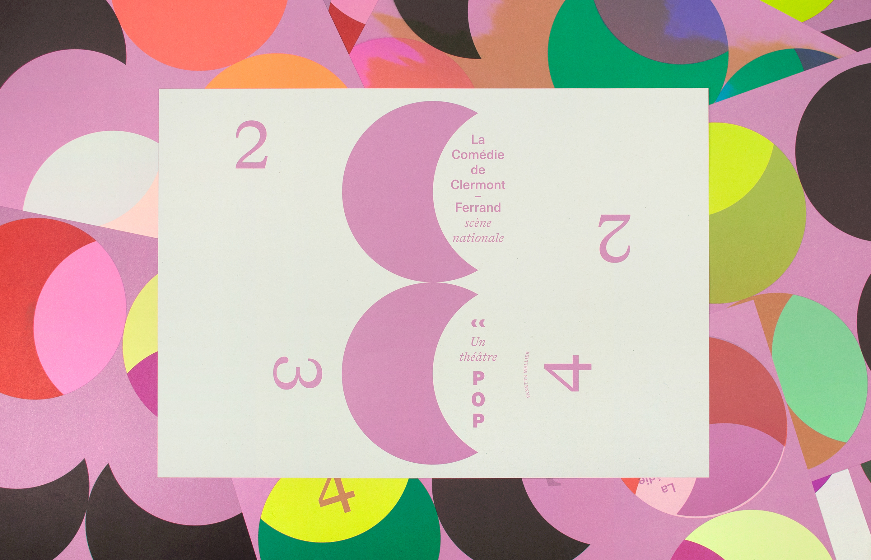 Two Cs, like two open parentheses… The circular shape of the stage, and the oculus in its entrance hall naturally led me to design these two open moons for the Comédie de Clermont’s logo. Their shape and arrangement suggest the idea of a “counterform”: metaphorically, this (inclusive) counterform is represented by the audience. The shape also represents night, eclipse, spotlight, stage and wings: the visible and the non-visible. In its form it evokes the roundness of the word “pop” and the idea of an eye. It moves over time like a caterpillar, drawing a frame, a frieze or a series of objects, according to the needs and the context. It is in this way that the identity of the theatre takes shape from day to day, in a movement that is both linear and protean.