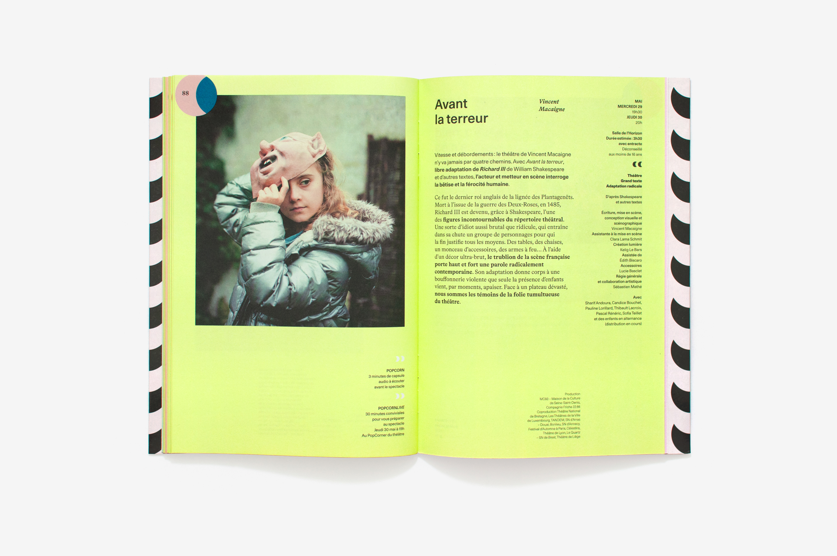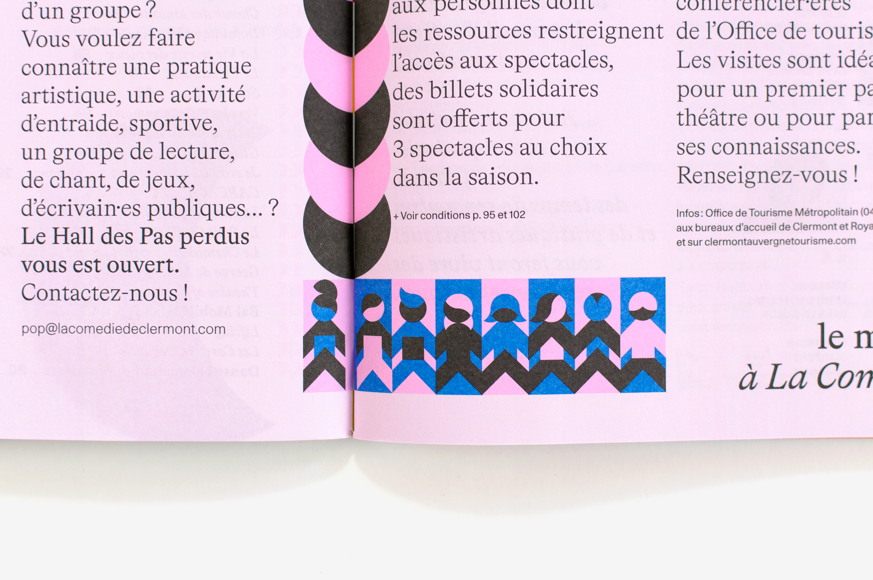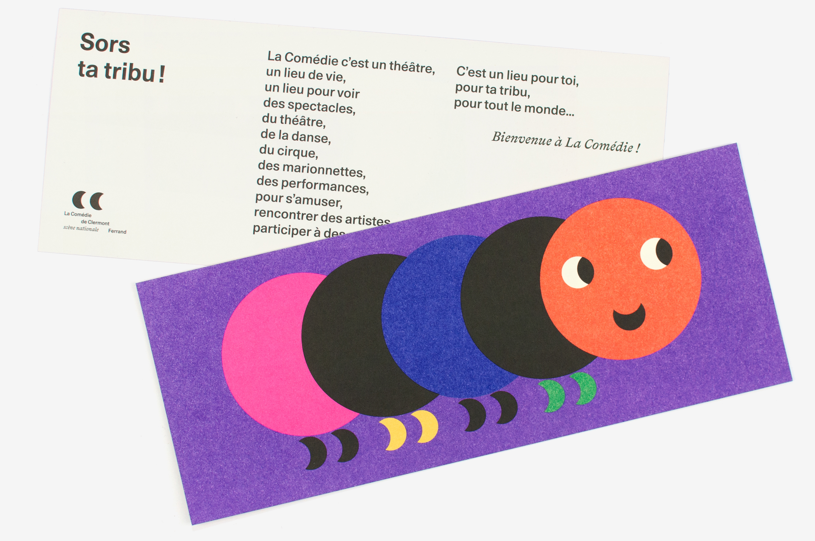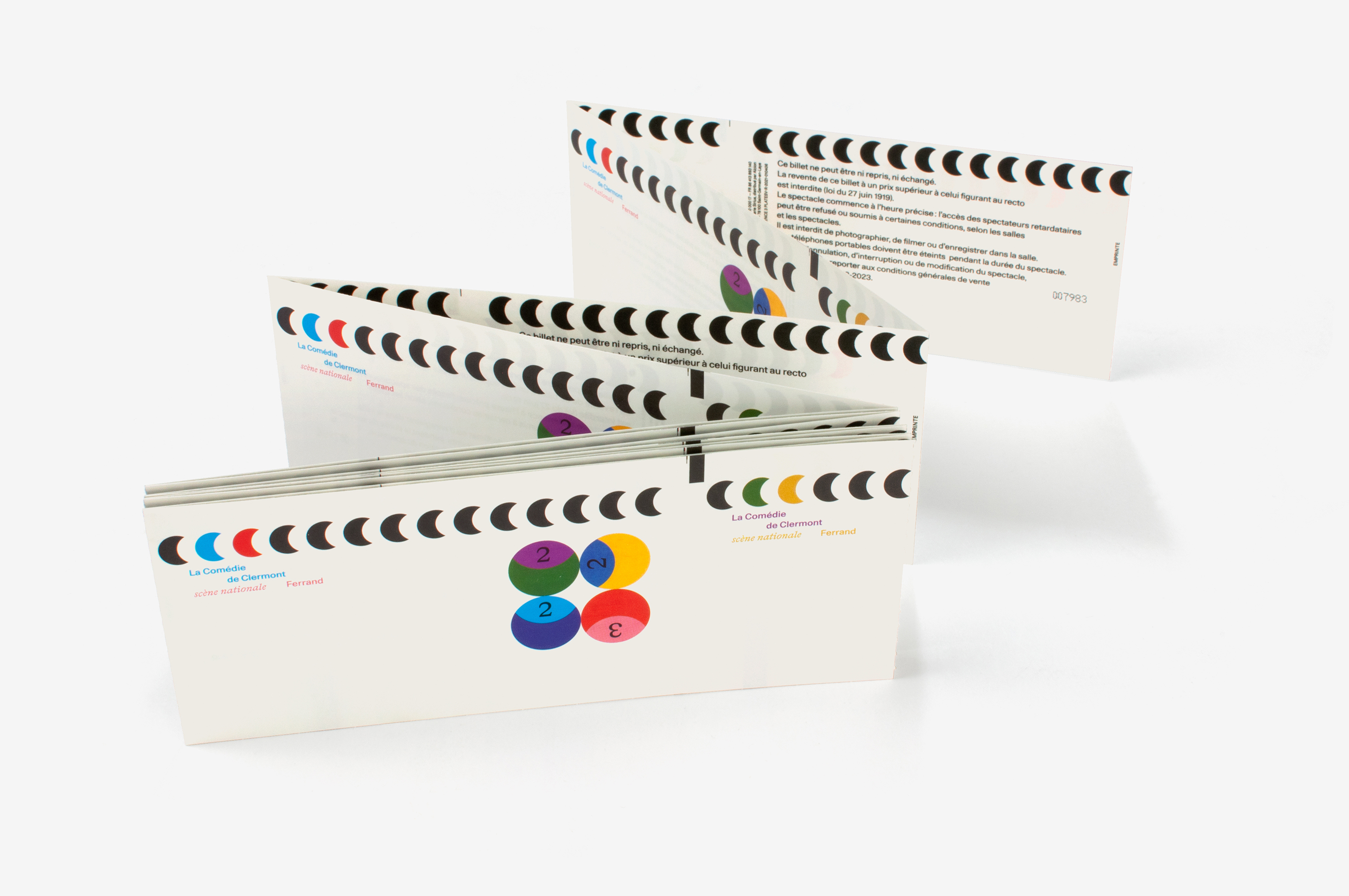 Two Cs, like two open parentheses… The circular shape of the stage, and the oculus in its entrance hall naturally led me to design these two open moons for the Comédie de Clermont’s logo. Their shape and arrangement suggest the idea of a “counterform”: metaphorically, this (inclusive) counterform is represented by the audience. The shape also represents night, eclipse, spotlight, stage and wings: the visible and the non-visible. In its form it evokes the roundness of the word “pop” and the idea of an eye. It moves over time like a caterpillar, drawing a frame, a frieze or a series of objects, according to the needs and the context. It is in this way that the identity of the theatre takes shape from day to day, in a movement that is both linear and protean.