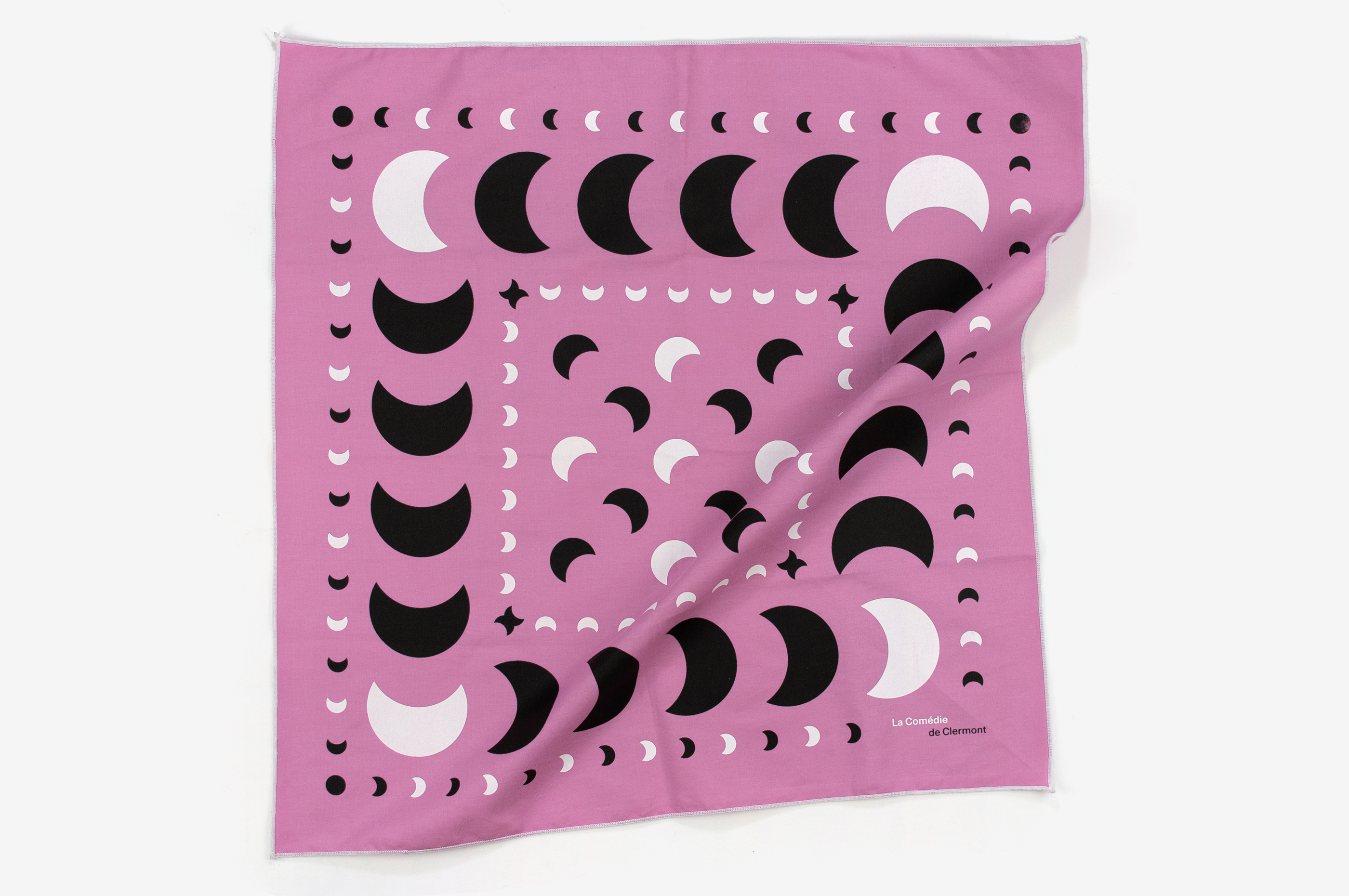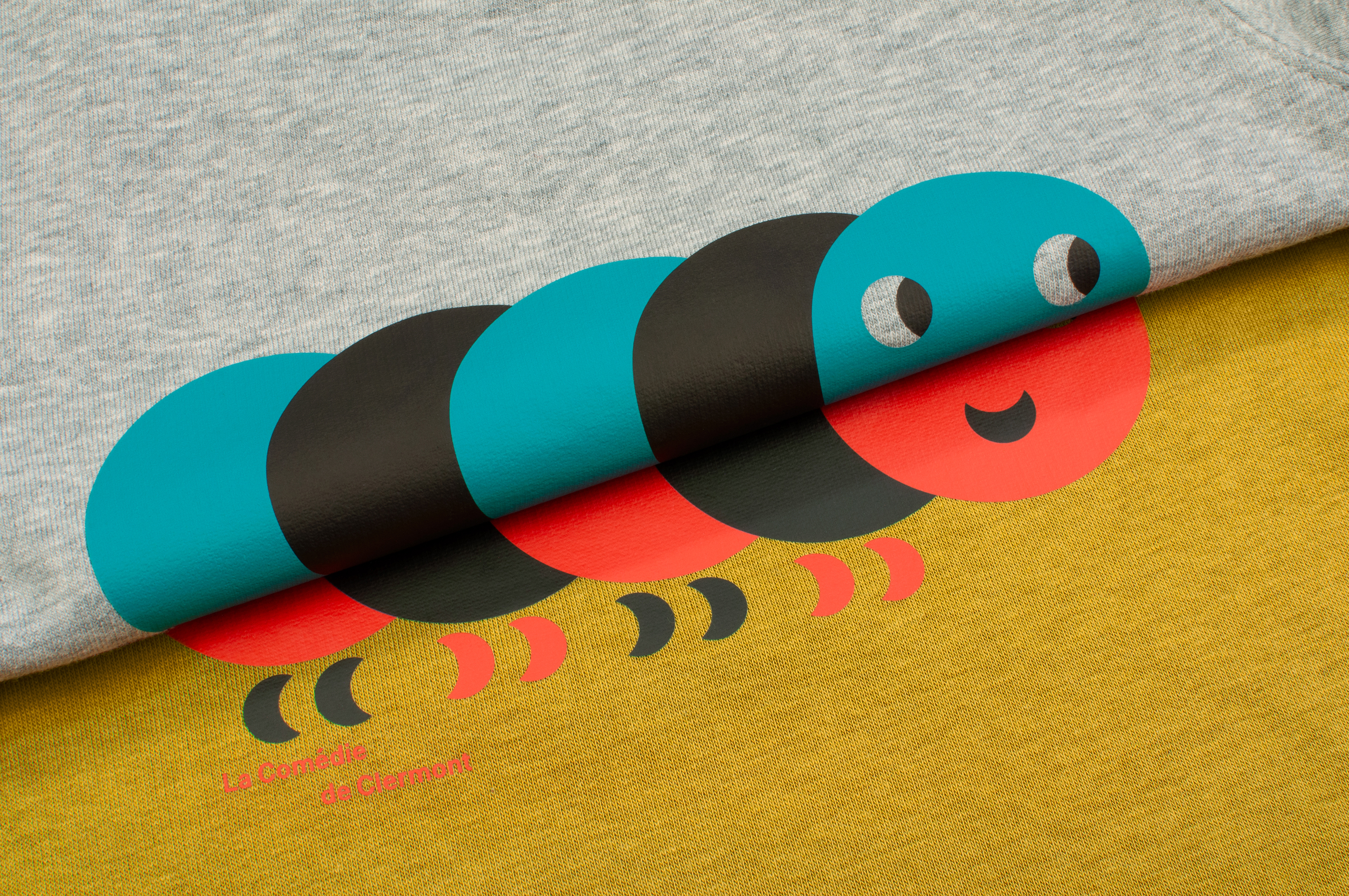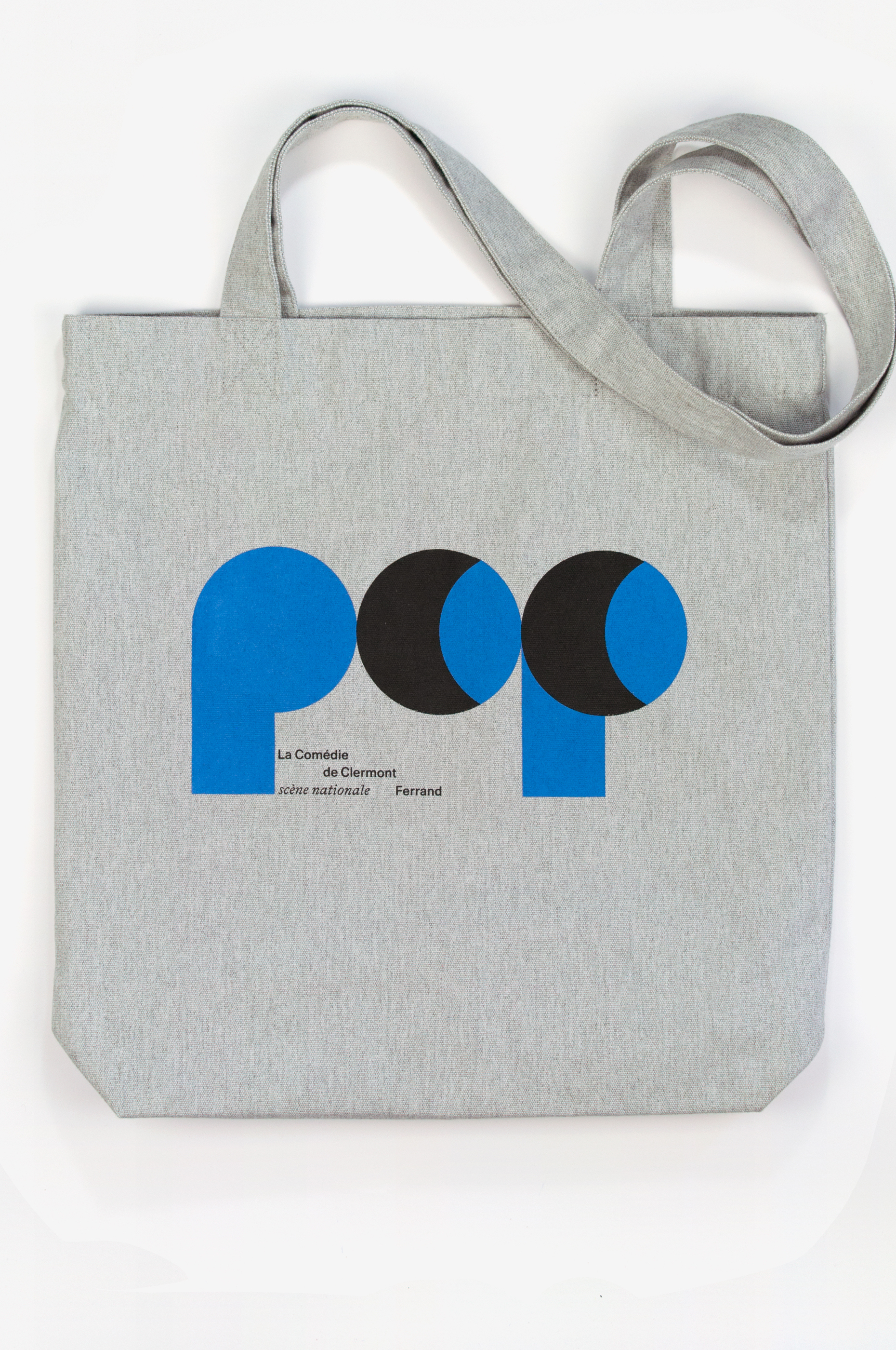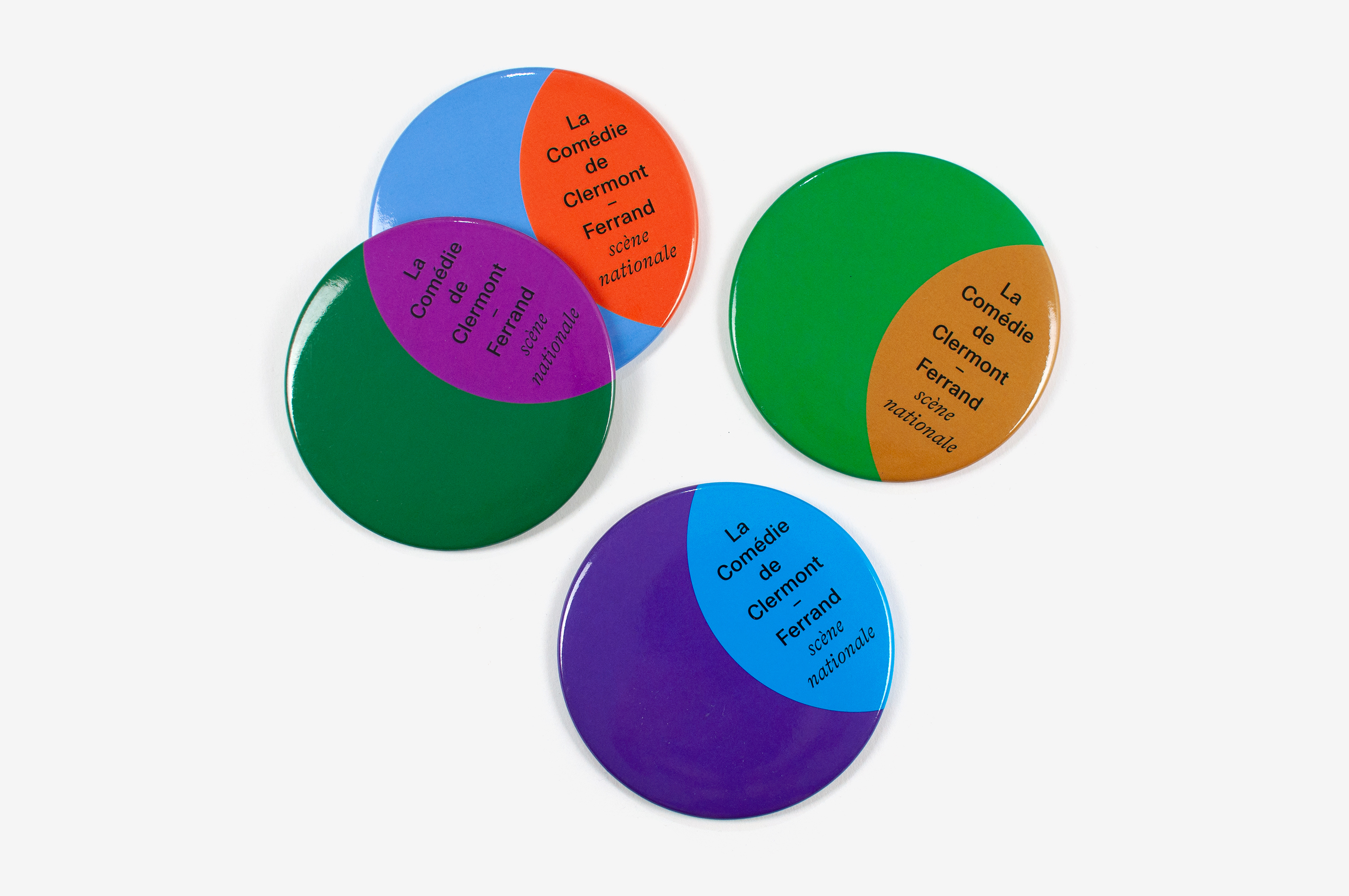 Two Cs, like two open parentheses… The circular shape of the stage, and the oculus in its entrance hall naturally led me to design these two open moons for the Comédie de Clermont’s logo. Their shape and arrangement suggest the idea of a “counterform”: metaphorically, this (inclusive) counterform is represented by the audience. The shape also represents night, eclipse, spotlight, stage and wings: the visible and the non-visible. In its form it evokes the roundness of the word “pop” and the idea of an eye. It moves over time like a caterpillar, drawing a frame, a frieze or a series of objects, according to the needs and the context. It is in this way that the identity of the theatre takes shape from day to day, in a movement that is both linear and protean.