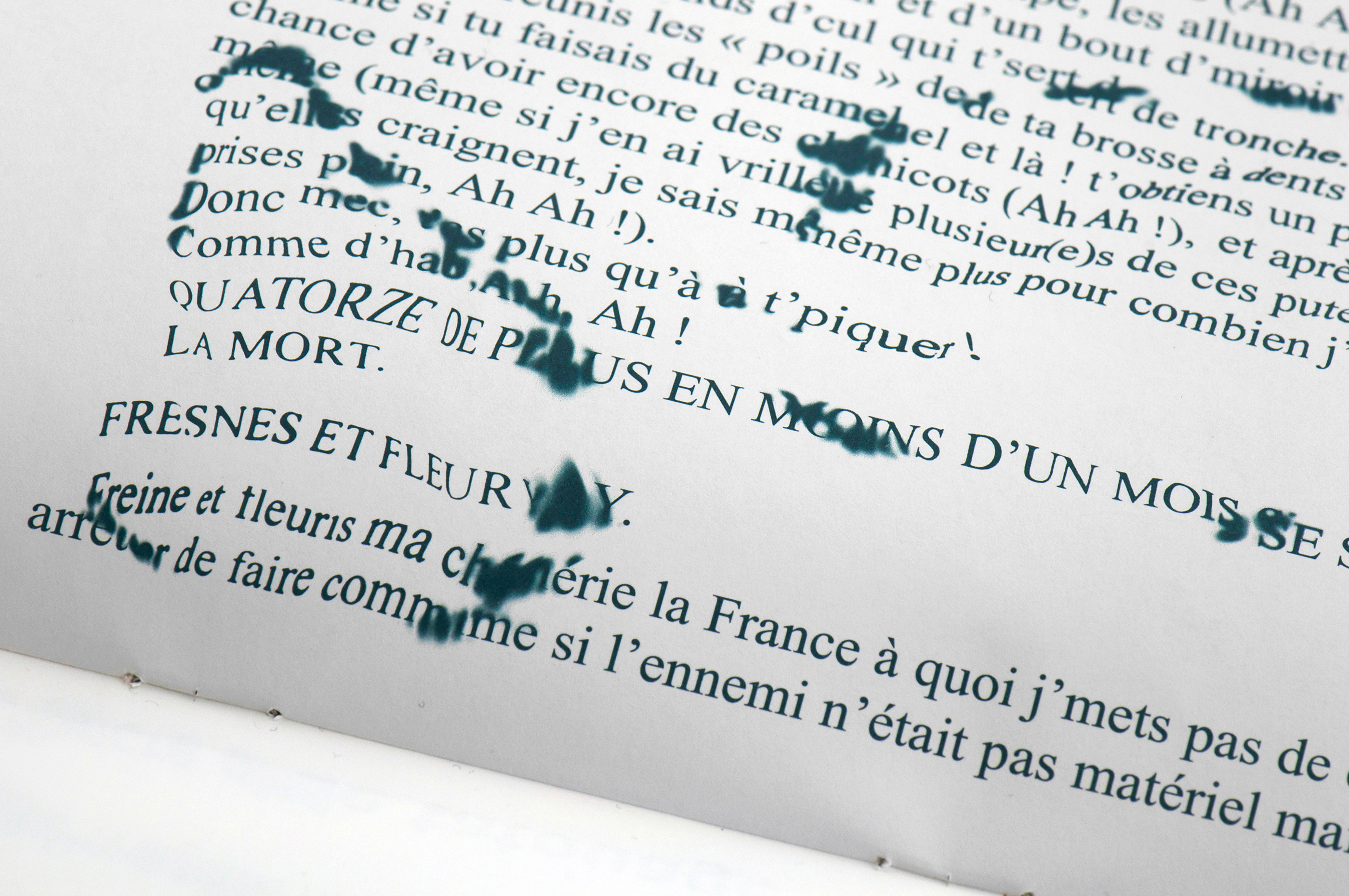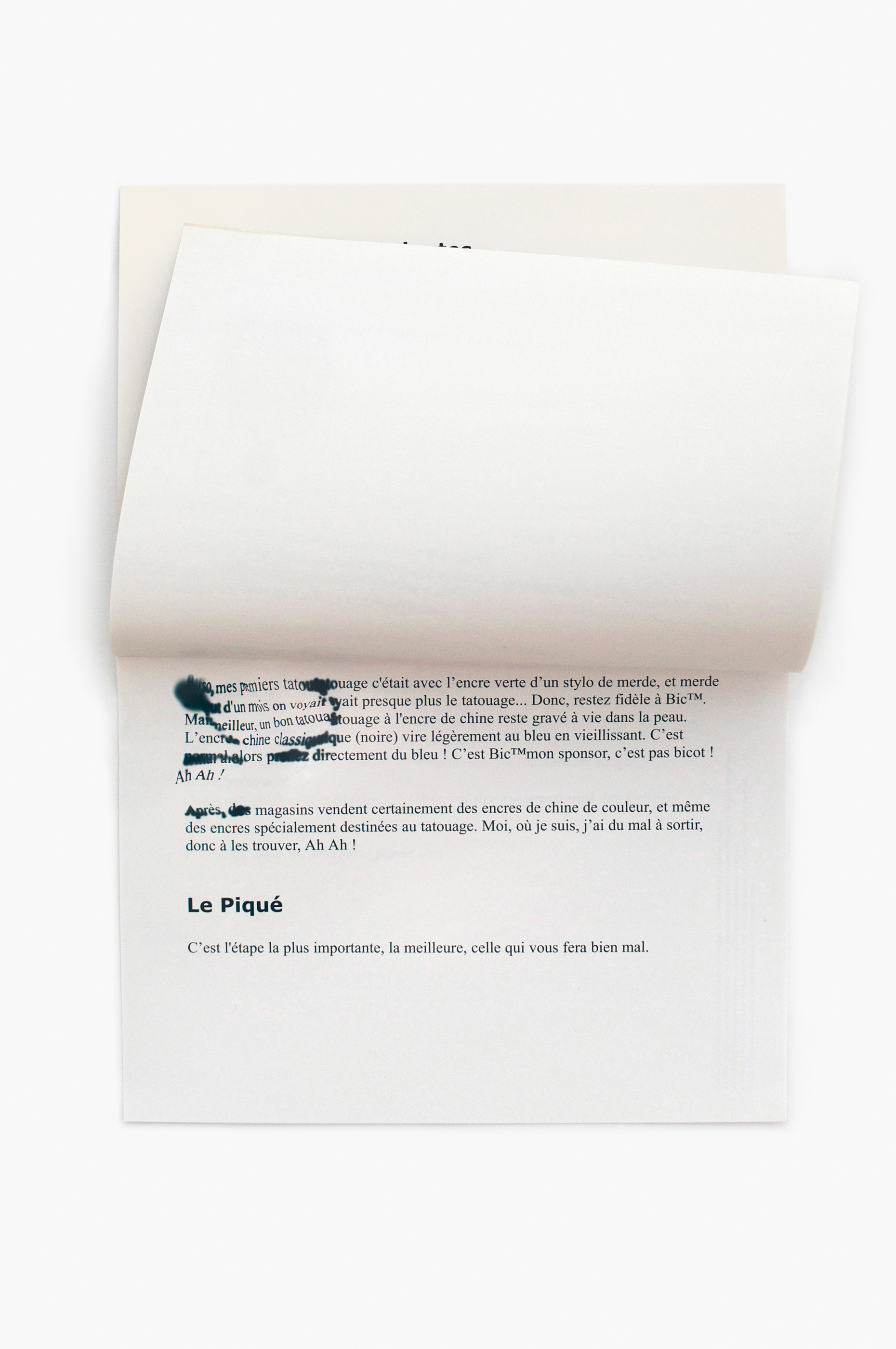 This text by Manuel Joseph gives brief but detailed instructions for tattooing oneself in prison using the materials available. The language is direct and layered, swinging between violence, cynicism and tenderness. The text is highly compressed and there is not sufficient material to make a book in the traditional sense of the word. The appearance of the author’s text in its original state struck me as significant. The default aesthetics of Word, effective, spare and impoverished, provide a good point of departure for the layout. The book – or, more precisely, the brochure – is related to a Word text of four A4 sheets of paper, folded in half. The text is stapled together with 3 metal staples (“morts aux vaches!” Death to all tyrants!) that stab the text through the heart as they bind it. They collide with a reading of the text that must be unstapled or else read “differently”. The text undergoes strange distortions resembling tattoos, like slimy and organic grafts. The brochure follows an epidermic progression moving from white leatherette to 60 gram offset paper. Following the same evolving progression, the colour of the ink changes from black to the colour of a faded tattoo!