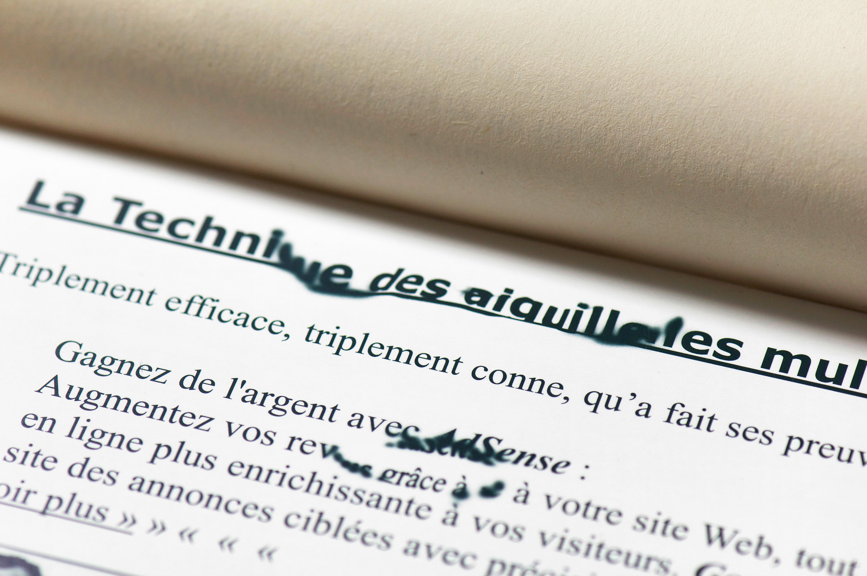 Ce texte de Manuel Joseph est un mode d’emploi, court et dense, indiquant comment se tatouer en prison avec les moyens du bord. La langue est directe et stratifiée, oscillant entre violence, cynisme et tendresse. Le texte est très concis, il n’y a pas matière à faire un livre au sens traditionnel. La mise en page du texte par l’auteur m’a semblé signifiante à l’état brut. L’esthétique par défaut de Word, efficace, dépouillée et pauvre constitue un bon point de départ pour la mise en forme. Le livre, ou plus exactement la brochure, s’apparente donc à un texte Word de quatre feuilles au format A4, pliées en deux. Le texte est ainsi relié par 3 agrafes métalliques («morts aux vaches!»), qui piquent le texte en son cœur, tout en le reliant. La lecture est donc heurtée: il faut le dégrafer, ou bien lire «autrement». Le texte subit des distorsions étranges à la manière de tatouages, comme des greffes de texte baveuses et organiques. La brochure suit une progression épidermique allant du simili cuir blanc au papier offset 60 grammes. Suivant cette évolution, la couleur de l’encre passe du noir à une couleur de tatouage dilué, ma cheville servant de référence chez l’imprimeur!