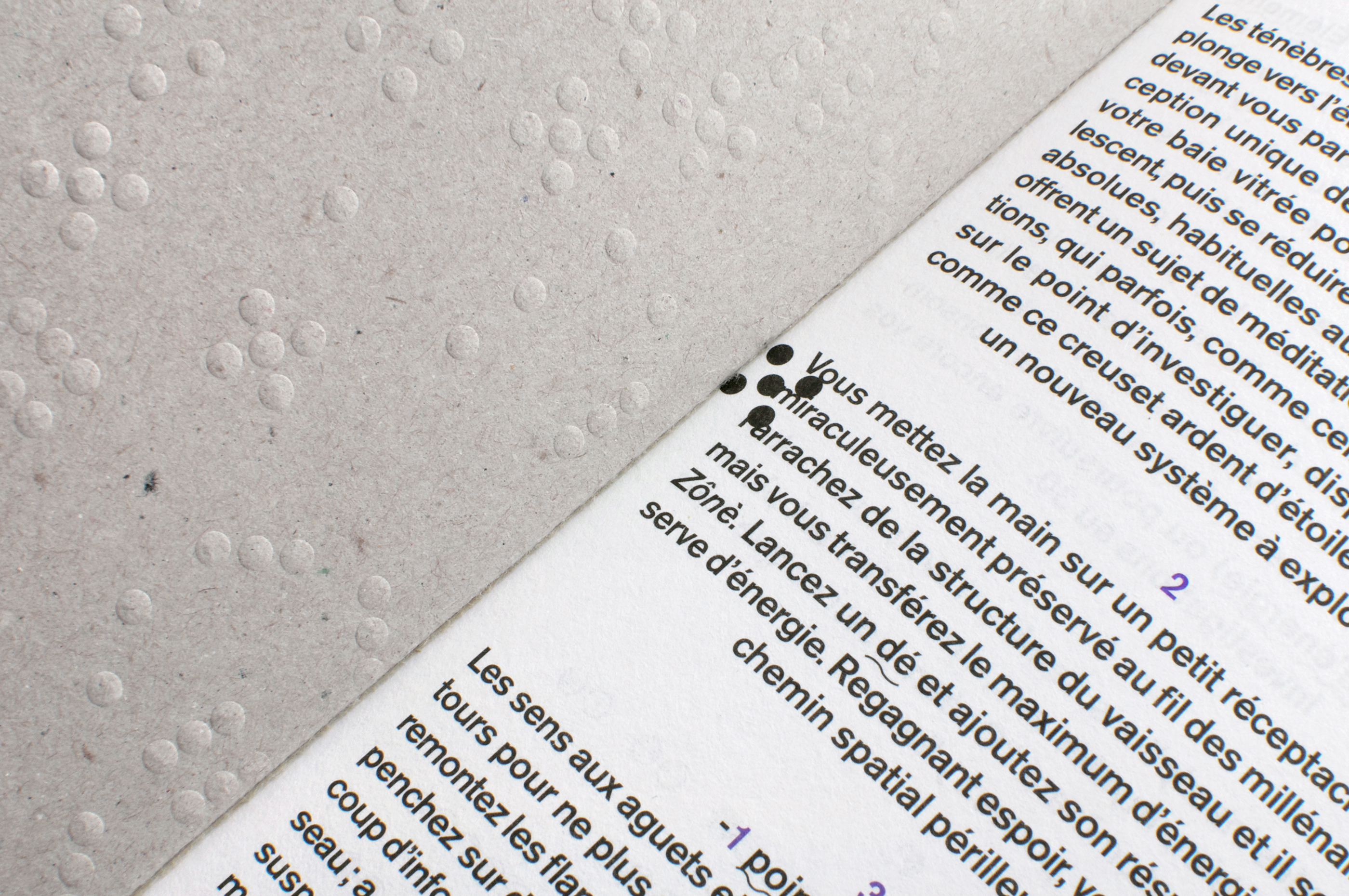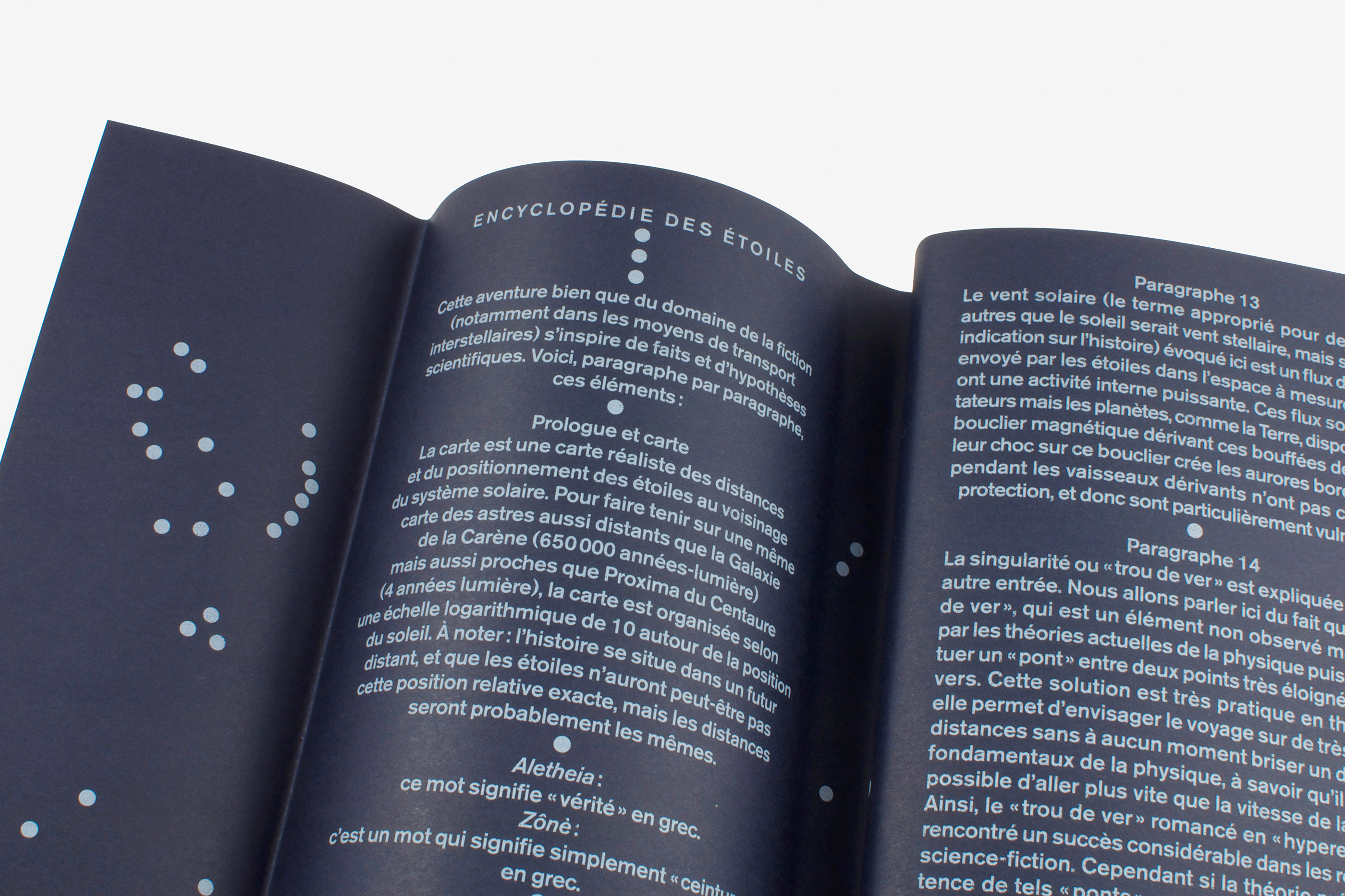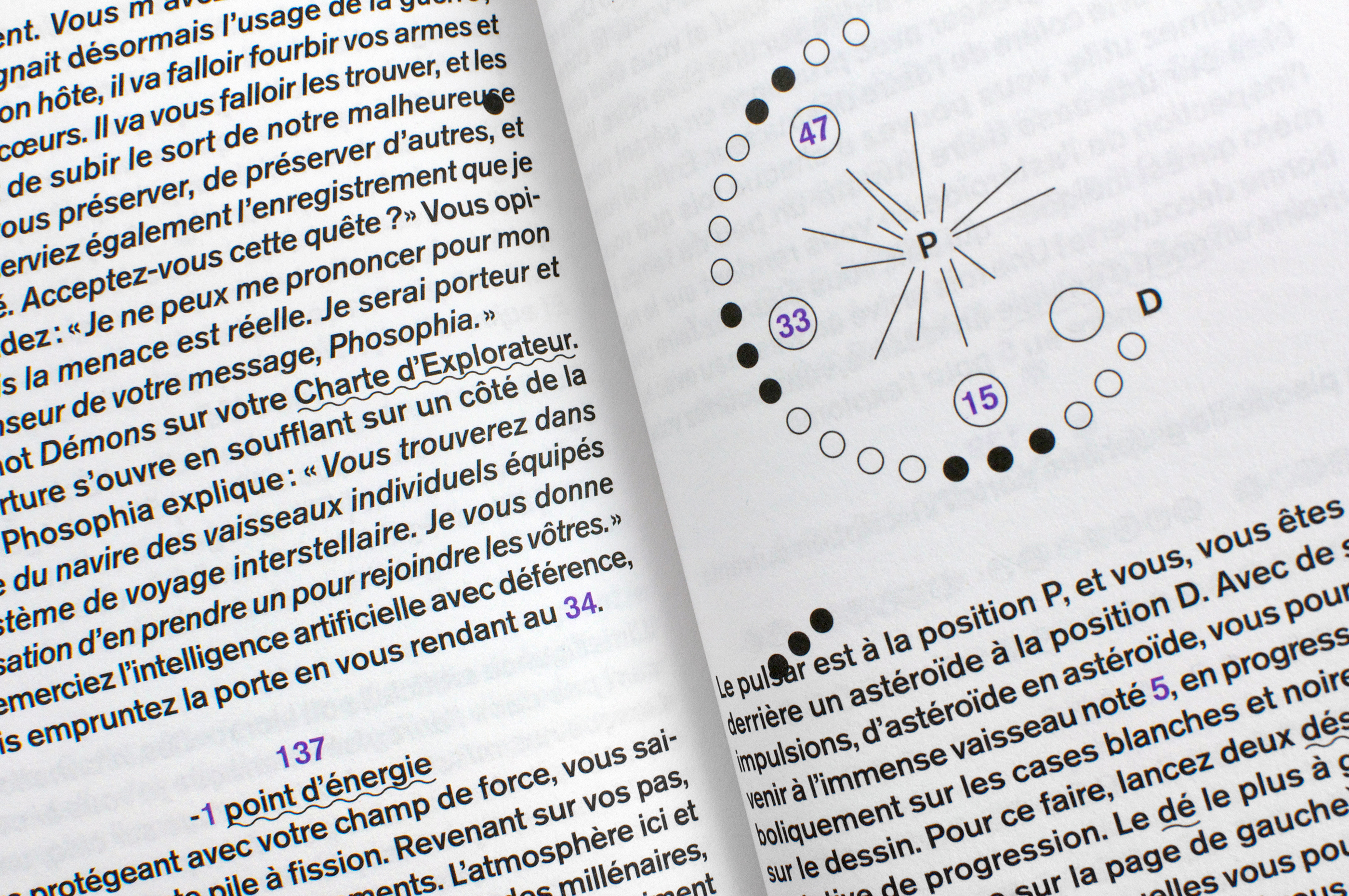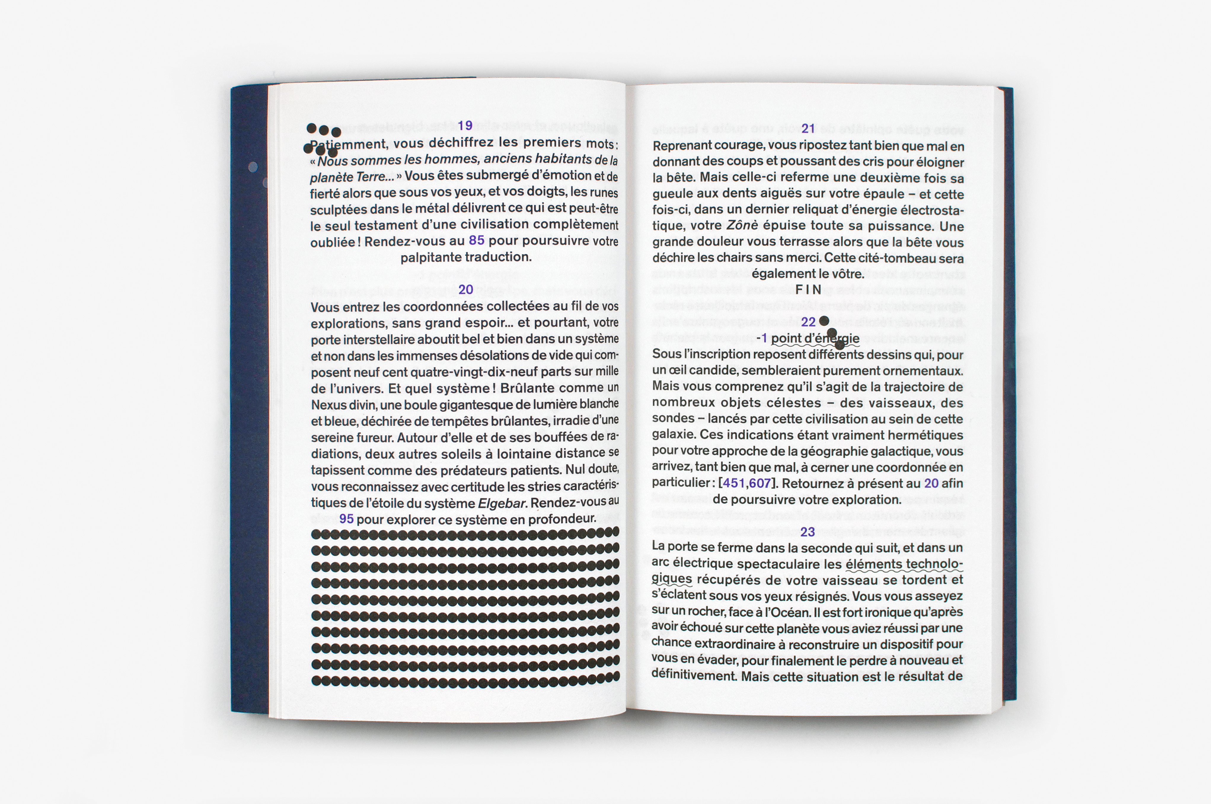 Ce livre dont vous êtes le héros cosmique, écrit par FibreTigre, vous transporte dans la peau d’un archéologue du futur enquêtant sur la disparition d’une civilisation. Il clôt la trilogie initiée en 2012 à la Villa Médicis, et explore (après Astronomicon et Dans la lune) l’espace du livre à la manière d’une cosmogonie. Il m’a plu ici de remettre en jeu les conventions de mise en forme très strictes des livres dont vous êtes le héros (LDVELH). Le livre à proprement parler, dont le format est basé sur la fameuse collection de LDVELH de Gallimard, comprend le texte en noir et les chiffres en violet. Les paragraphes se succèdent et la mise en page est rudimentaire. Chaque page comprend un dé («jeté» aléatoirement sur le texte ou dans les marges), dont on peut se servir comme un outil pour avancer dans le jeu, en prenant une double page au hasard. Des points du même diamètre servent à combler les espaces libres en pied de page (les LDVELH ayant toujours horreur du vide!). La typographie cryptée (dessinée avec Marine Benz), ainsi que les schémas énigmatiques qui constellent le livre sont aussi basés sur ce même diamètre de point. La somme visuelle de tous les dés contenus dans l’ouvrage sont gaufrés sur le carton brut en 2e et 3e de couverture, à la manière d’un motif. Autour du livre est placée une jaquette, appelée Encyclopédie des étoiles, qui comprend un plan ainsi qu’un éclairage scientifique sur les articles du jeu. Cette jaquette de 12 pages se déploie à la manière d’un «livre autour du livre», comme un espace augmenté. Elle est imprimée en encre blanche sur papier noir bleuté, dans une mise en page strictement identique au livre, à cette différence que les points figurent ici des constellations dans les marges, ou bien comblent les espaces vides en ordonnées (en non en abscisses). Les cartes qui agrémentent l’ouvrage, numérotées à la façon de grands dés cosmiques, nous accompagnent (en 6 étapes) dans le jeu.