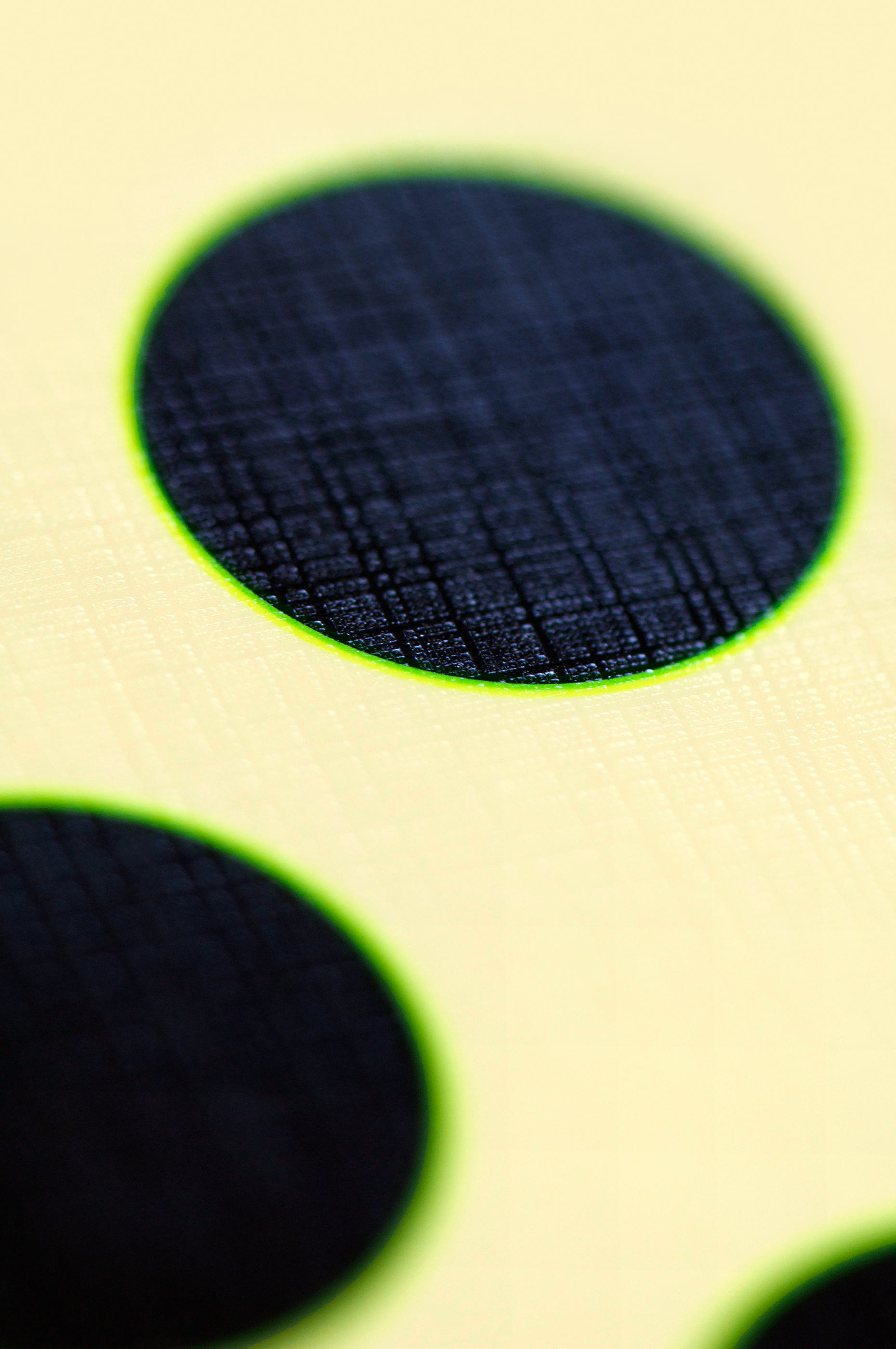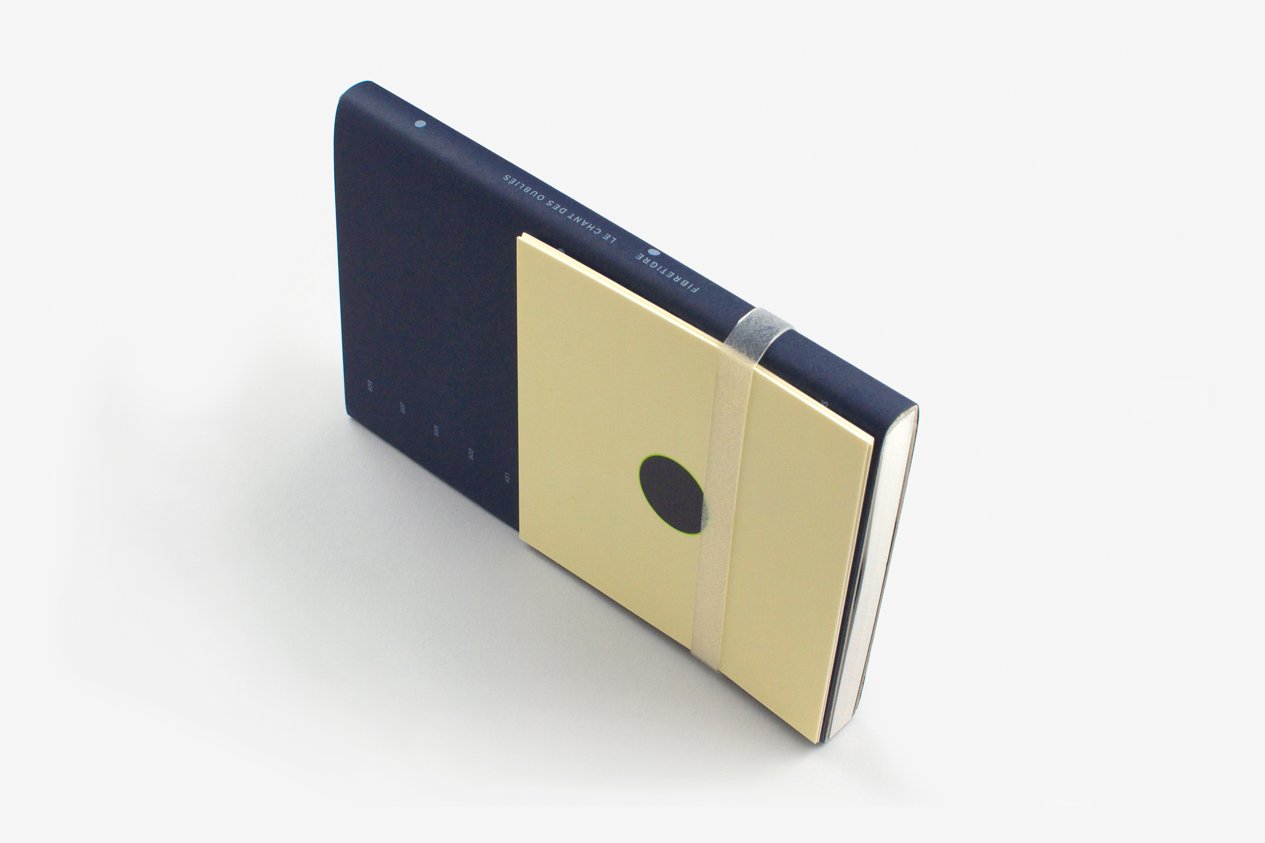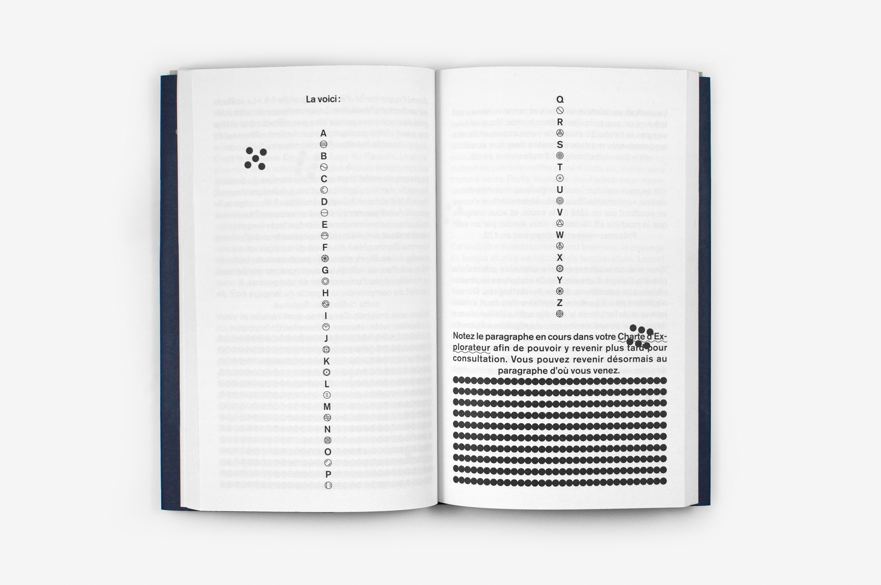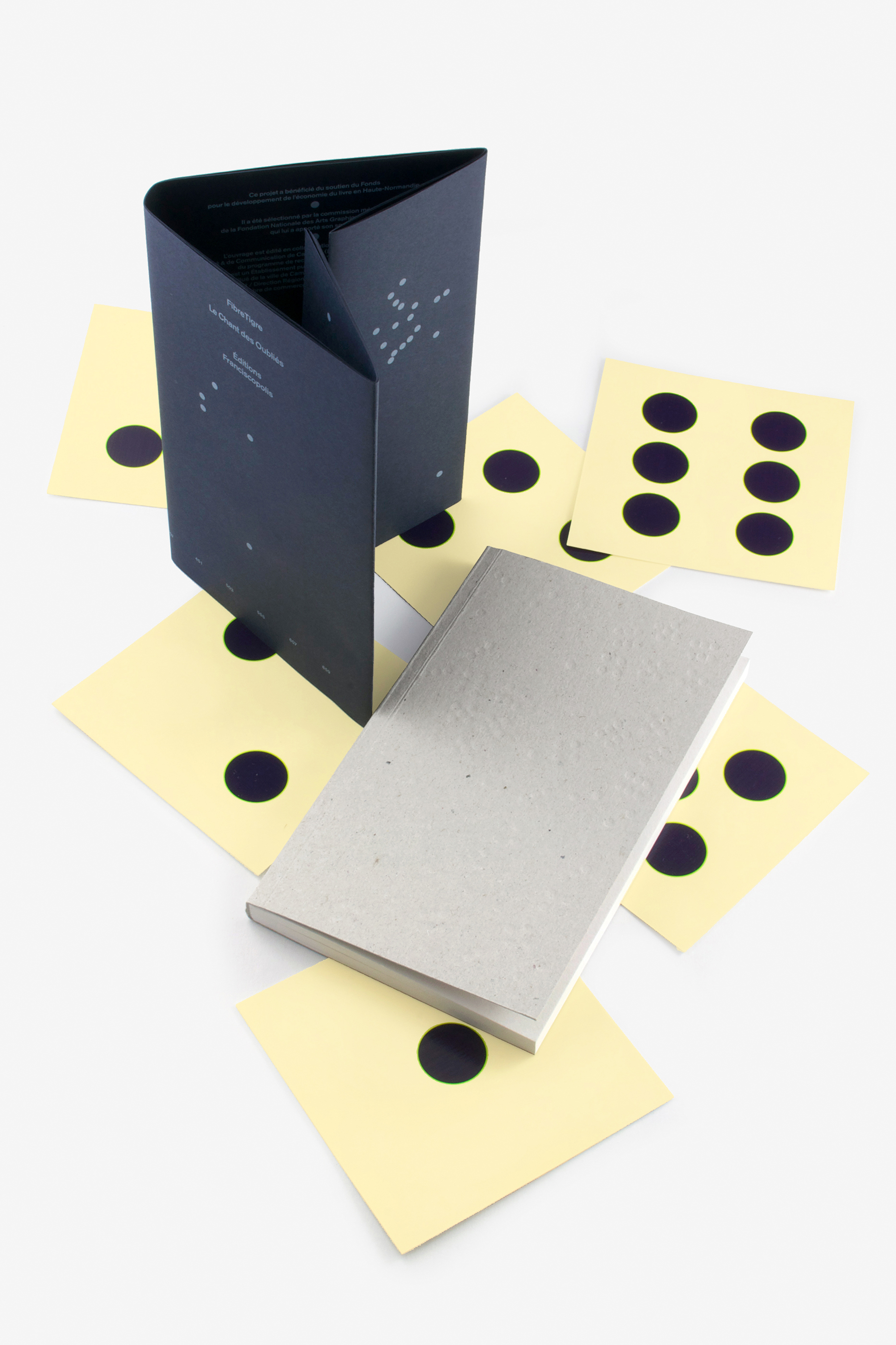 In this book written by FibreTigre you are the hero; you take on the character of an archaeologist from the future investigating the disappearance of a civilisation. It is the last of a trilogy begun in 2012 at the Villa Medici in the French Academy in Rome. It follows on from Astronomicon and Dans la lune in an exploration of the space of a book in the same way as the space of the cosmos. Here I was interested in experimenting with the very strict layout rules required for a LDVELH (Livre Dont Vous Êtes Le Héros – Book in which you are the hero). The book itself, its format based on the famous series published by Gallimard, has a text in black with numbers in violet. The paragraphs follow on from one another, the page layout being very simple. Each page has a die (“thrown” at random onto the text or into the margin) which can be used as a tool to move forward in the game, choosing any double page. Dots of the same size are used to fill up the empty spaces at the bottom of the pages (LDVELHs abhor a vacuum!). The typeface in code and the mysterious diagrams that punctuate the book are also based on the same diameter as the dots. Echoing the dot motif, all the dice faces featured in the book appear in relief on the inside front and back covers made of unbleached cardboard. The book is encased in a 12-page jacket entitled “Encyclopaedia of the Stars with a map and a scientific explanation of the rules of the game. This jacket is arranged as a “book around the book”, as an extension. Printed in white ink on blue-black paper, it has a layout exactly matching that of the book, the only difference being that here the dots represent constellations in the margins or else fill the empty spaces vertically (and not horizontally). The cards that go with the book, numbered like giant cosmic dice, accompany us (in six stages) in the game.