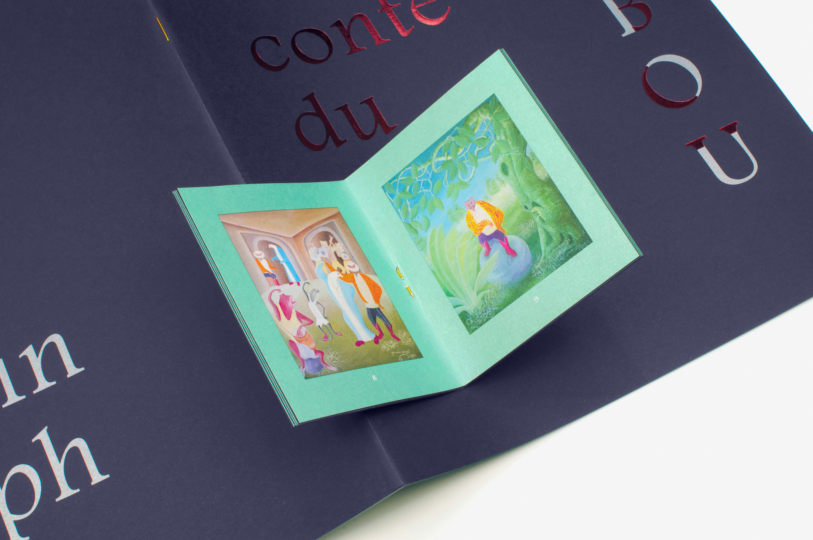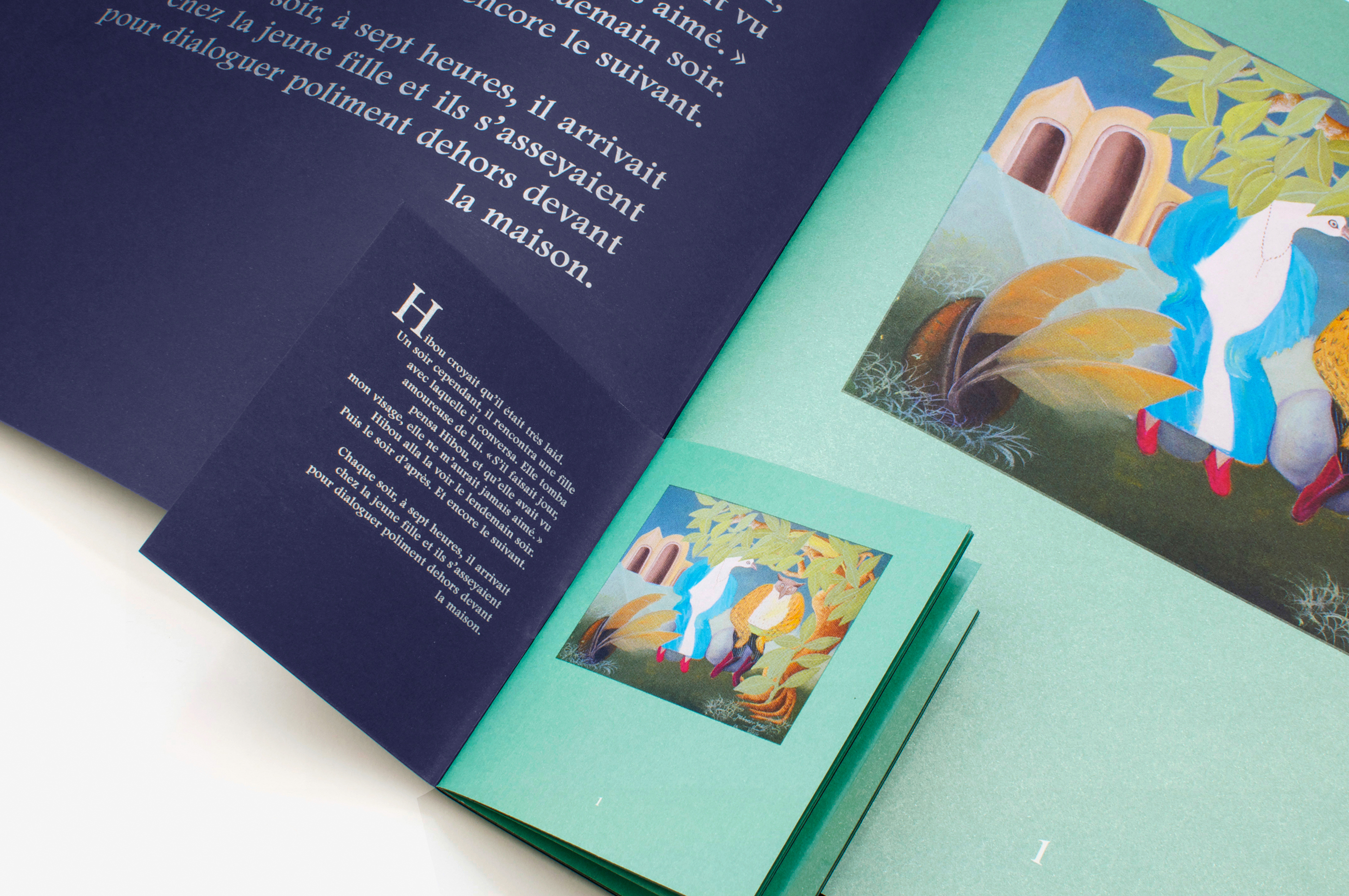 The Facim Foundation invited me to design and print this storybook, written and illustrated by Haitian artist Jasmin Joseph. I was asked to create two versions: the book itself, and a free publication for children with fun activities. My solution to the question of a format that would meet this requirement was original and purely material. The result was a dual version of Le Conte du hibou, the two parts bound together but distinguished by different formats. The layout is dictated by the unusual requirement to scale down by one third. The reader is drawn into the story by the dark nocturnal colours that provide a background for the artist's illustrations.