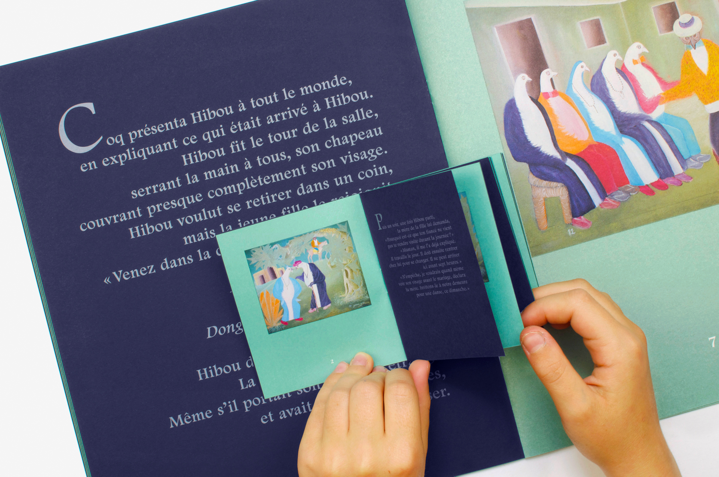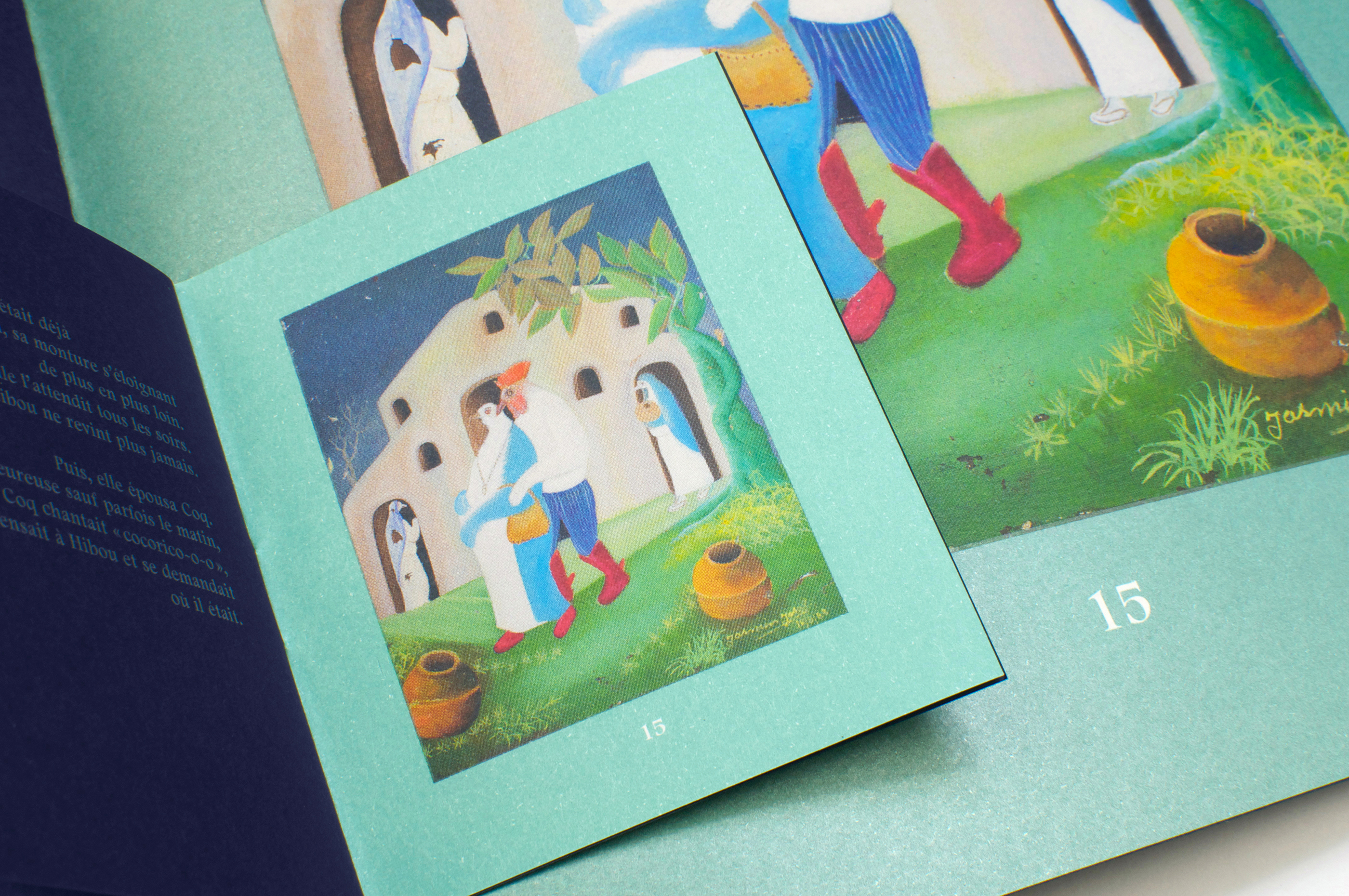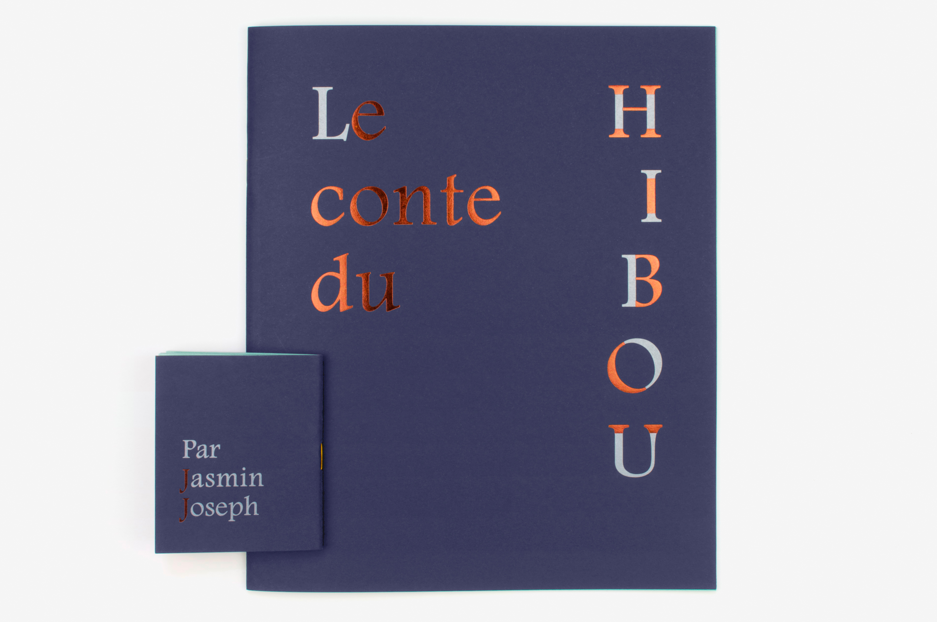 La fondation Facim m’a confié la conception éditoriale et graphique de ce livre de contes, écrit et illustré par l’artiste haïtien Jasmin Joseph. J’ai dû imaginer deux éditions en parallèle: d’une part, le livre à proprement parler, et d’autre part, une publication ludique et gratuite pour les enfants. J’ai répondu à cette contrainte par une équation originale, purement matérielle, liée à la question du format. Ainsi, Le Conte du hibou existe dans deux versions, imprimées en amalgame mais qui induisent par leurs formats un statut différencié. La mise en page répond à la contrainte inédite de la stricte homothétie de 1/3. L’immersion sensible dans l'histoire est facilitée par la couleur, dont le spectre nocturne constitue un écrin pour les peintures de l’artiste.