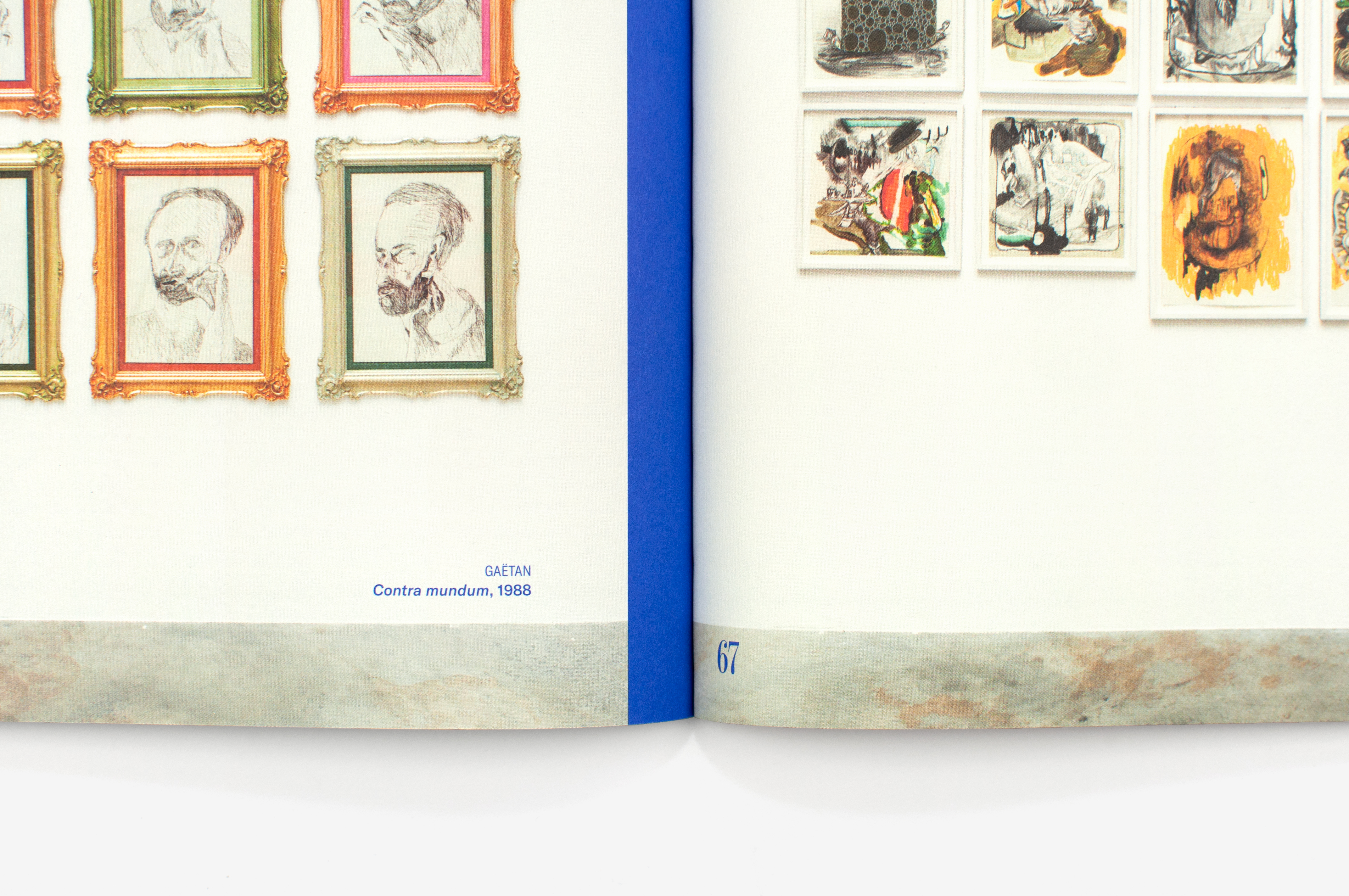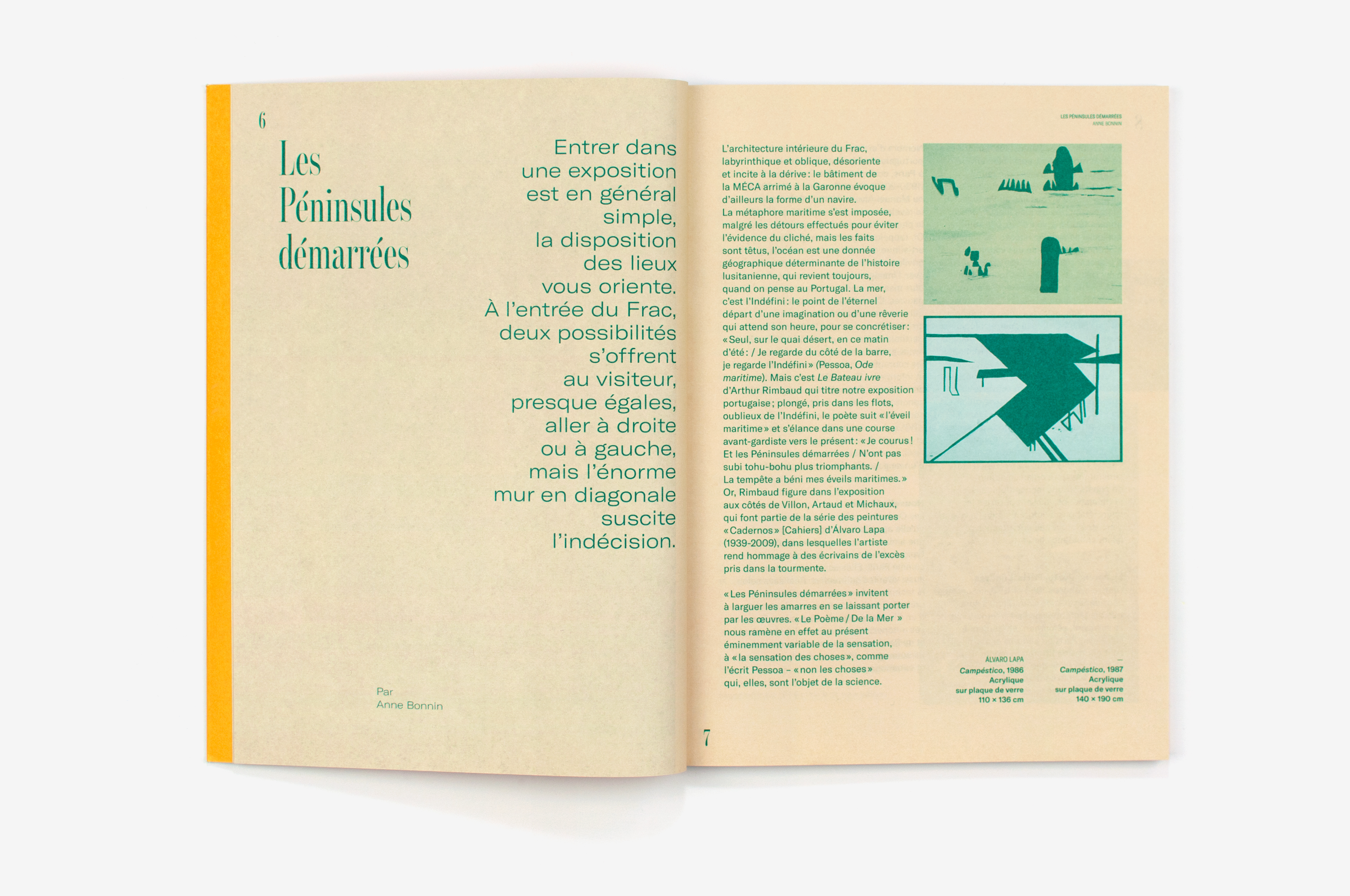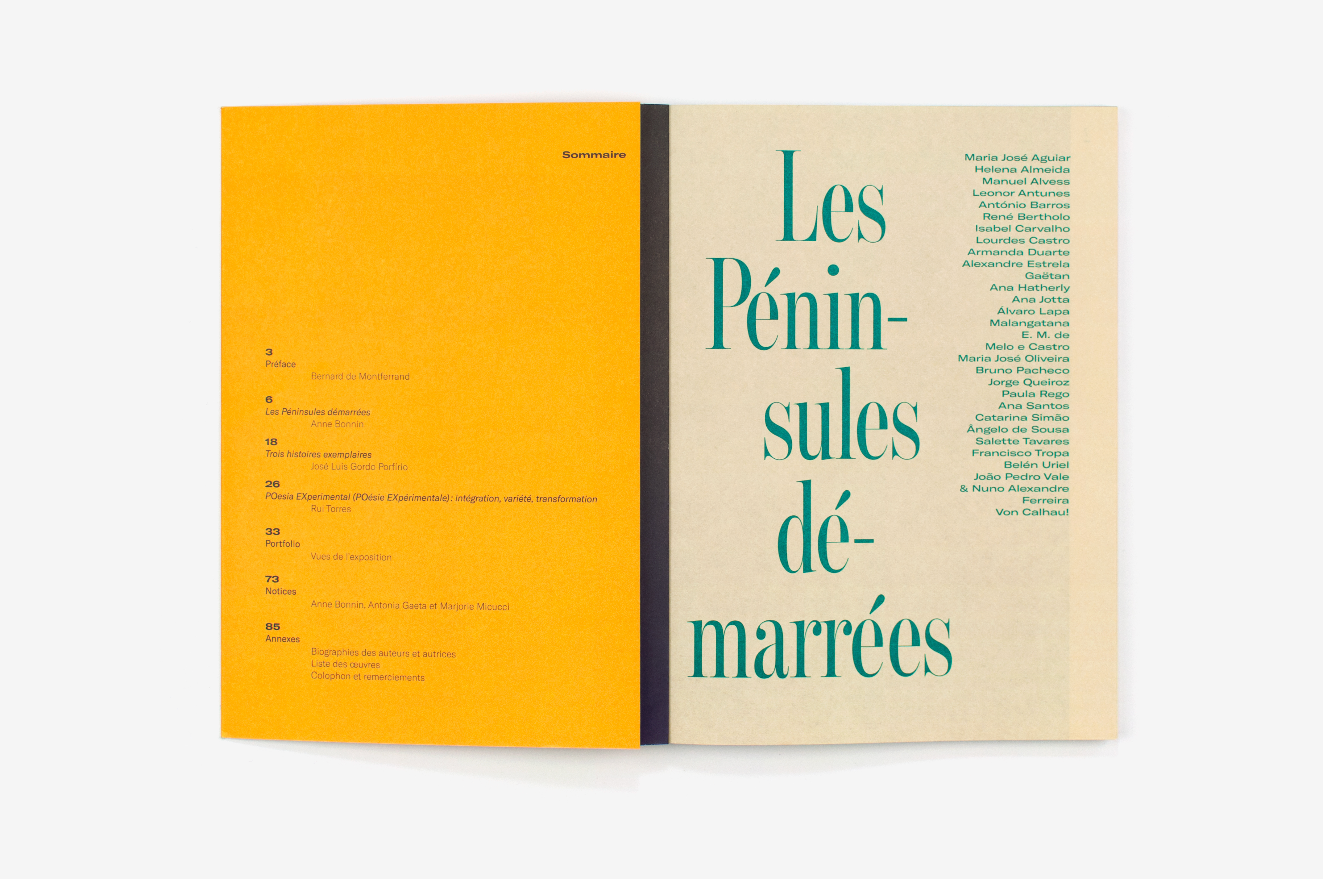 This exhibition conceived by Anne Bonnin presented an overview of Portuguese art from the 1960s to the present day The contrasting colour range of the exhibition catalogue is inspired by Portugal, and the typefaces (condensed or extended) evoke the literary magazines shown in the exhibition. On the cover, the layout of the title (taken from Rimbaud’s poem Le bateau ivre) juxtaposes the French and Portuguese words, split with hyphens. The flexible covers of the book allow the hot-stamped gold letters of the Portuguese title to shimmer.