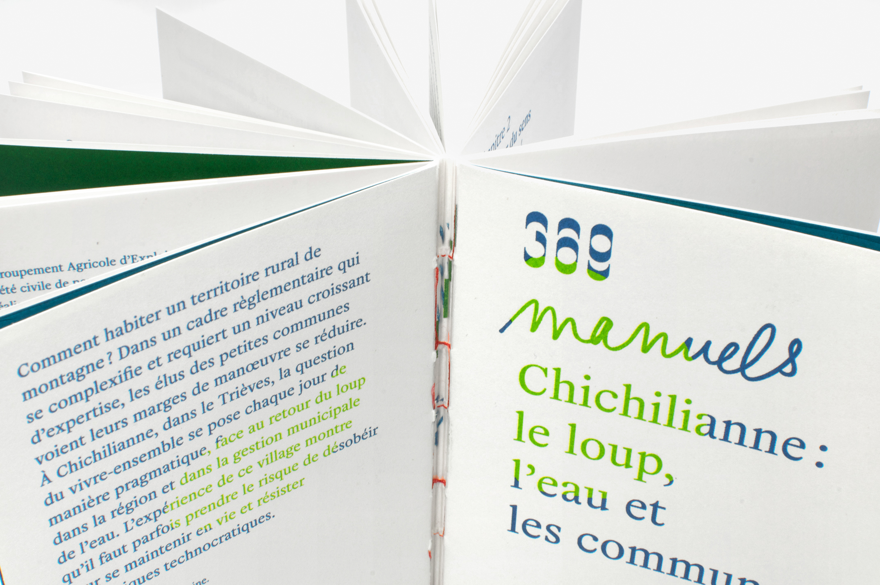 Cette première collection de livres éditée par 369 retrace des expériences collectives qui répondent aux bouleversements de notre société. Conçus sous la forme d’une enquête de terrain, ces Manuels sont enrichi par des ressources pratiques et des dessins. Les ouvrages, dans leurs forme, sont modestes: sans couverture, petit format, un seul papier, reliure apparente. Une jaquette transparente compense l’absence de couverture et autorise un dos typographique. Ils sont imprimés en bichromie: la première couleur, plus foncée, joue le rôle d’écrin; la seconde, plus vive, vient éclairer les informations à valoriser (titres, citations, détails dessiner, etc.). Ces zones de couleurs, définie de façon brute, permettent une mise en relief du contenu et une circulation libre dans l’ouvrage. La couleur est ici utilisée comme un outil, mis en œuvre manuellement. La typographie Helvetius (205TF), au classicisme singulier, est mise en page très simplement: elle contrebalance cet usage singulier de la couleur.