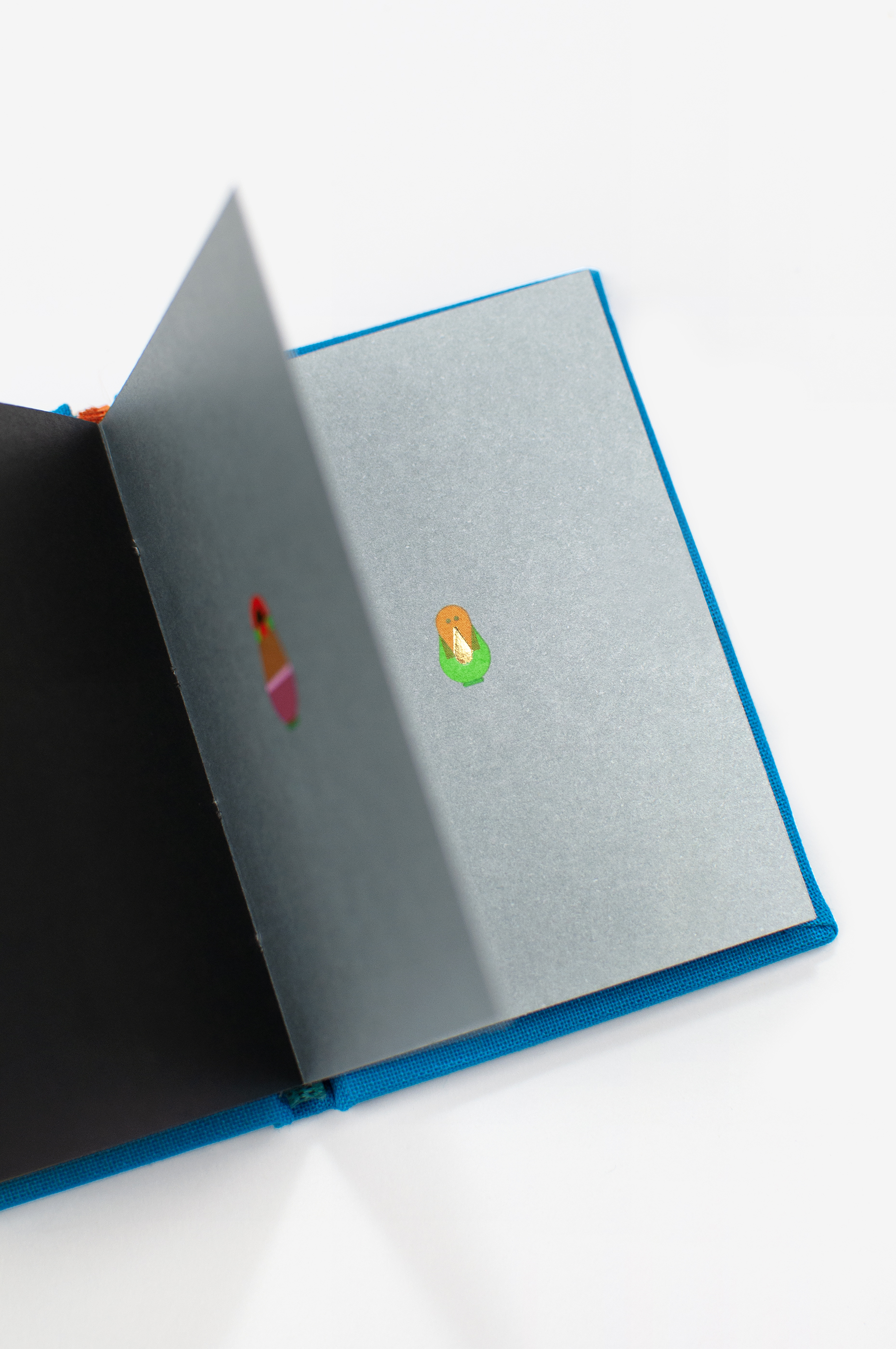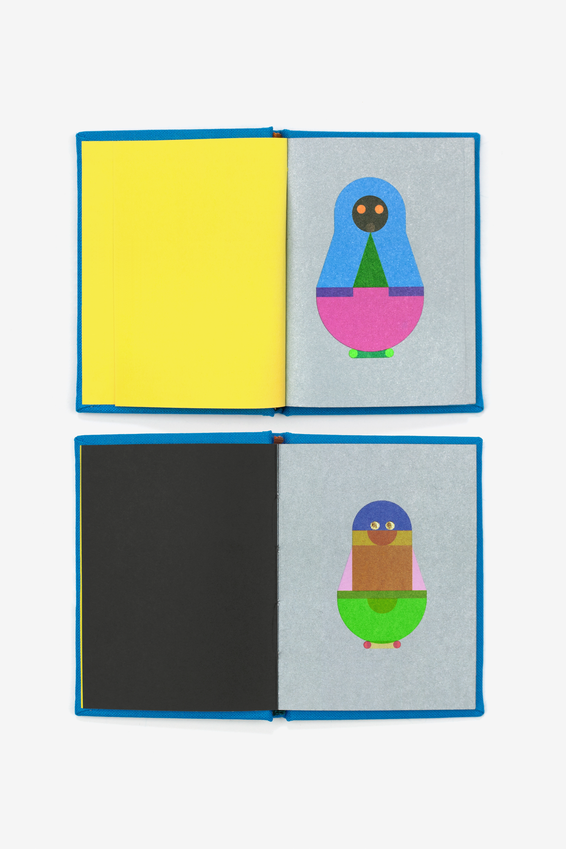 Matriochka is a small book that tells a very short, but very intricate story. 16 dolls shrink from page to page, the last one measuring only a few millimeters high. Fanette Mellier invites us to explore this multicolored family in microscopic detail. Observed under a magnifying glass, the ordinarily imperceptible details of the printing become the motifs that cover the tiny figurines. This book, in which hot gilding skips a generation, speaks of singularity and transmission.