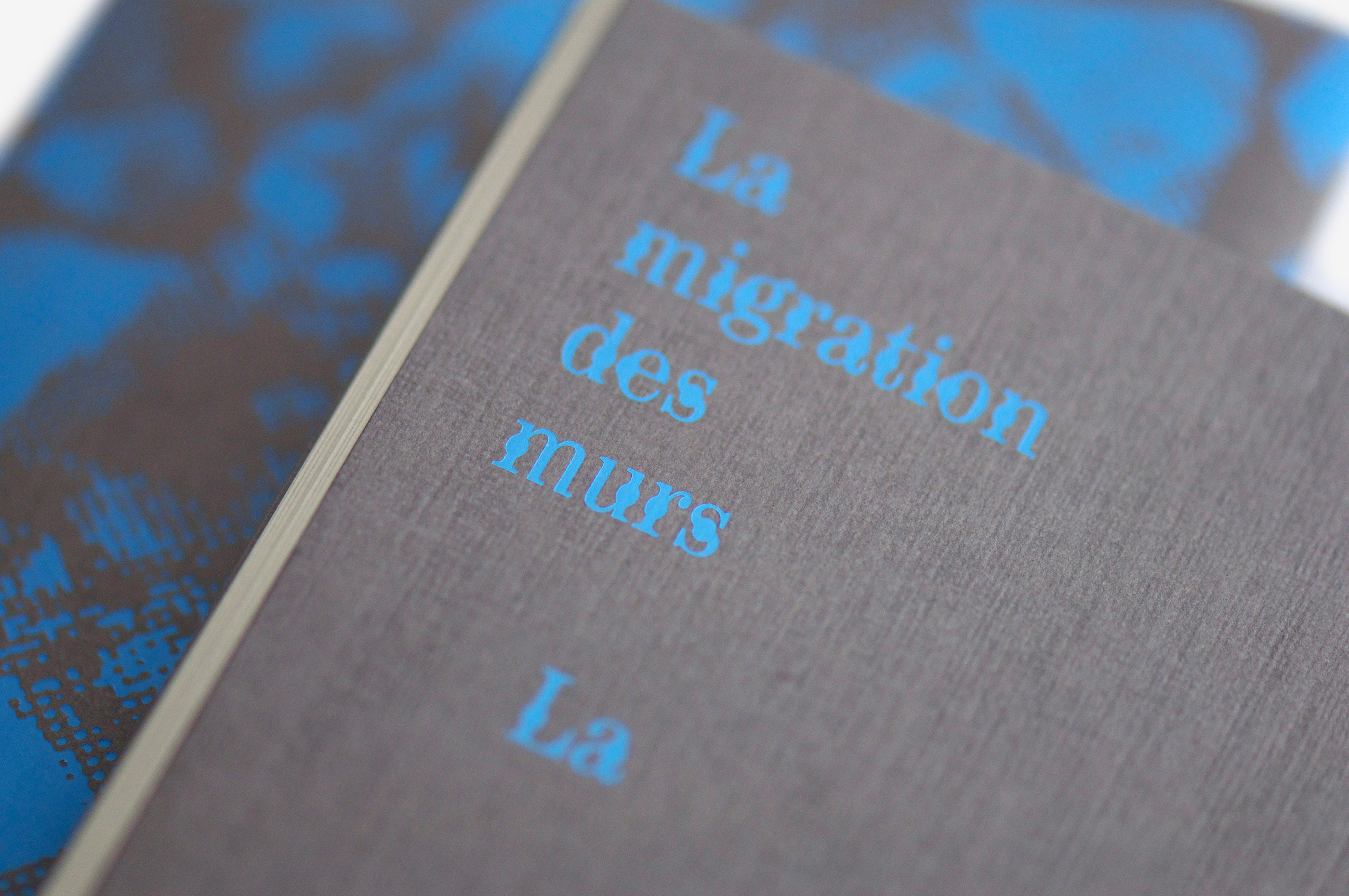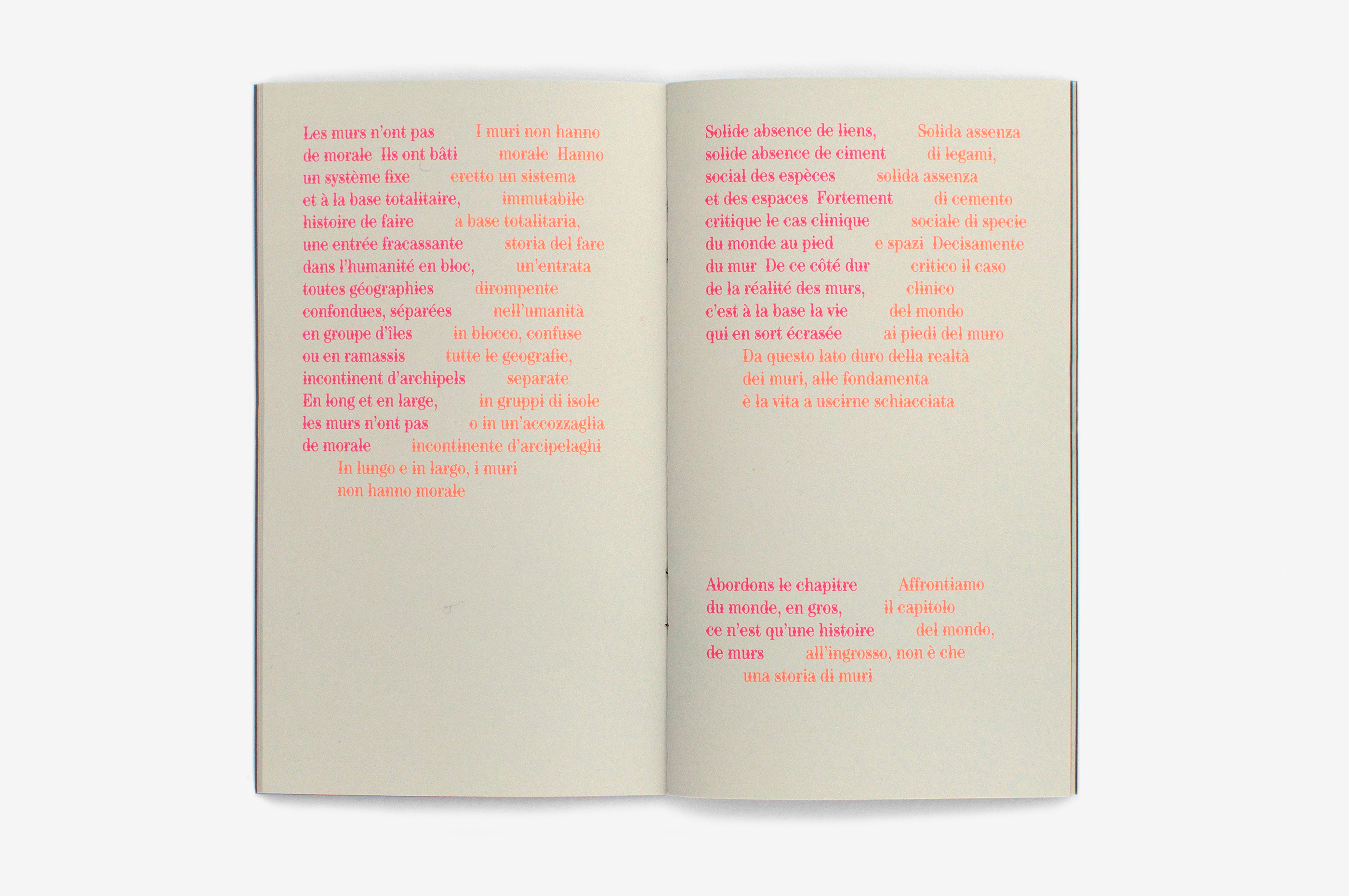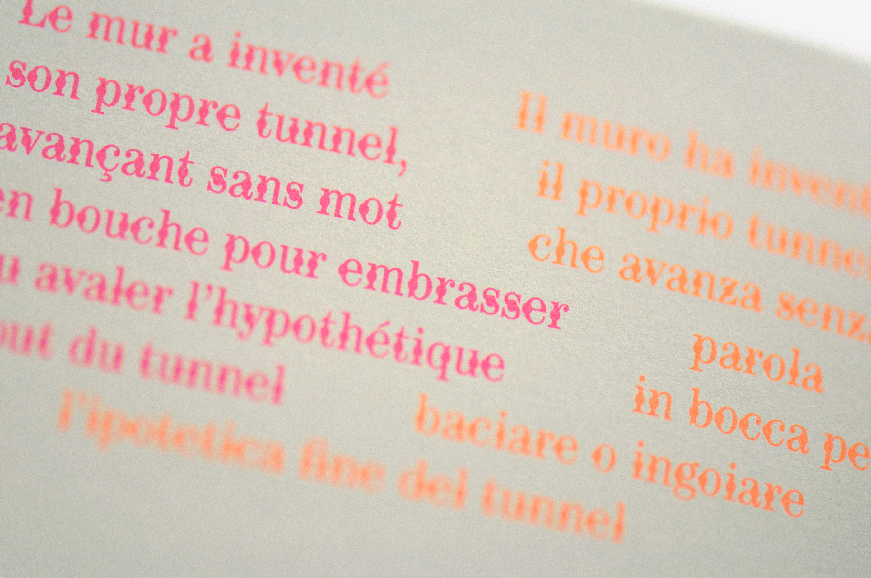 Ce livre est un recueil de poésie, un objet clos en écho à la thématique des murs. Le recueil a été écrit de façon quasi prémonitoire par James Noël juste avant l’effondrement d’un des murs de la Villa Medicis. Les résidus du mur écroulé figurent sur la double couverture. Le texte est enserré entre ces deux couvertures assez rigides; le livre s’ouvre seul et cela constitue de fait un appel vers l’intérieur. Le texte français, ferré à gauche, cohabite avec sa traduction en italien, avec une sorte de fissure entre les deux langues. La langue italienne est adossée typographiquement à la langue française, dans la logique du processus de traduction, la langue originale constituant le pilier de l’autre. Les fissures sont formées par le rythme des mots. J’ai modifié la typographie Century en plaçant des petits ronds au centre de la lettre, ce qui créé une continuité visuelle, comme une enfilade de perles, propre à l’écriture poétique. Le choix des matières est lié à la question des murs de pierre et murs romains: les encres fluorescentes évoquent la signalétique des chantiers, et les graffs qui s’inscrivent souvent en contraste avec la pierre. L’écriture de James Noël possède une énergie particulière, qui appelle la lumière, présente ici dans les encres et le bleu ciel estampé sur la couverture.