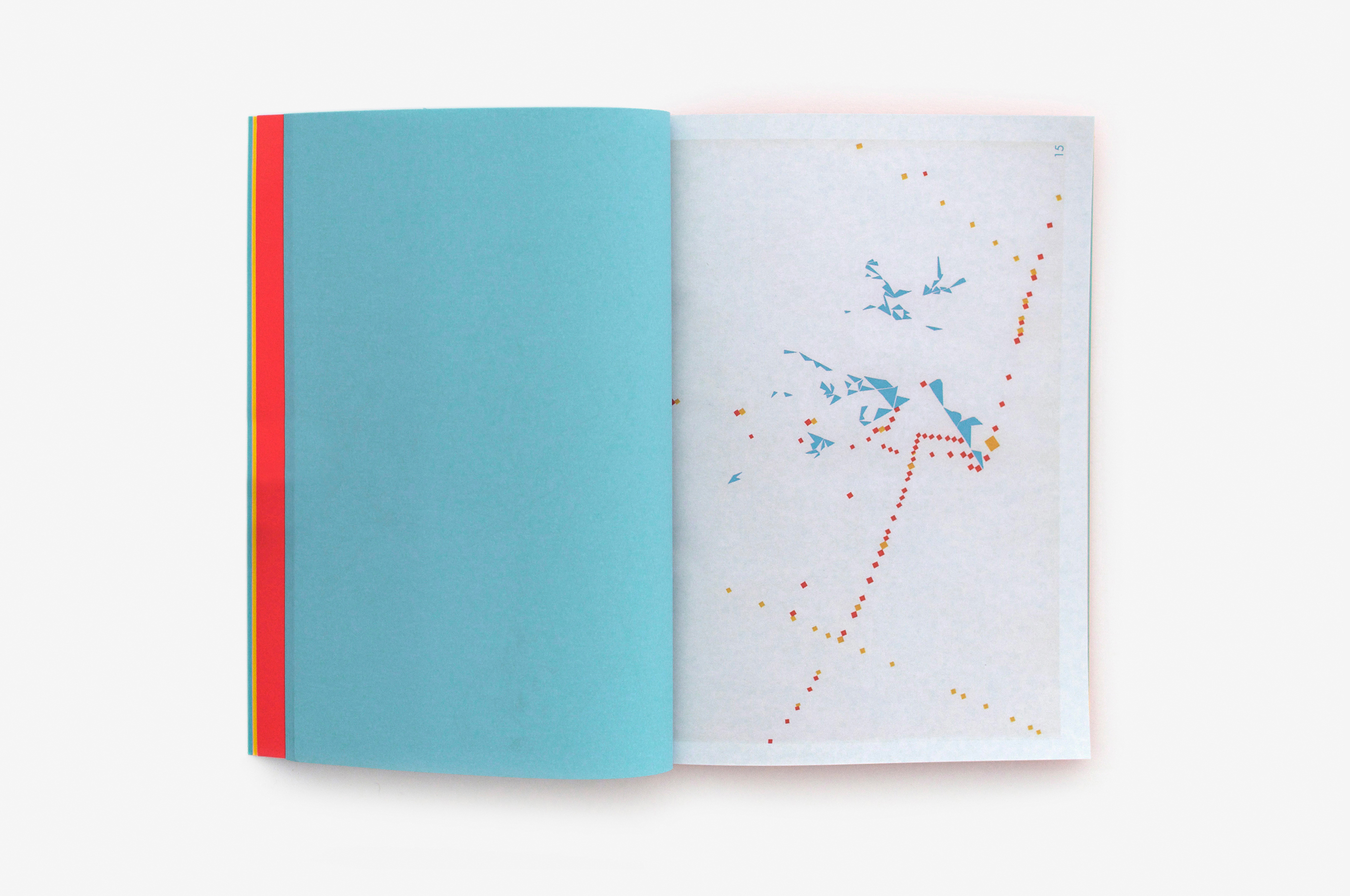 Mix is a joint project between a visual artist, a writer and a graphic designer. Working with Laurence Lagier’s drawings and photographs related to networks and temporality, Brice Matthieussent wrote a fiction: Lomo reticulens. I worked around all of these elements to design the book, articulating spot colors for this book made with 6 hands. The book is printed on poster paper, the front of which is literally painted in blue, yellow and red. The three-color printing matches the colors of those specific papers and offers the work to the viewer through this strange spectrum. The covers follow each other, gradually revealing the title. Color defines the entire book, in its organization, its ink, its materiality, and offers the content throughout its bright prism.
