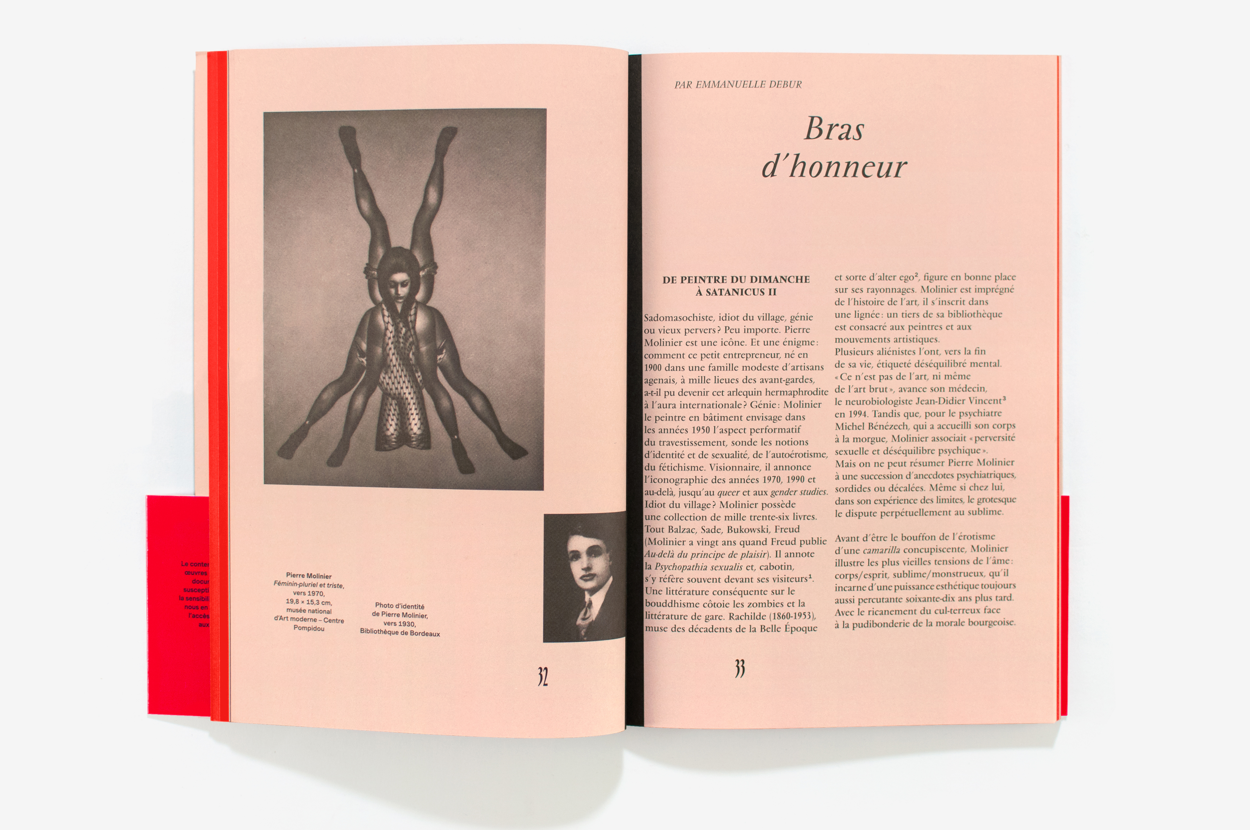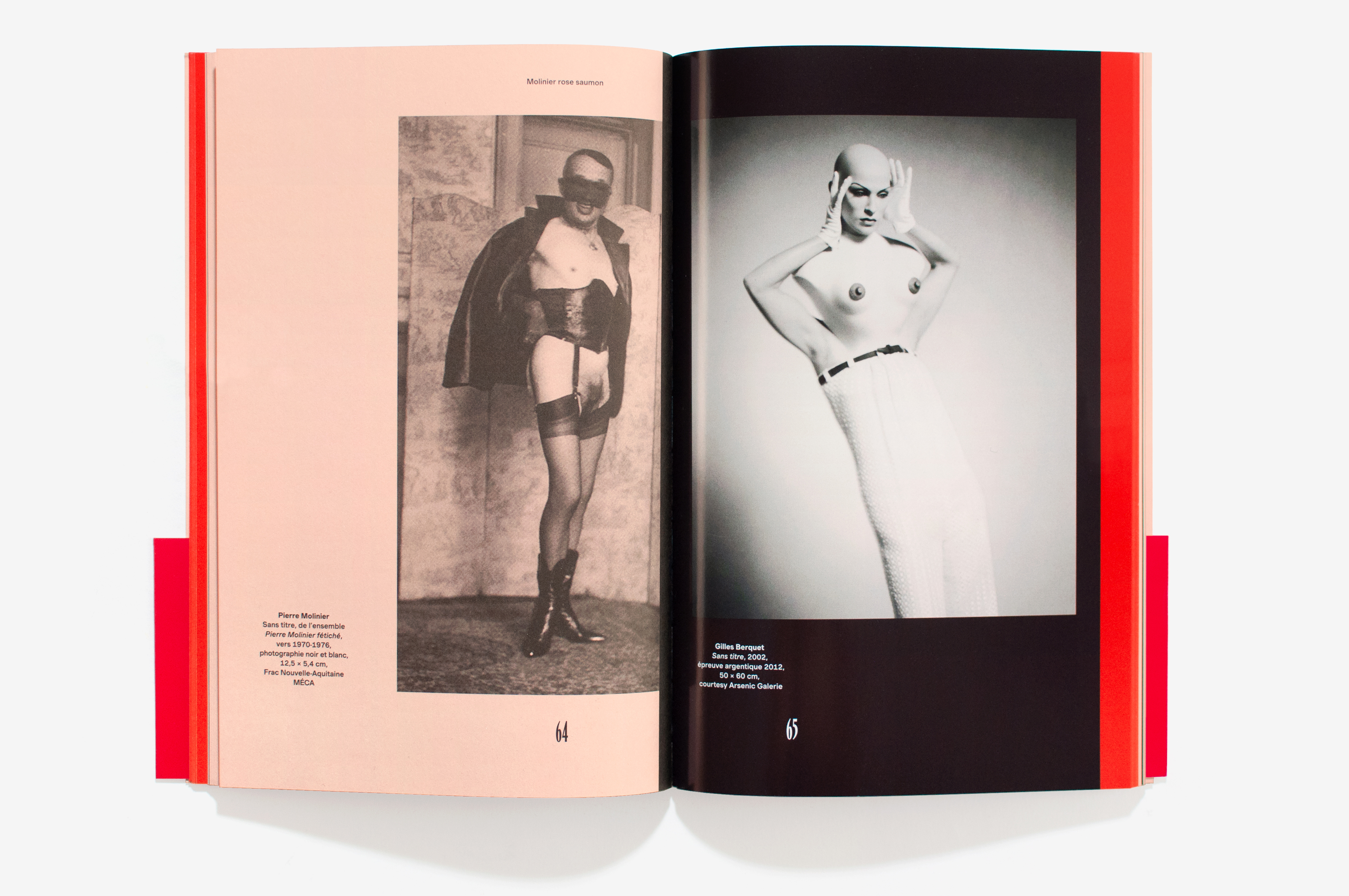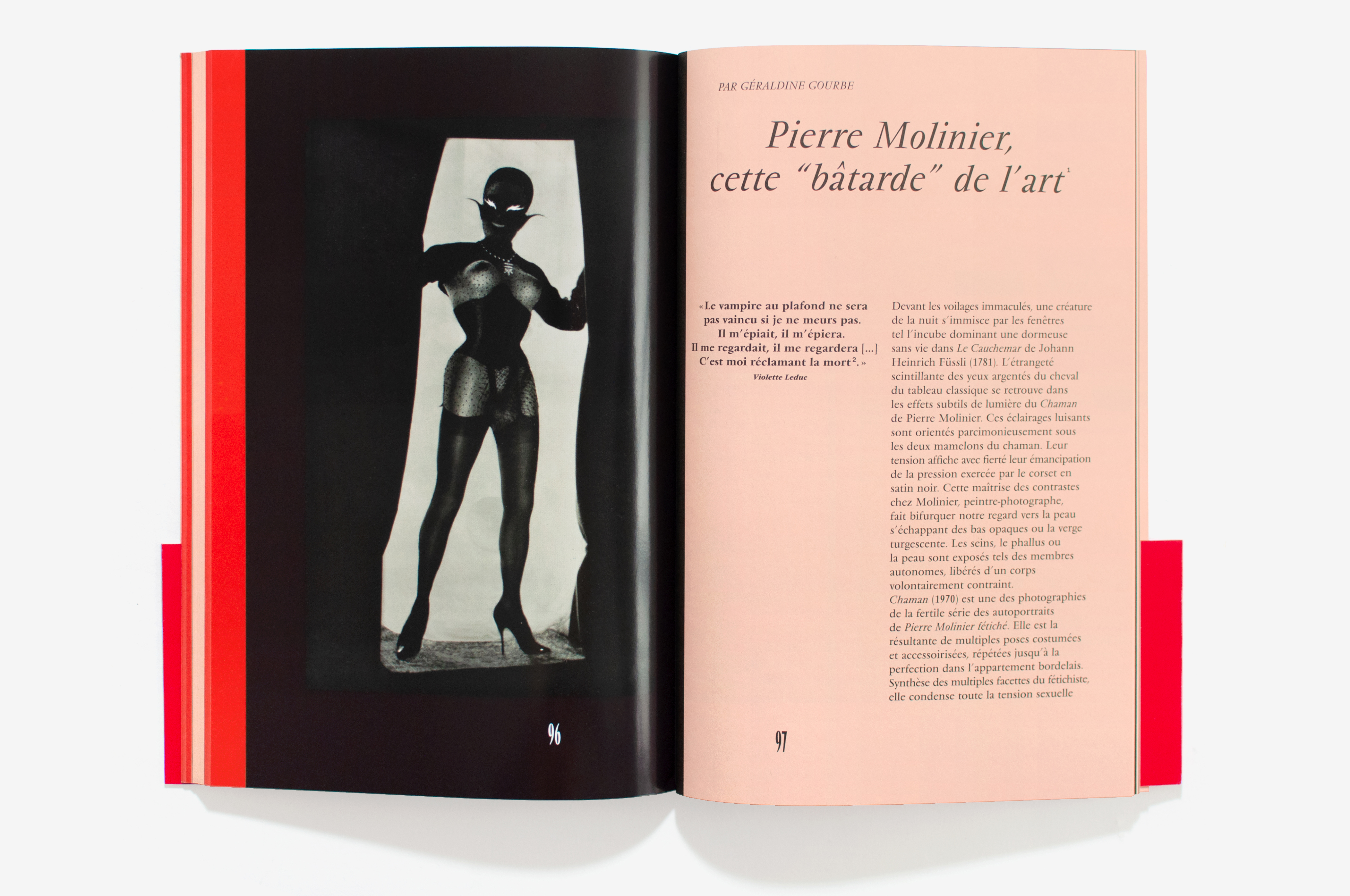 Ce catalogue a été publié à l’occasion d’une exposition présentée au Frac Méca. L’œuvre de Pierre Molinier y est mise en regard avec des œuvres contemporaines conçues dans le sillage de cet artiste sulfureux. Le bandeau rouge en couverture donne à lire le titre de façon heurtée, et joue le rôle d’avertissement visuel. La première page du livre nous invite à monter l’escalier d’un hall étrange, dont les murs avaient été peints par Pierre Molinier (alors peintre décorateur). Ses œuvres sont ensuite déployées sur papier glacé, an alternance avec des parties plus documentaires imprimées sur un papier rose saumon. Un cahier à part présente les œuvres de ses disciples artistiques. La typographie Vendôme, contemporaine de l’émergence de son œuvre, y répond par son dessin incisif, contrasté.