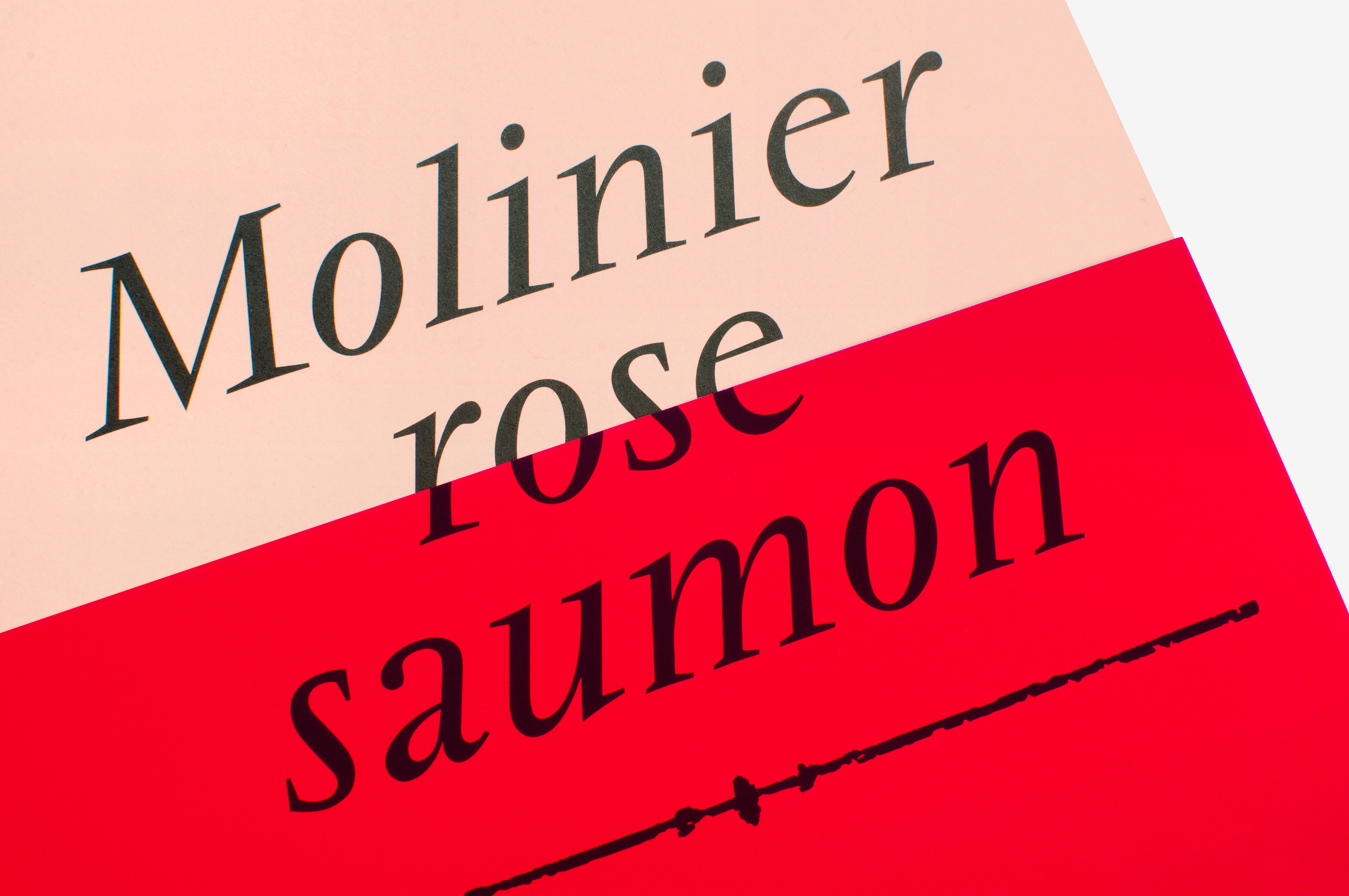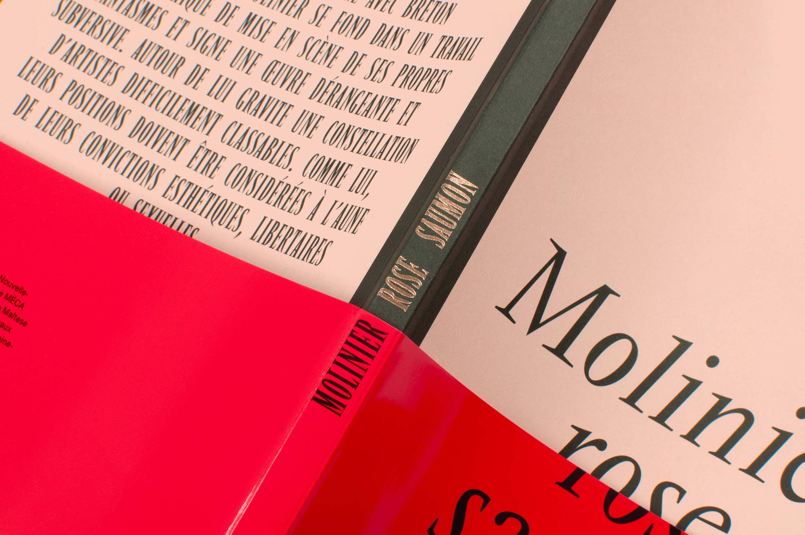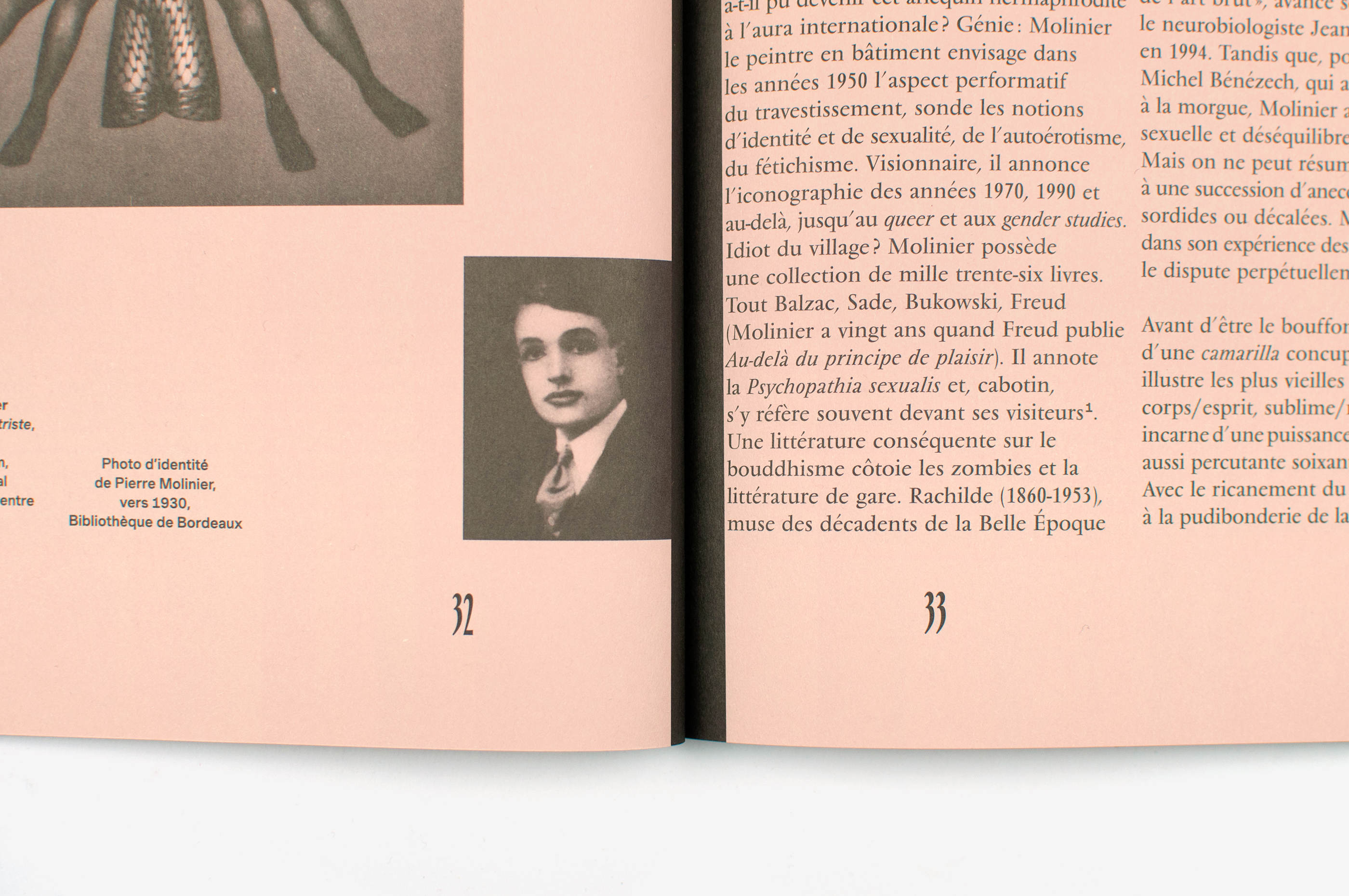 Ce catalogue a été publié à l’occasion d’une exposition présentée au Frac Méca. L’œuvre de Pierre Molinier y est mise en regard avec des œuvres contemporaines conçues dans le sillage de cet artiste sulfureux. Le bandeau rouge en couverture donne à lire le titre de façon heurtée, et joue le rôle d’avertissement visuel. La première page du livre nous invite à monter l’escalier d’un hall étrange, dont les murs avaient été peints par Pierre Molinier (alors peintre décorateur). Ses œuvres sont ensuite déployées sur papier glacé, an alternance avec des parties plus documentaires imprimées sur un papier rose saumon. Un cahier à part présente les œuvres de ses disciples artistiques. La typographie Vendôme, contemporaine de l’émergence de son œuvre, y répond par son dessin incisif, contrasté.