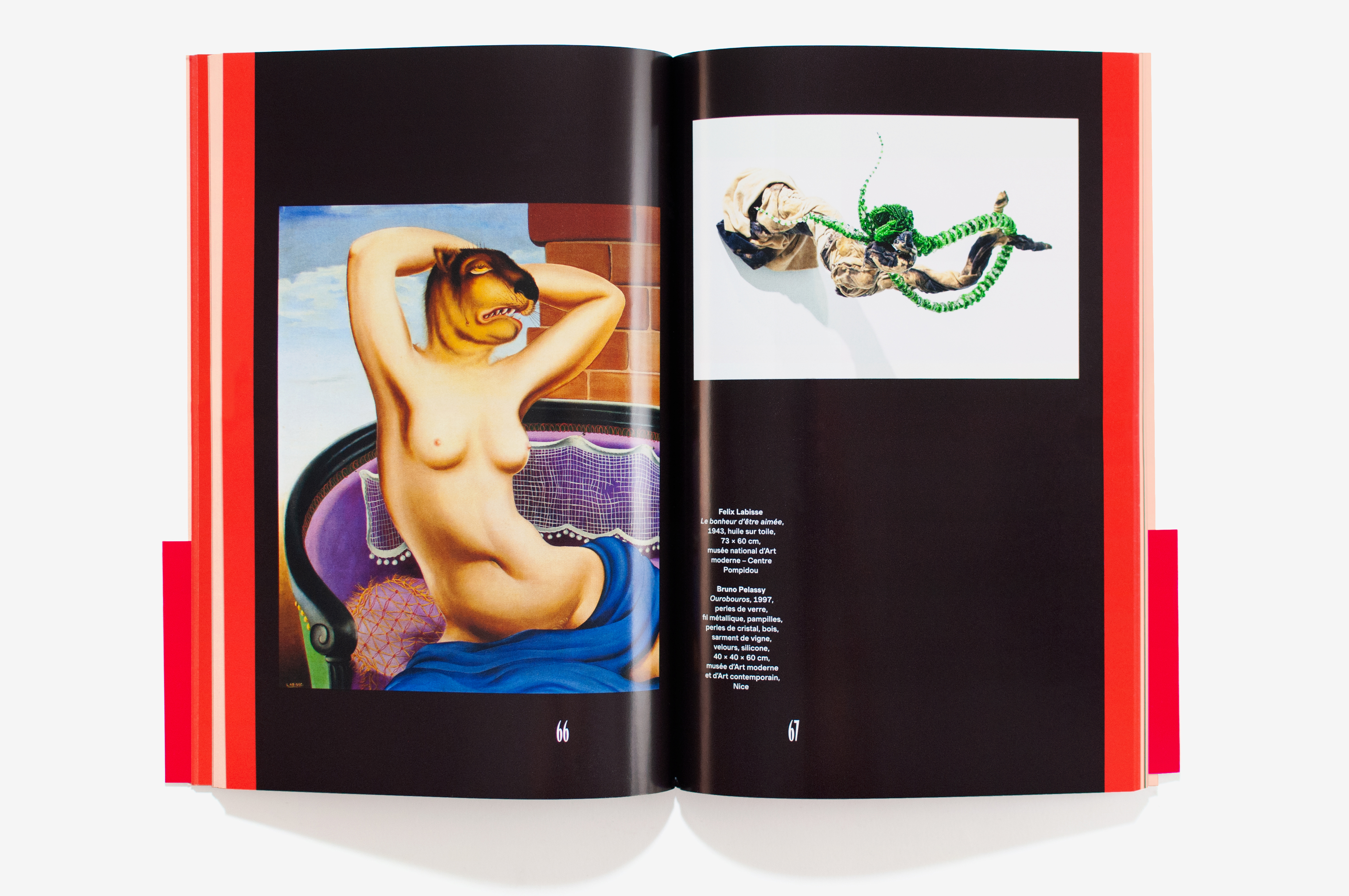 This catalogue was published on the occasion of an exhibition presented at Frac MÉCA. Pierre Molinier’s work is juxtaposed with contemporary works following on from this controversial artist. The red banner on the cover spells out the title in a disjointed way, and acts as a visual warning. The first page of the book invites us to climb the stairs of a strange hall, the walls painted by Pierre Molinier (at the time a painter and decorator). His works are then displayed on glossy paper, alternating with more documentary sections printed on salmon-pink paper. A separate booklet presents the works of his artistic disciples. The use of the Vendôme typeface, created at the same period as Molinier’s earlier work, reflects the artist’s work in its incisive clarity.